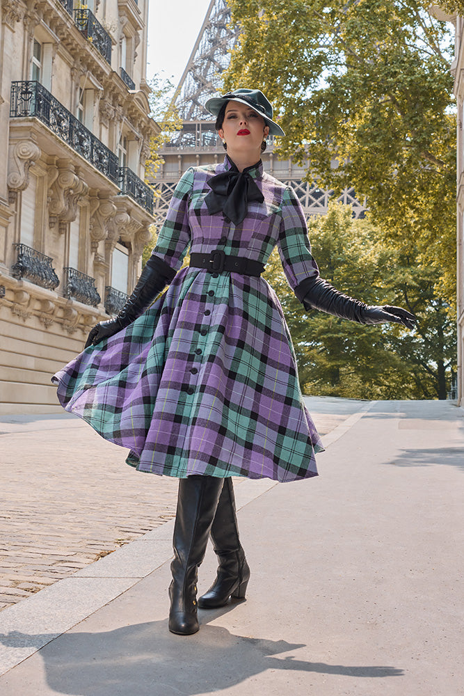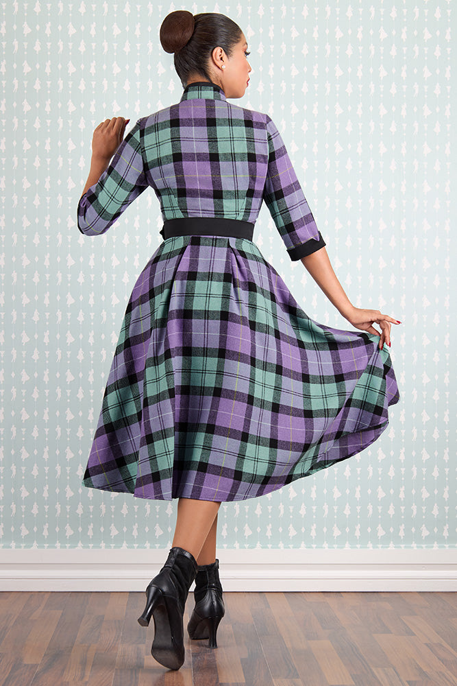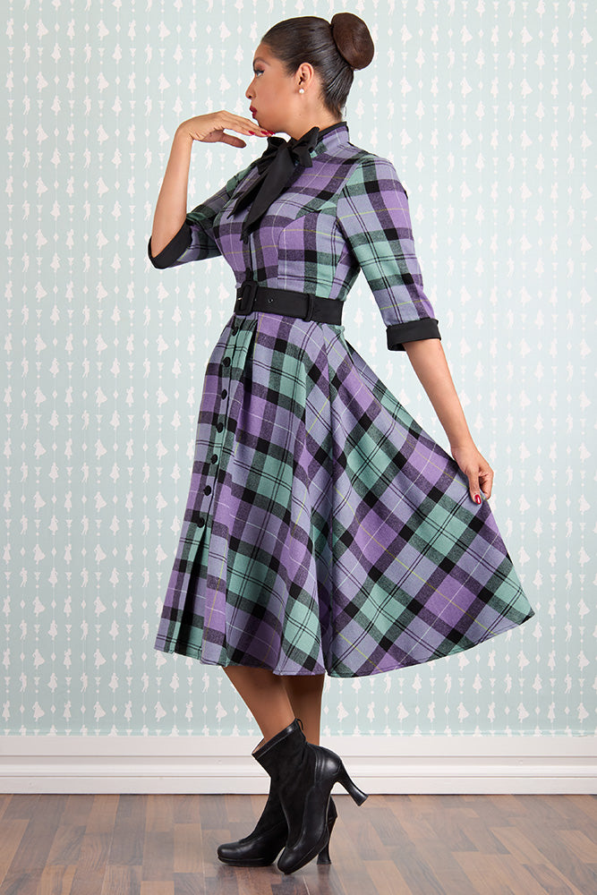 Gorgeous flannel dress in turquoise and lavender plaid with a big black bow neckline.  This dress has a functional button front and comes with a coordinating black belt.  The skirt is full and the bodice is fitted with 3/4 length sleeves.
