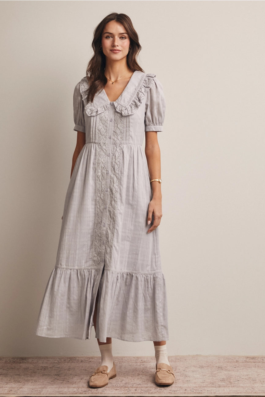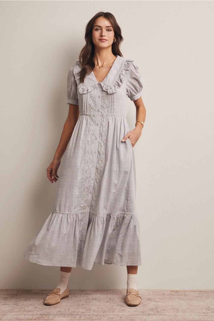 Misty Blue Ruffled Collar Midi Dress