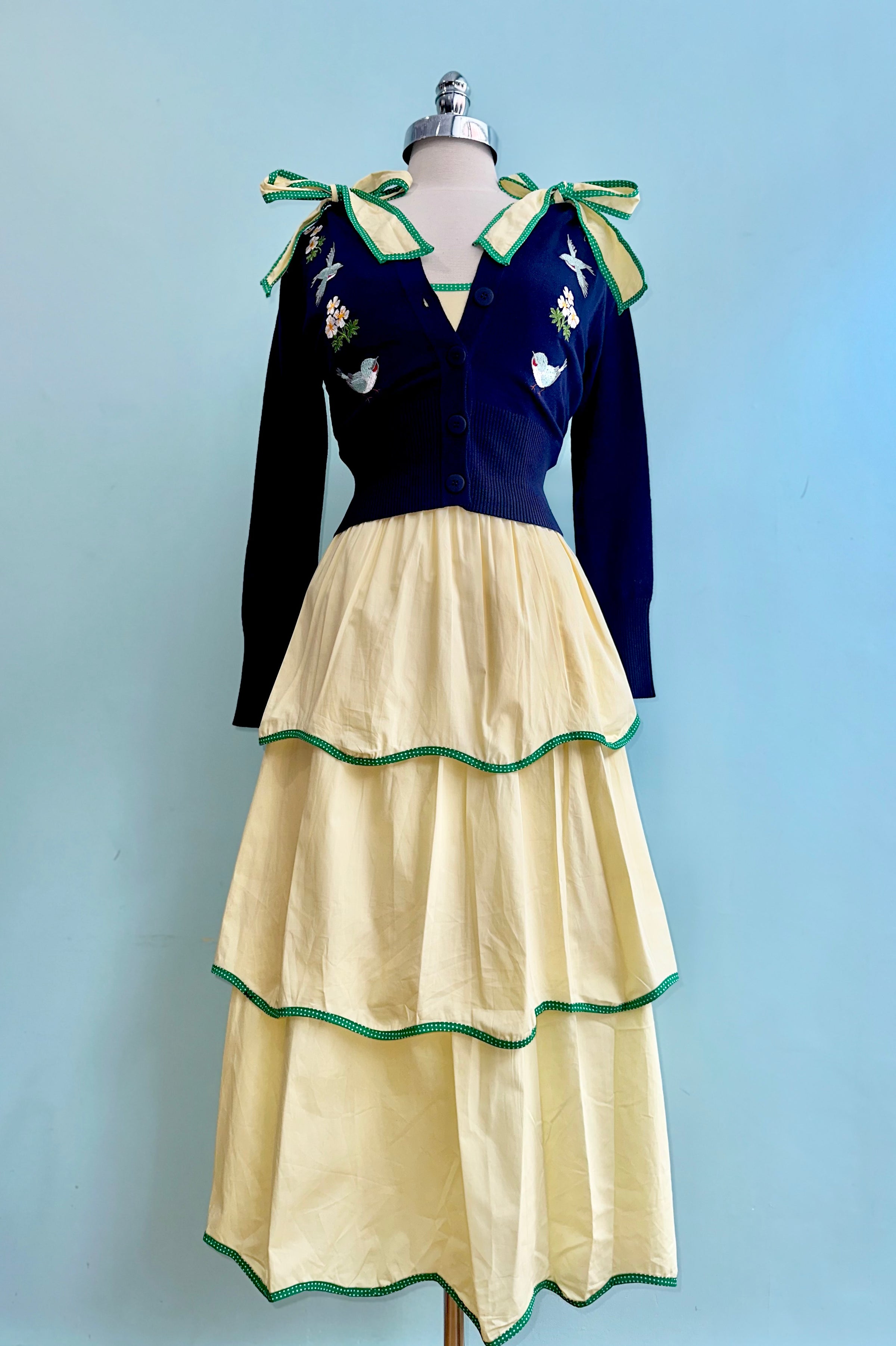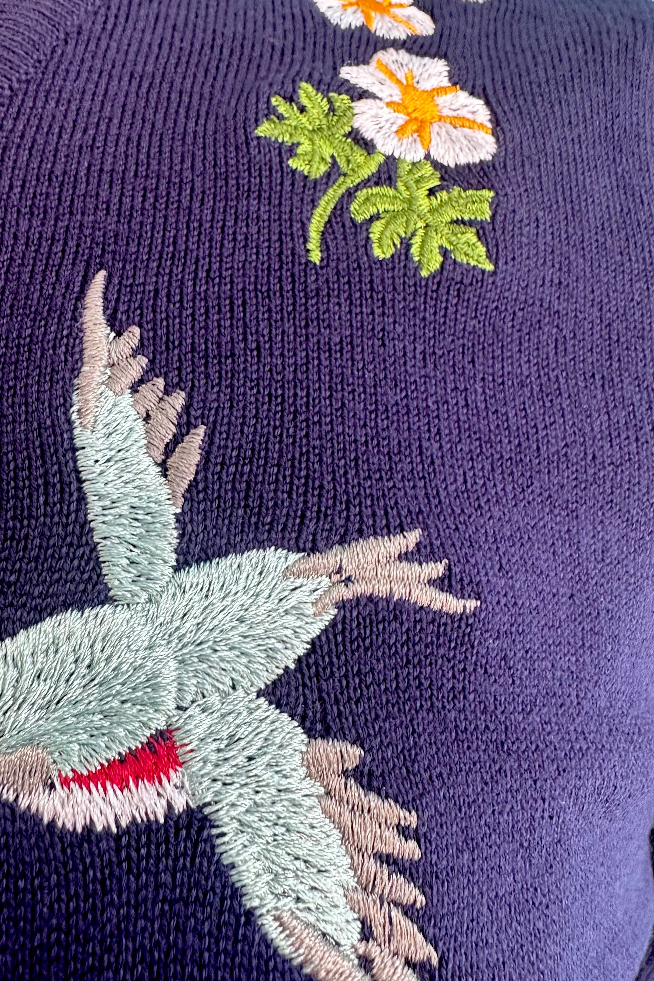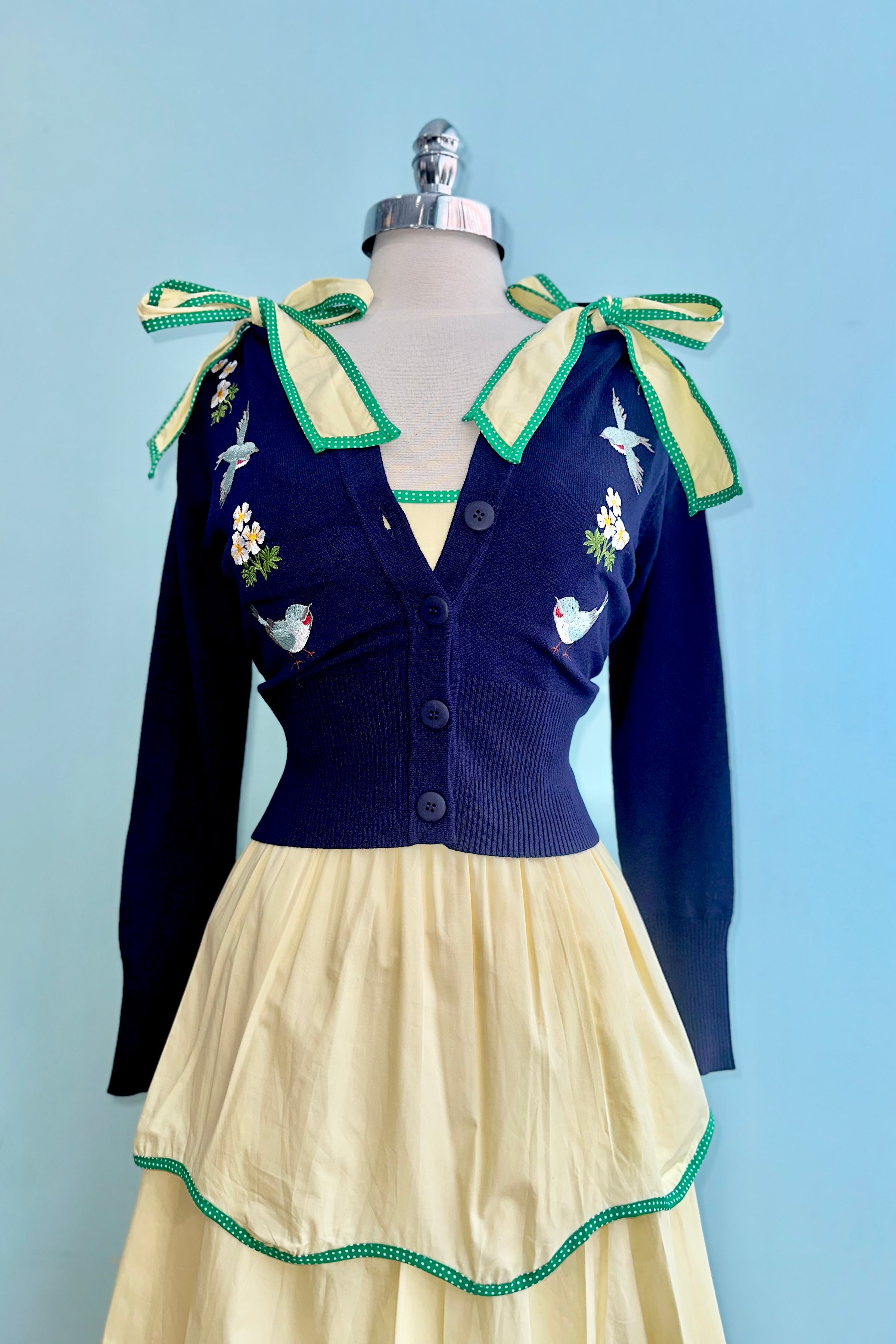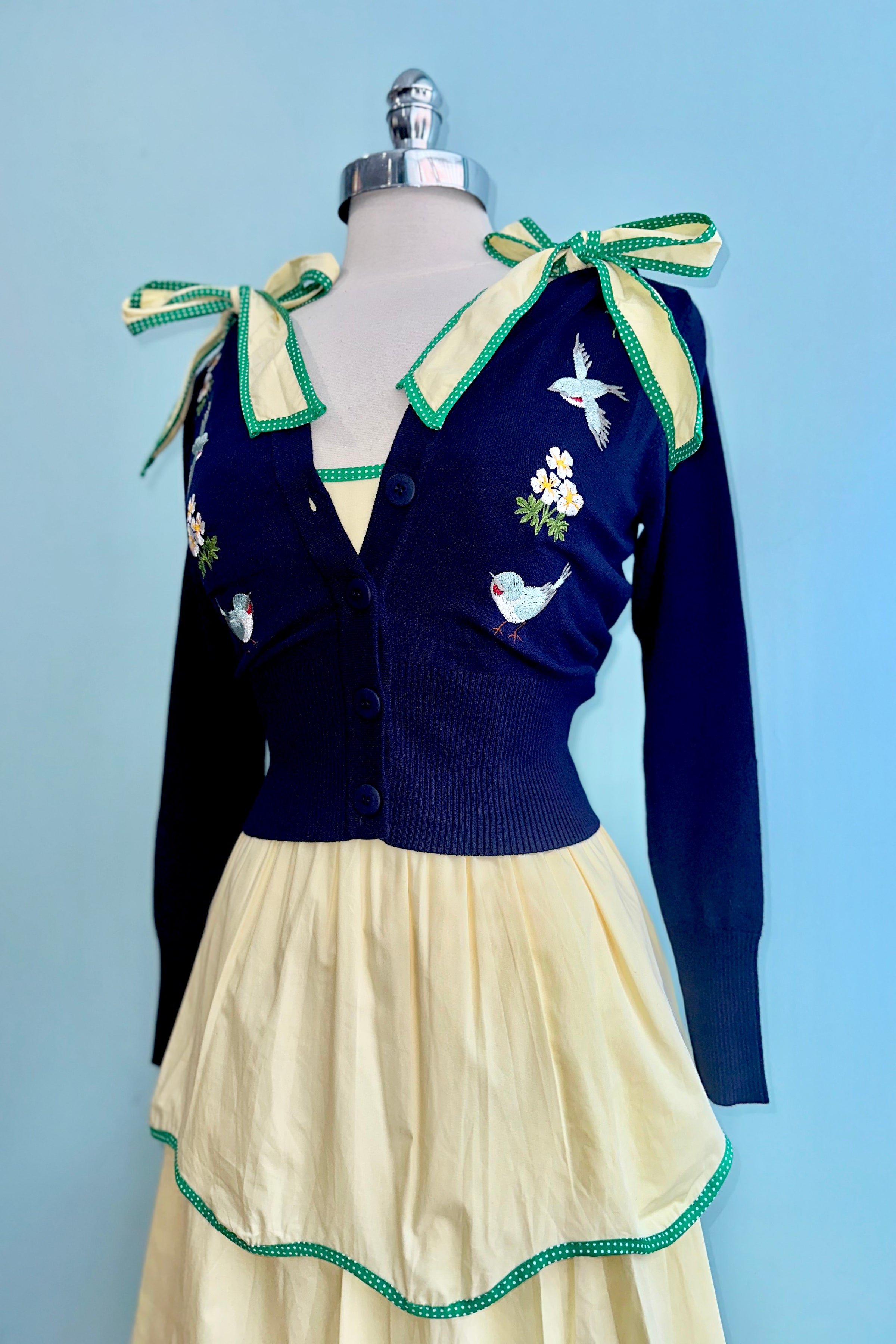 Navy cardigan with embroidered birds and flowers in yellow, green, white, blue, and red. This is a fitted V-neck cardigan with long sleeves. It buttons up the front with matching navy buttons.