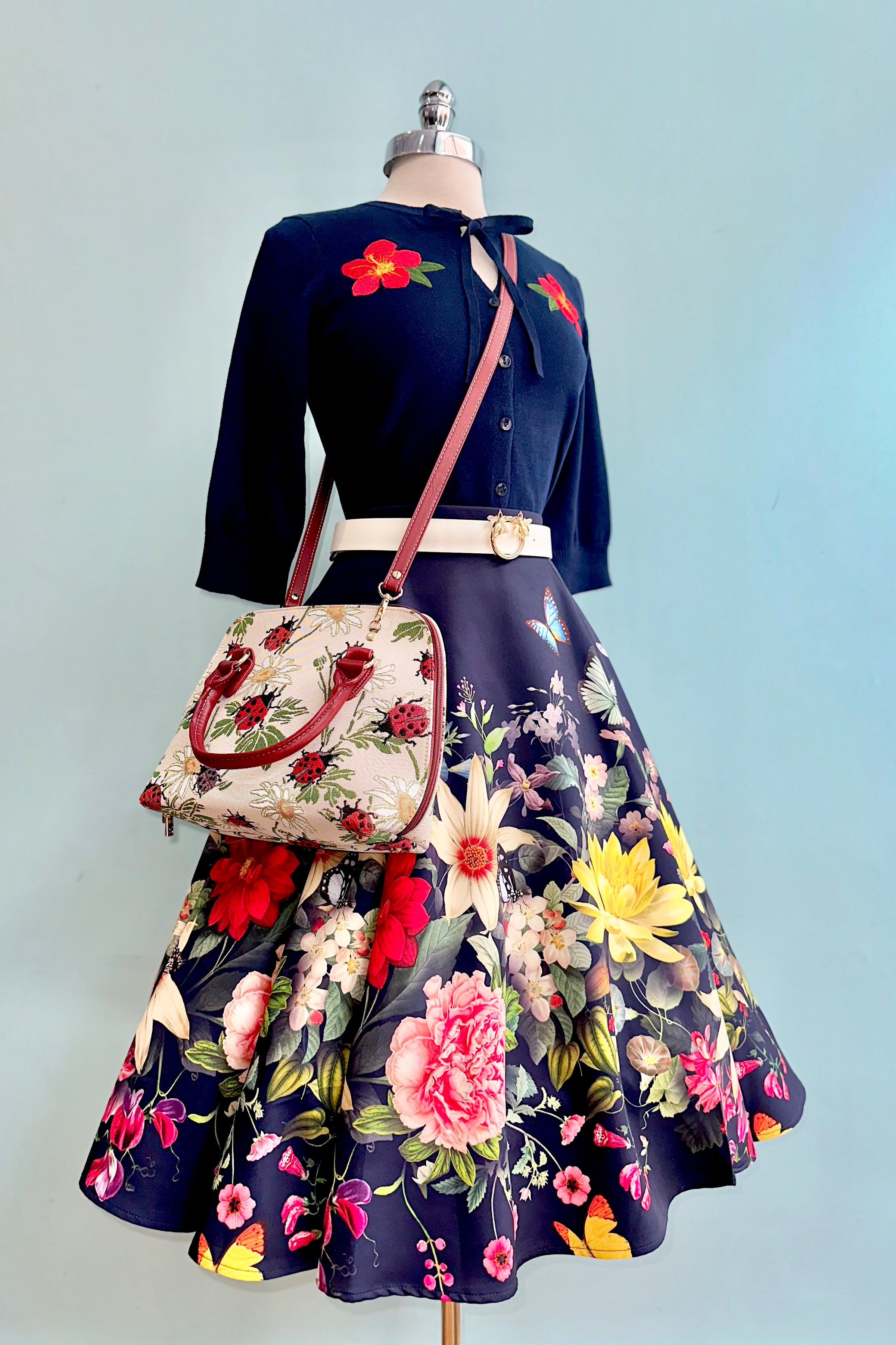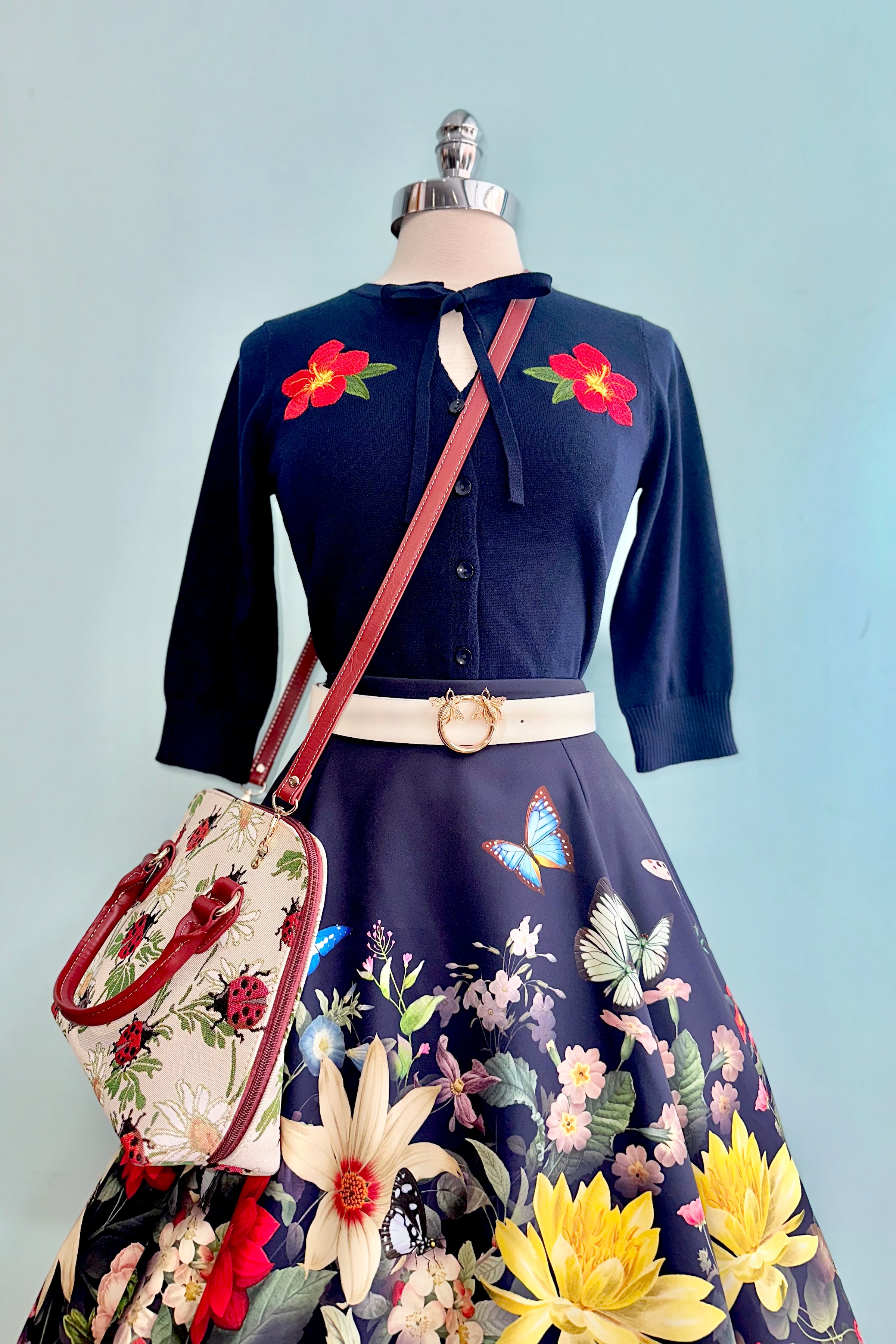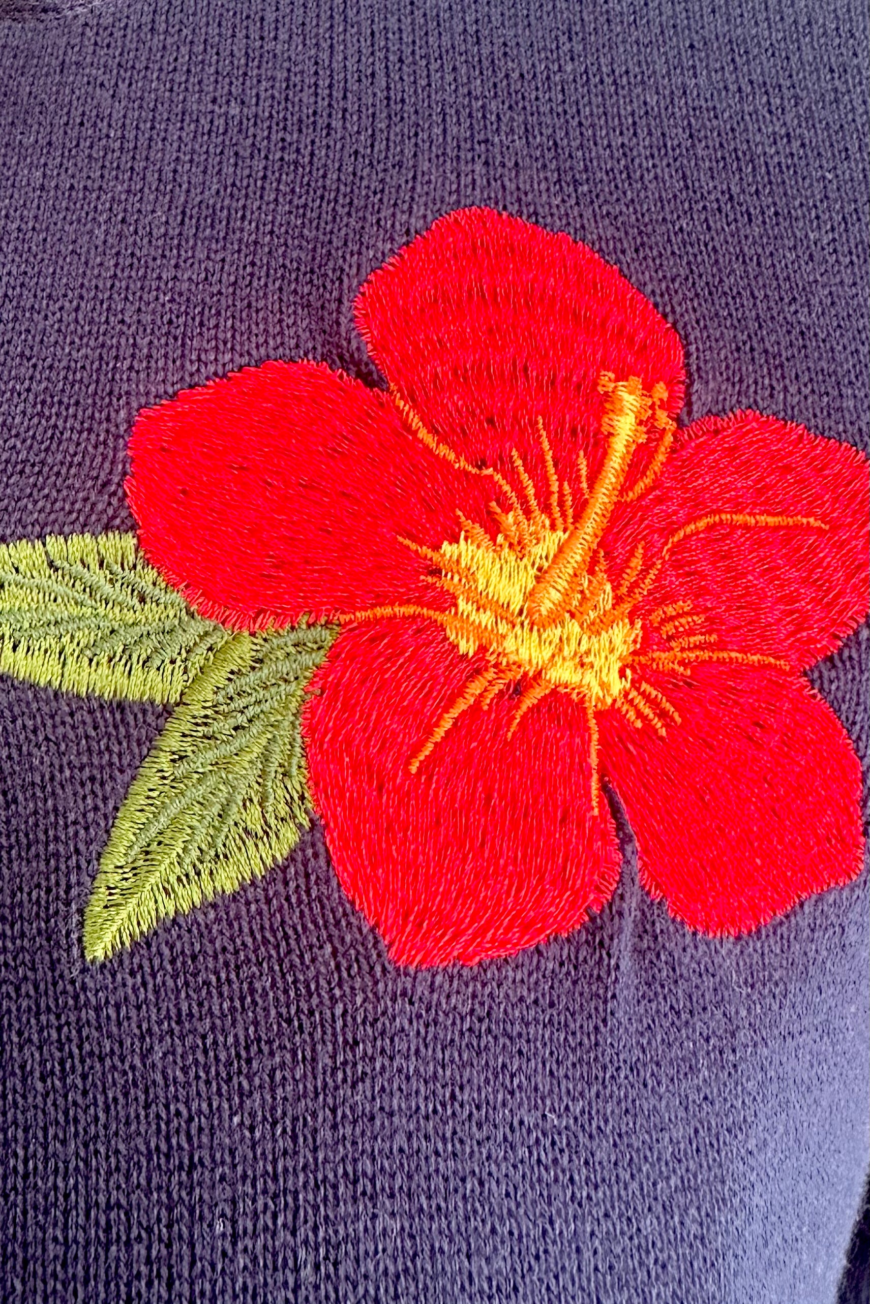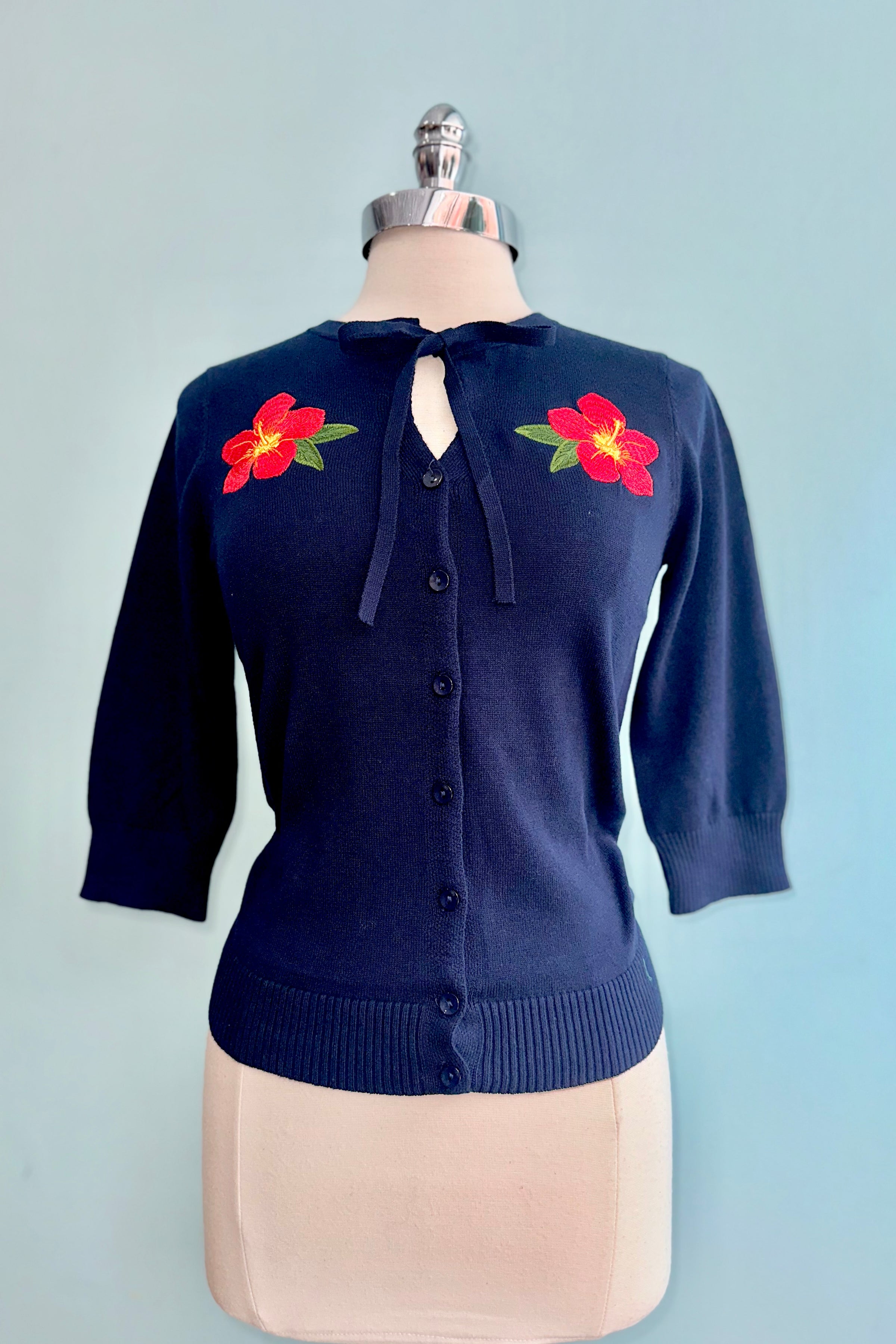 Navy cardigan sweater with embroidered red flowers on each front shoulder. This cardi has a button front, a tie at the neck and 3/4 sleeves.