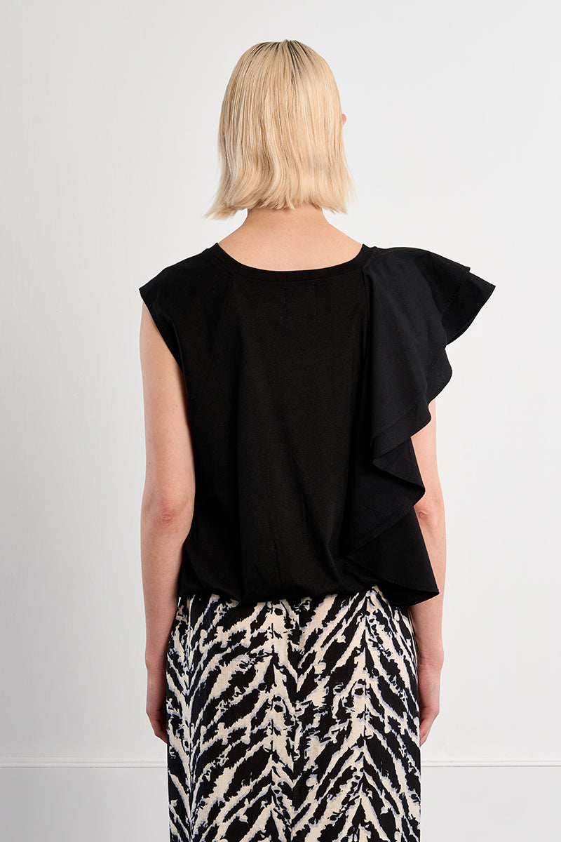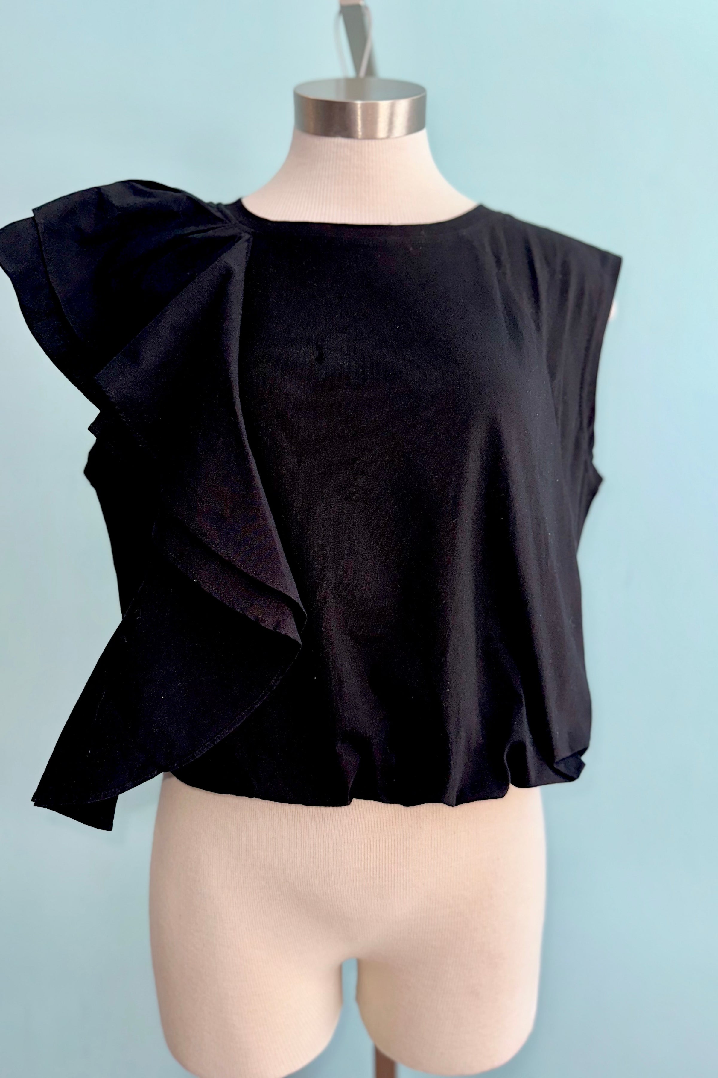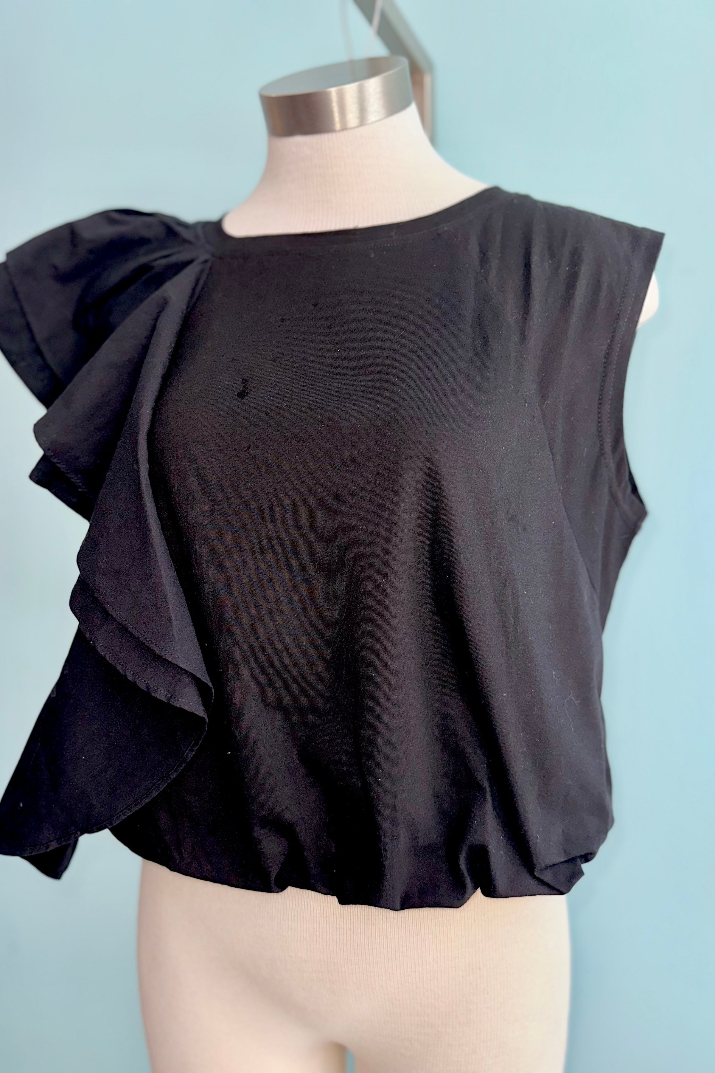Black jersey top with one side shoulder ruffle the other is without. This top has an elastic hem.