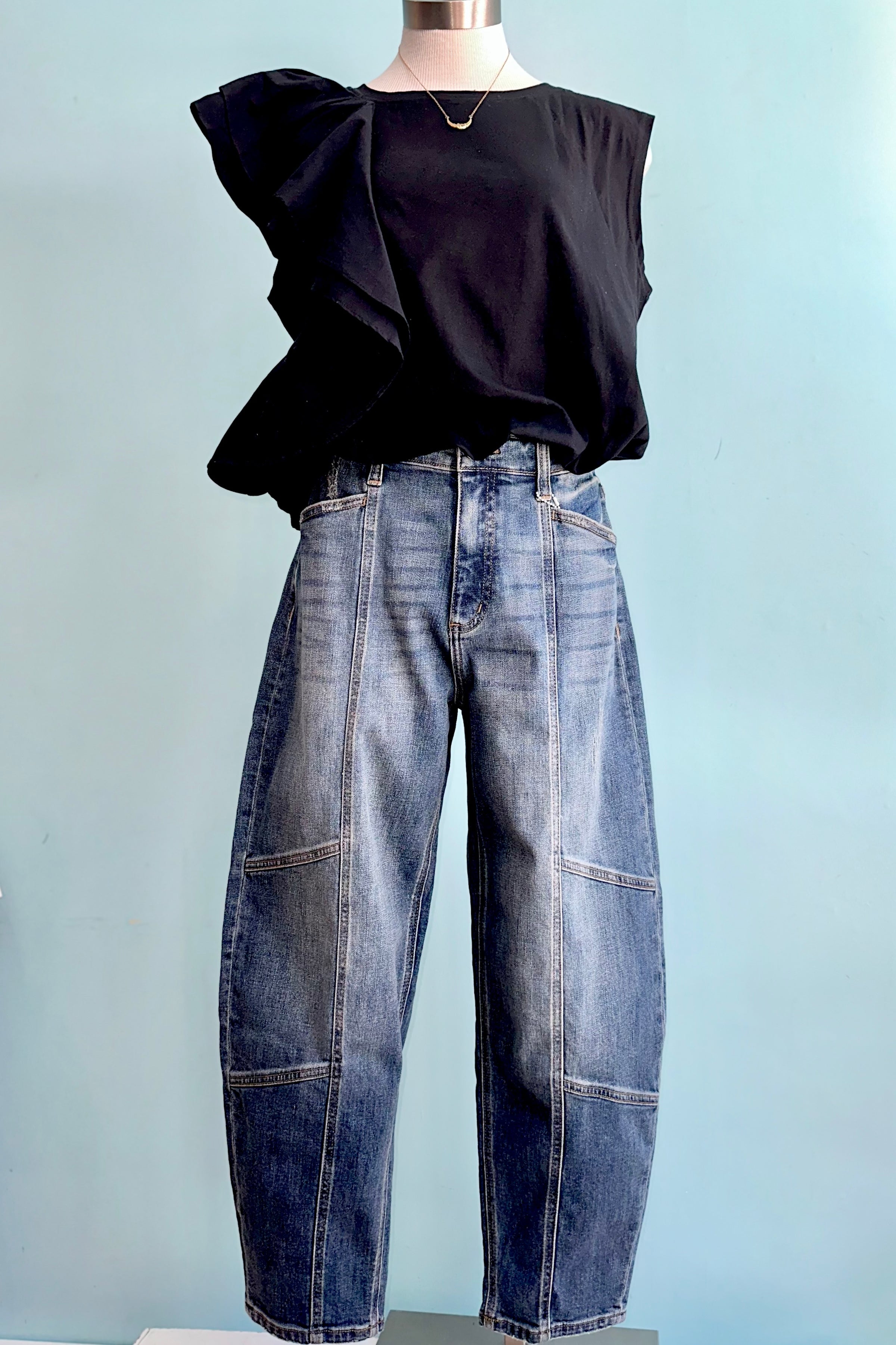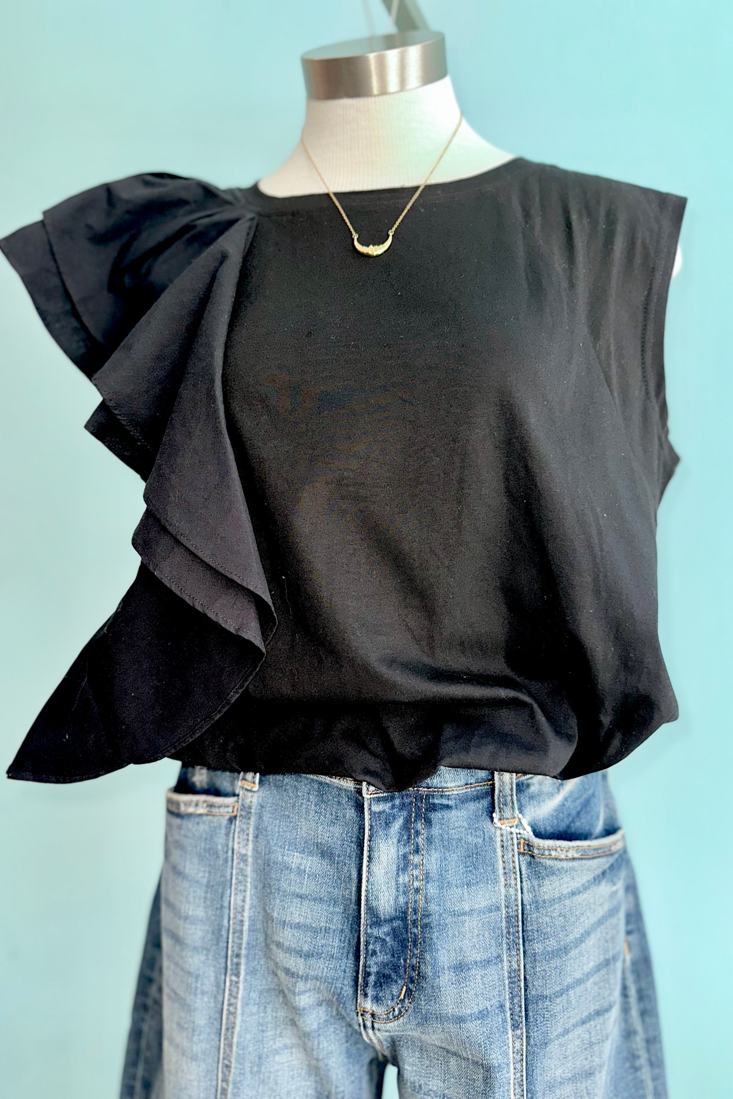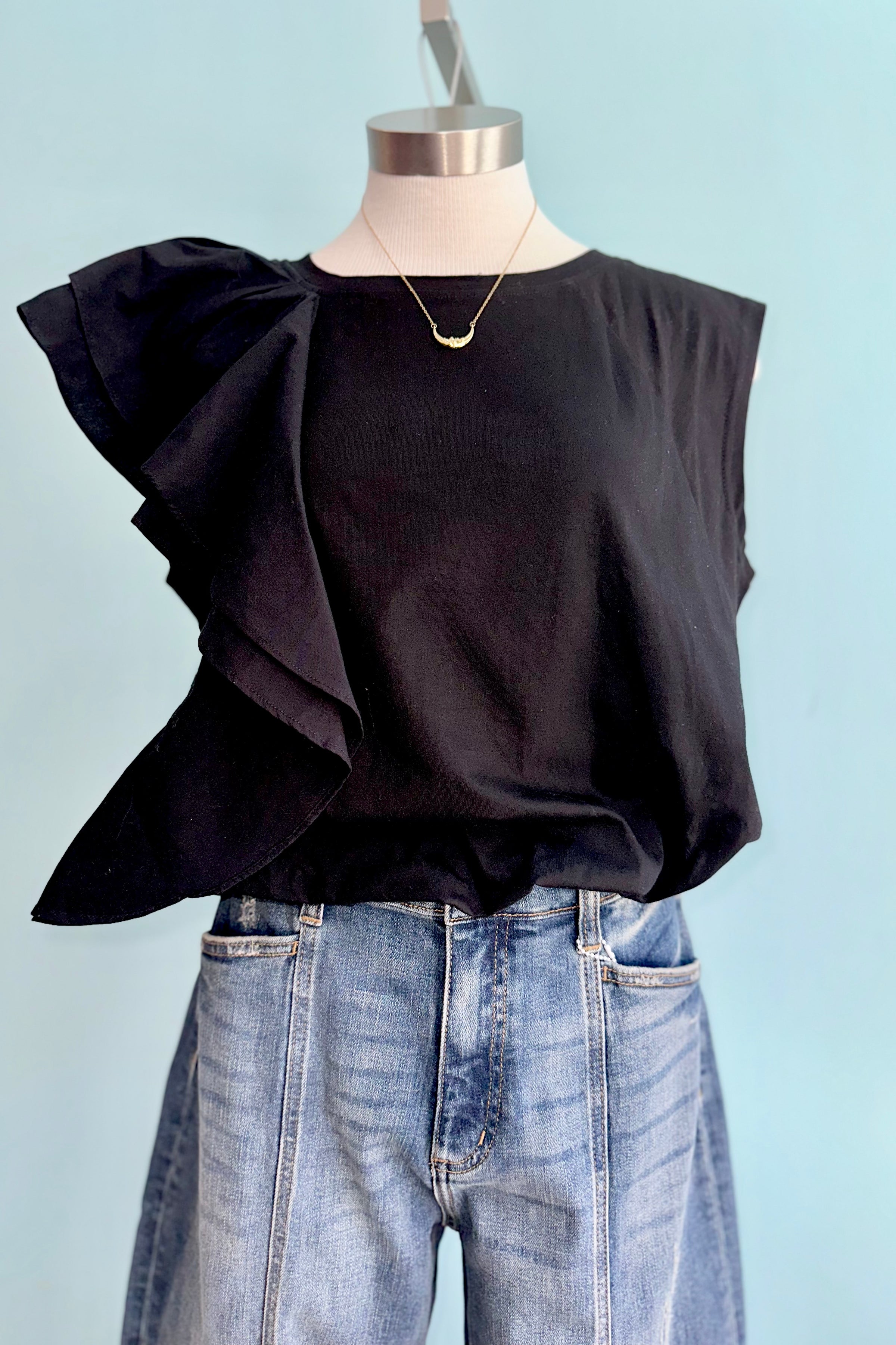 Black jersey top with one side shoulder ruffle the other is without. This top has an elastic hem.