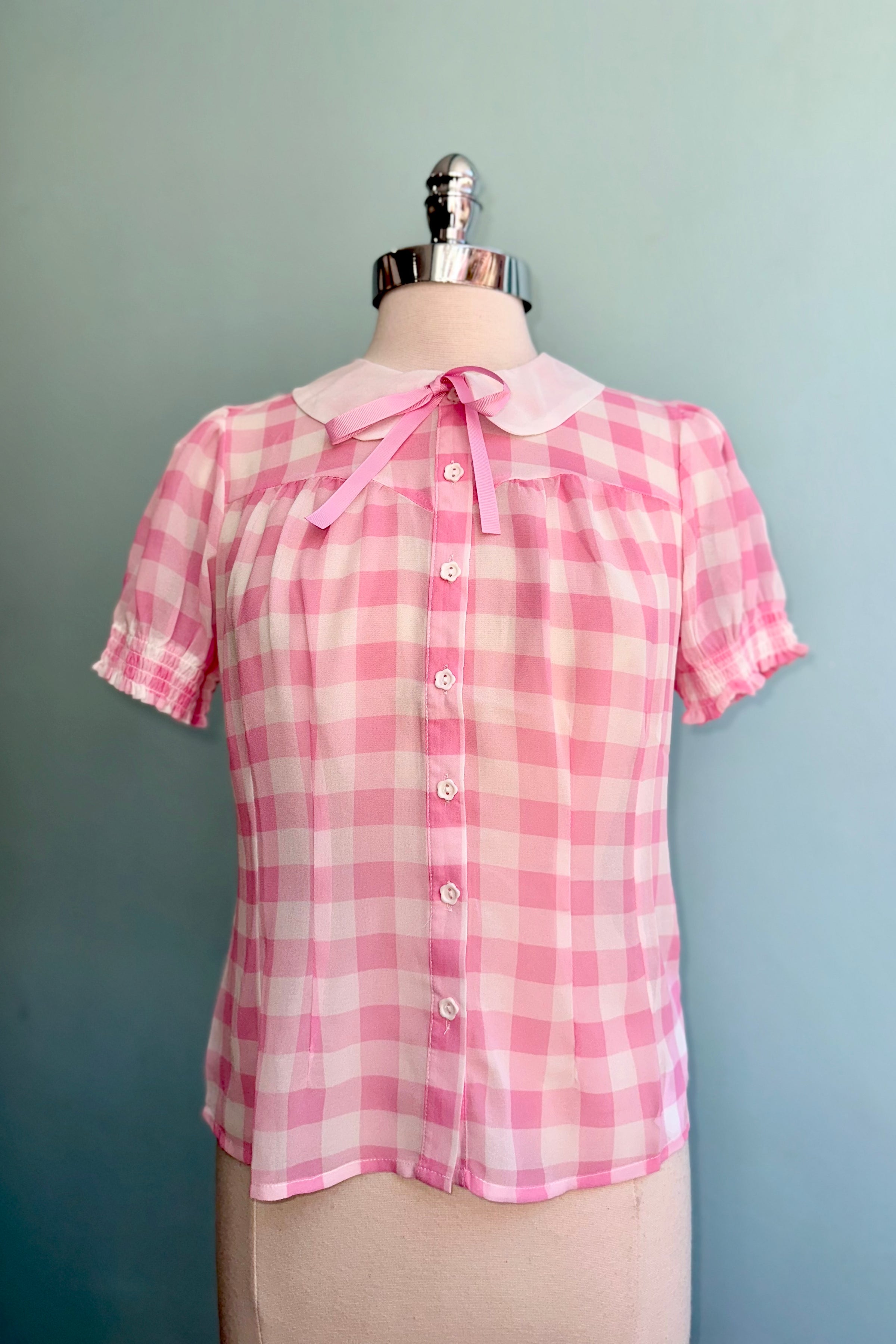 Chiffon blouse in pink and white gingham with a peter pan fold over collar in white finished with a pink ribbon. This top has a flower button down front and short sleeves are puffed with an elastic hem. This fabric is semi-sheer and is not lined.