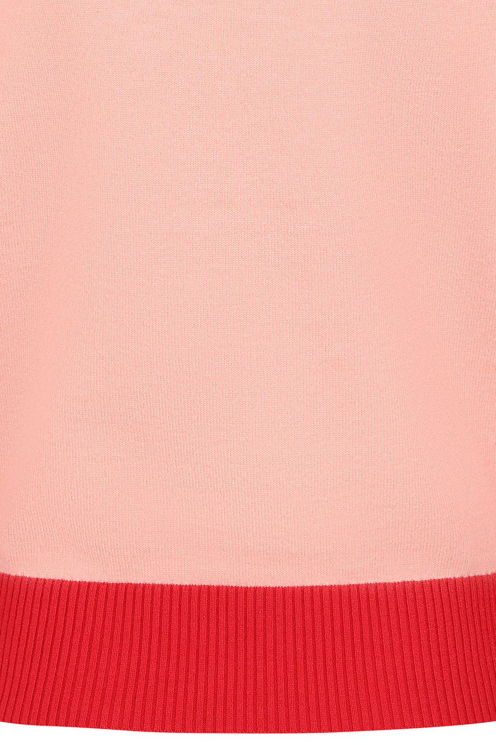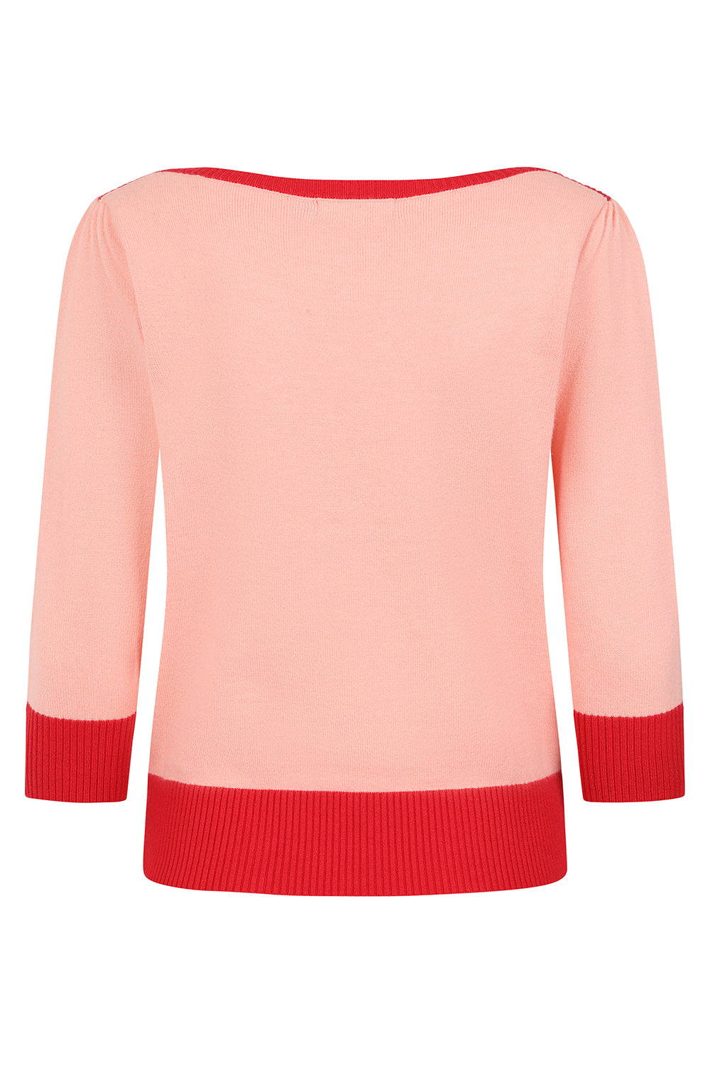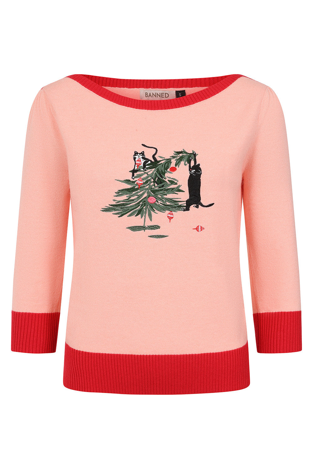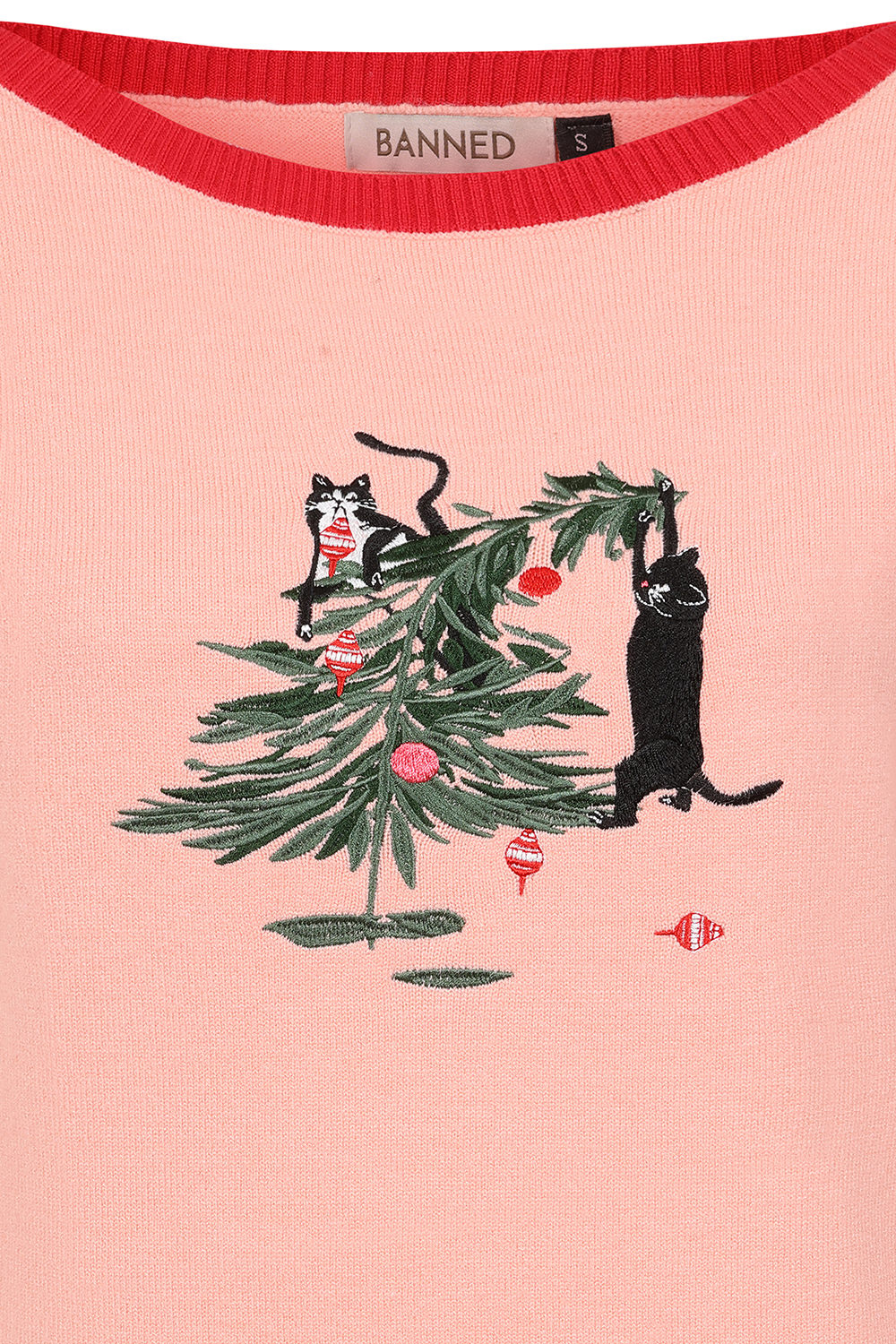 Holiday sweater in pink with red trim and an embroidered scene in the bodice center of mischievous kitties and a Christmas tree! This sweater has a little gathering at the shoulder and is a fitted style.