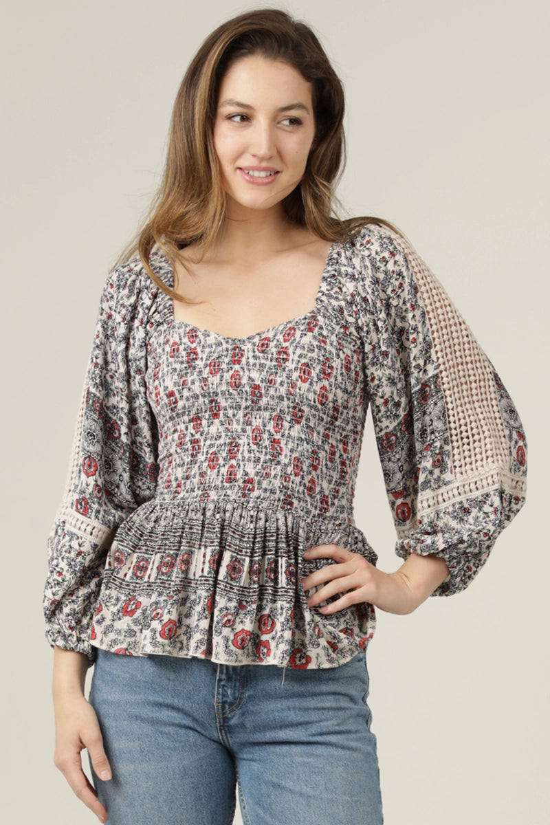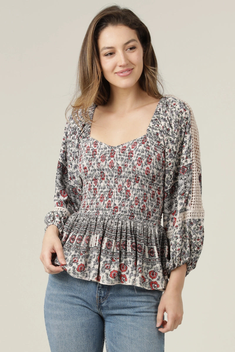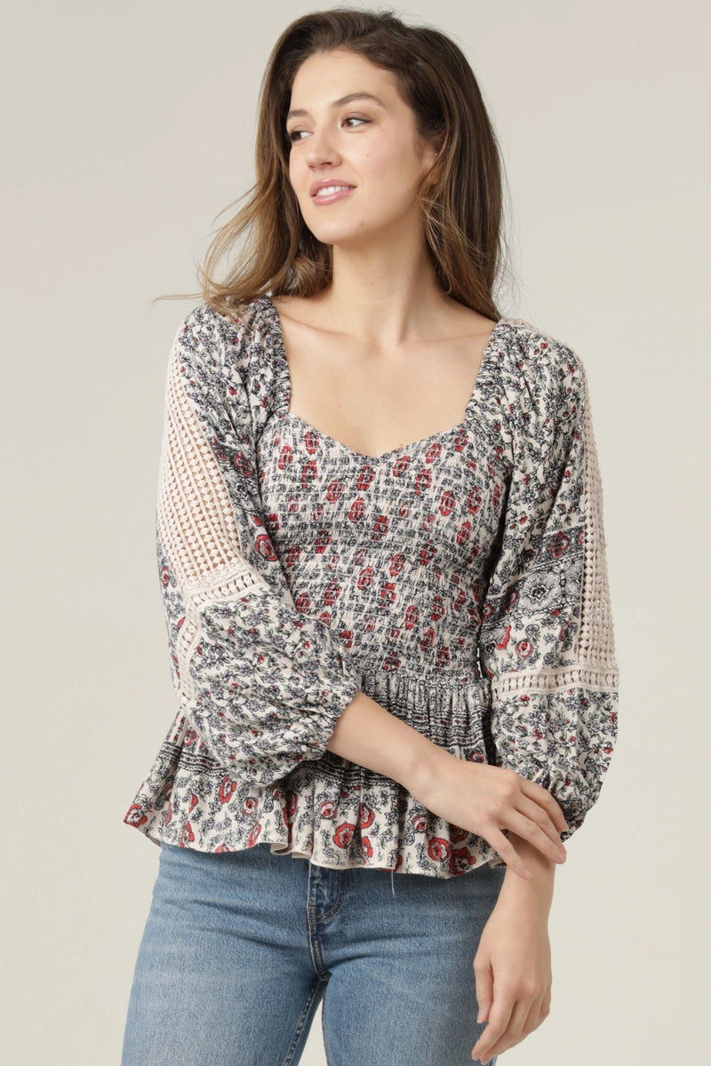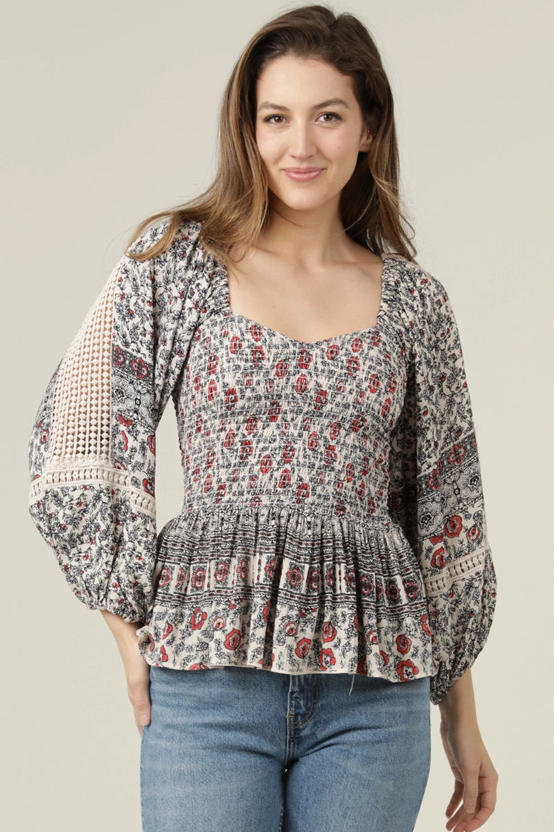 Poet sleeve top in white with black with red detail and a fully smocked bodice. This top has long poet sleeves with a crochet lace cut out. The front has a sweetheart neckline and a square back.