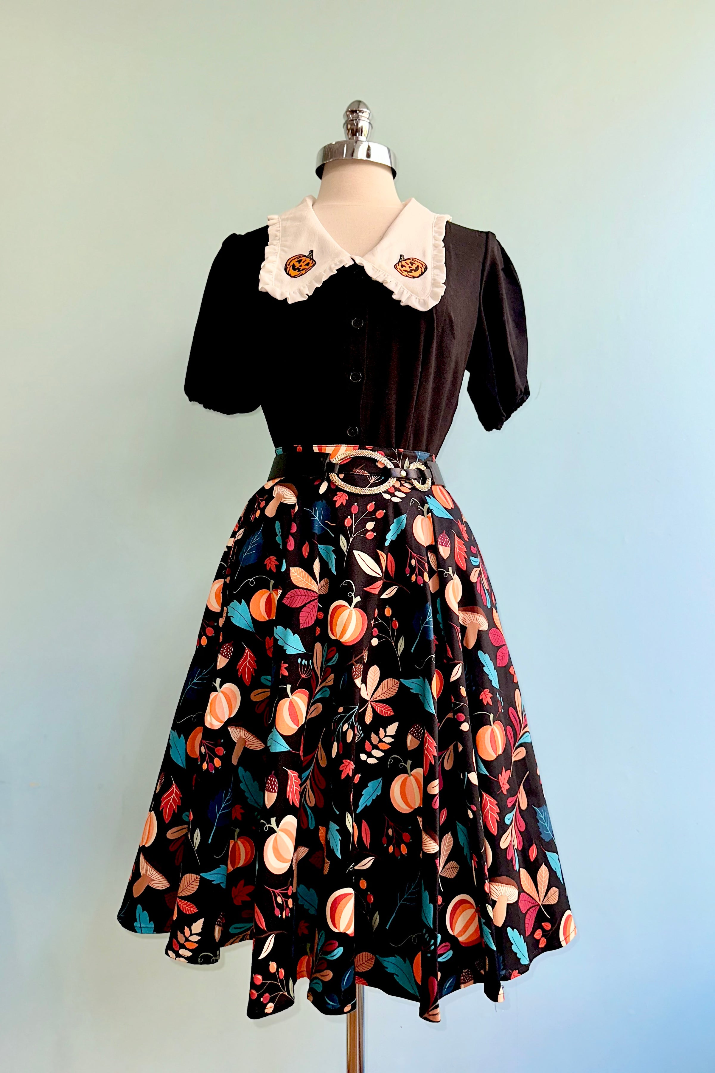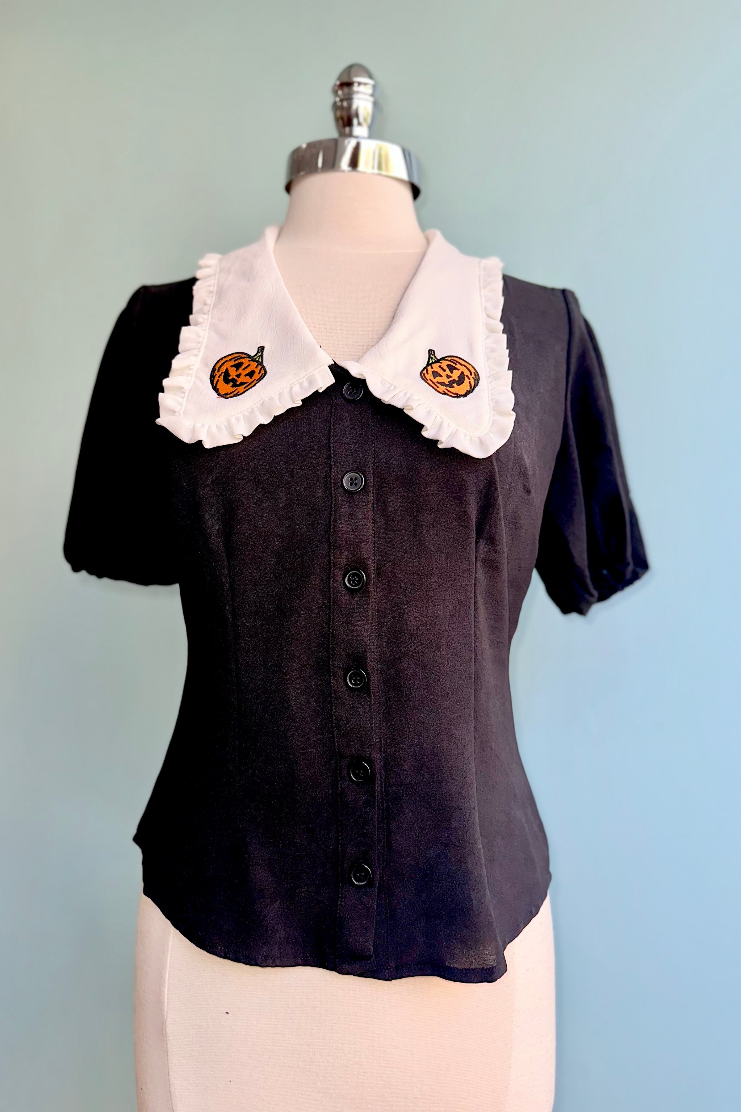 Button down top in black with an oversized collar embroidered with Jack O' Lanterns and with ruffle trim. This is a button down top with short puff sleeves.