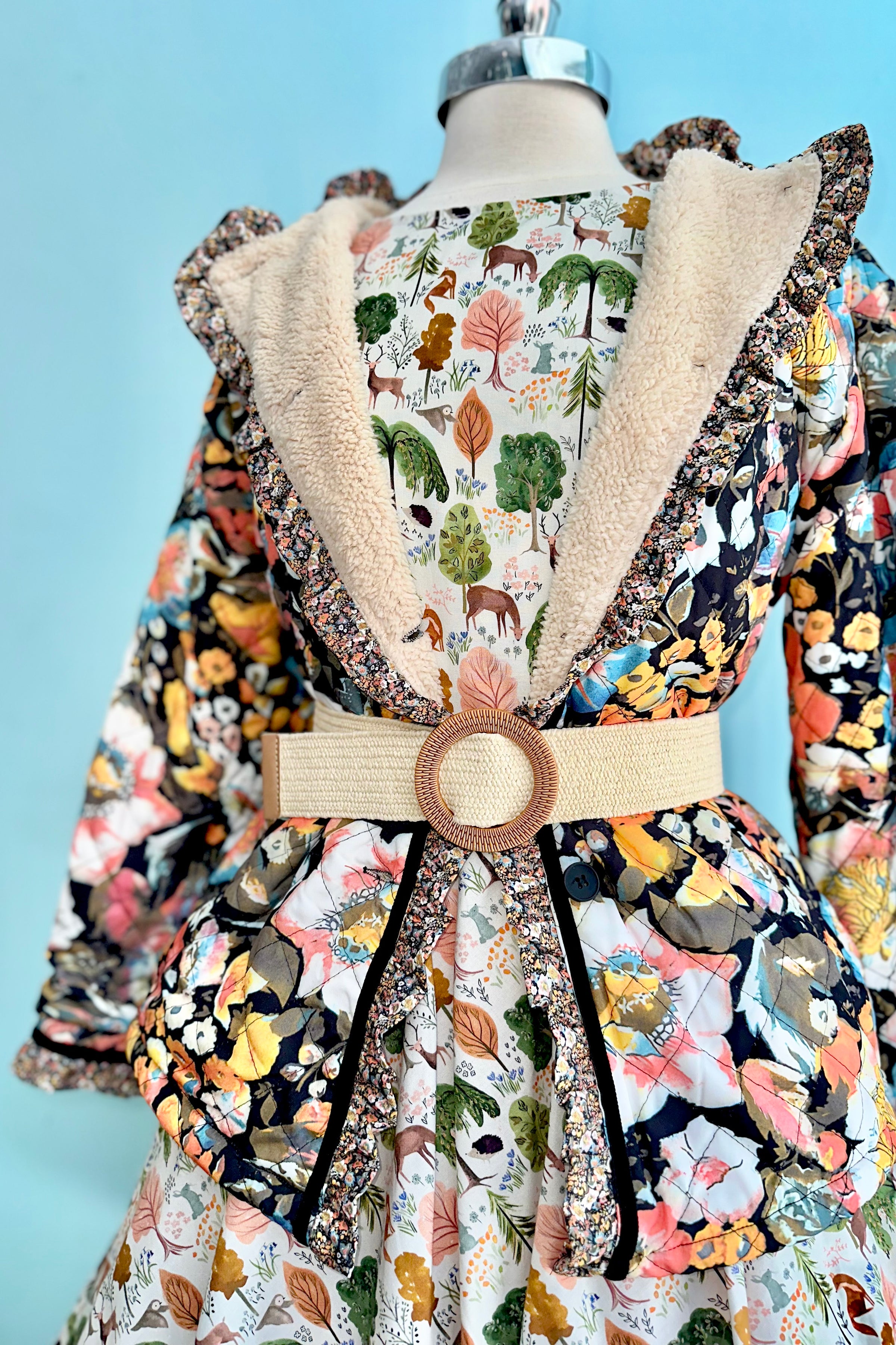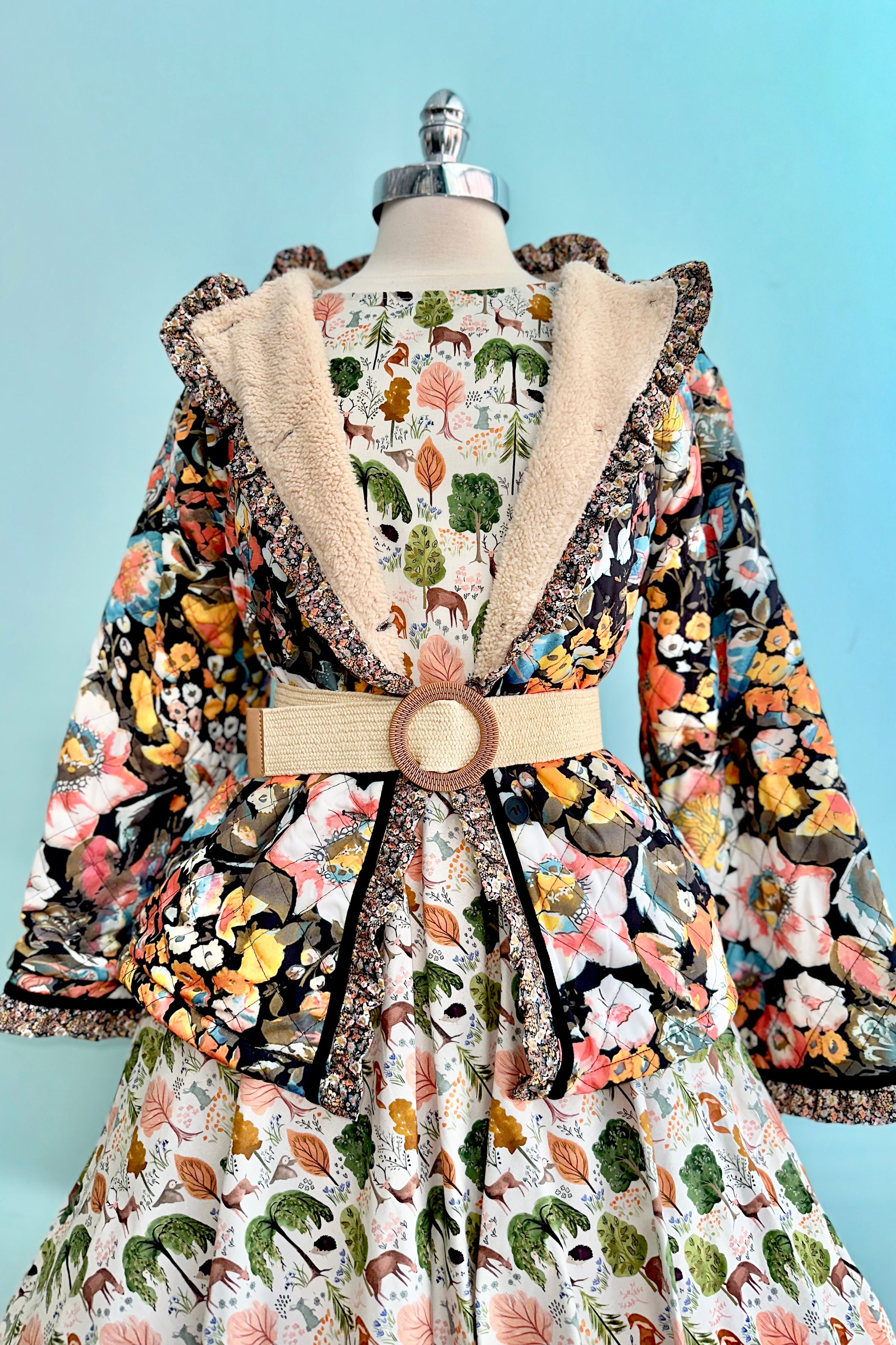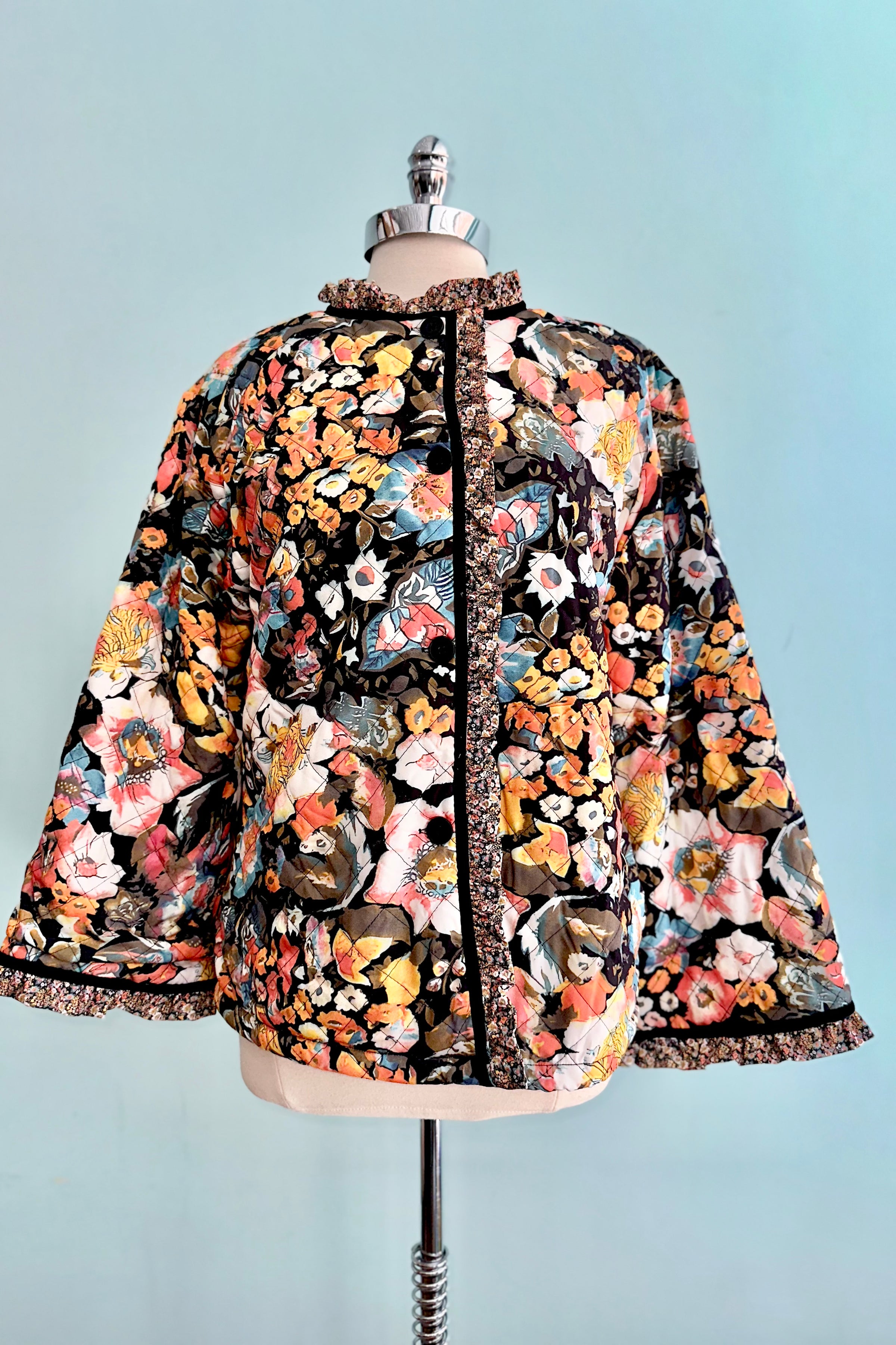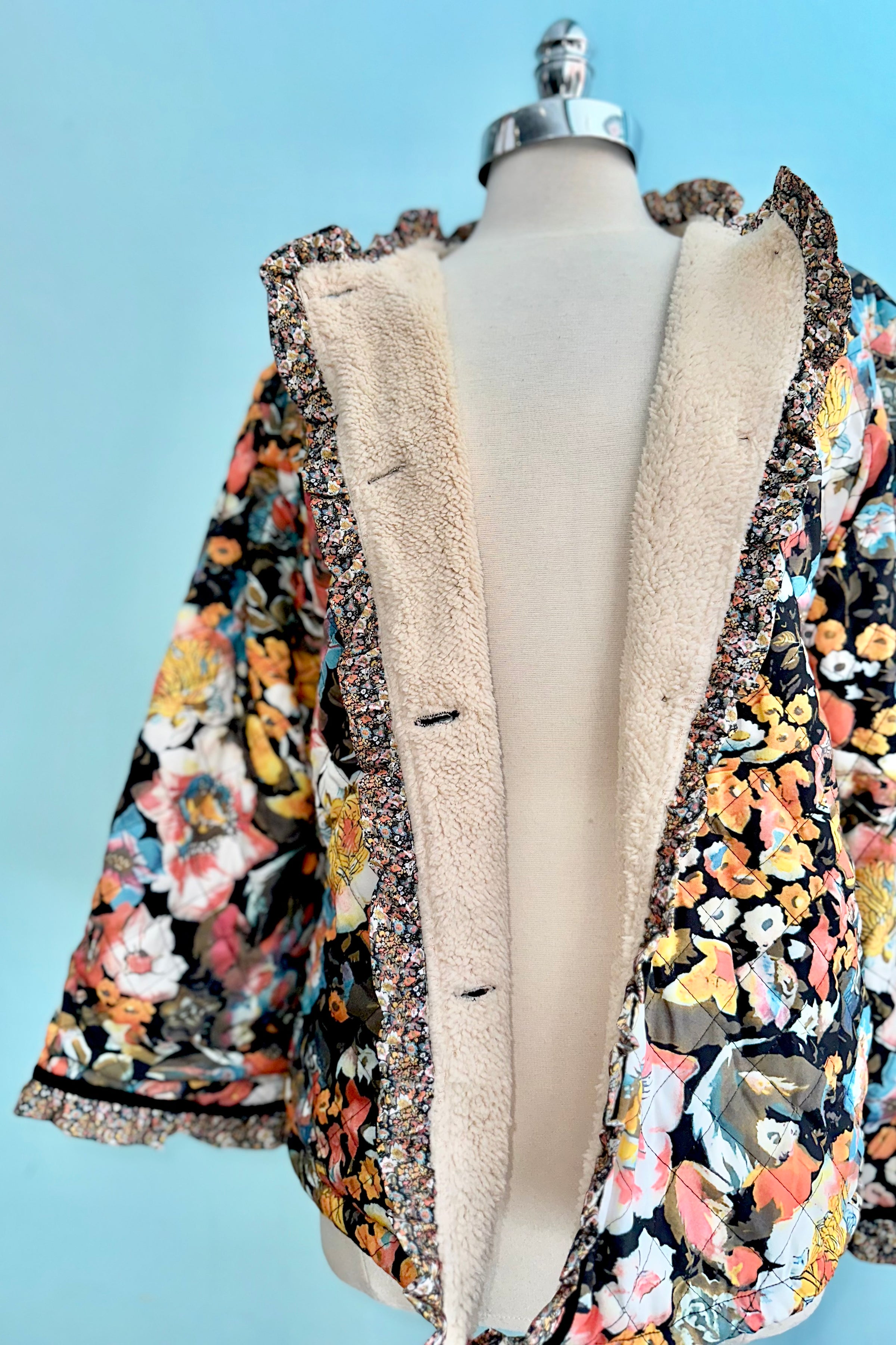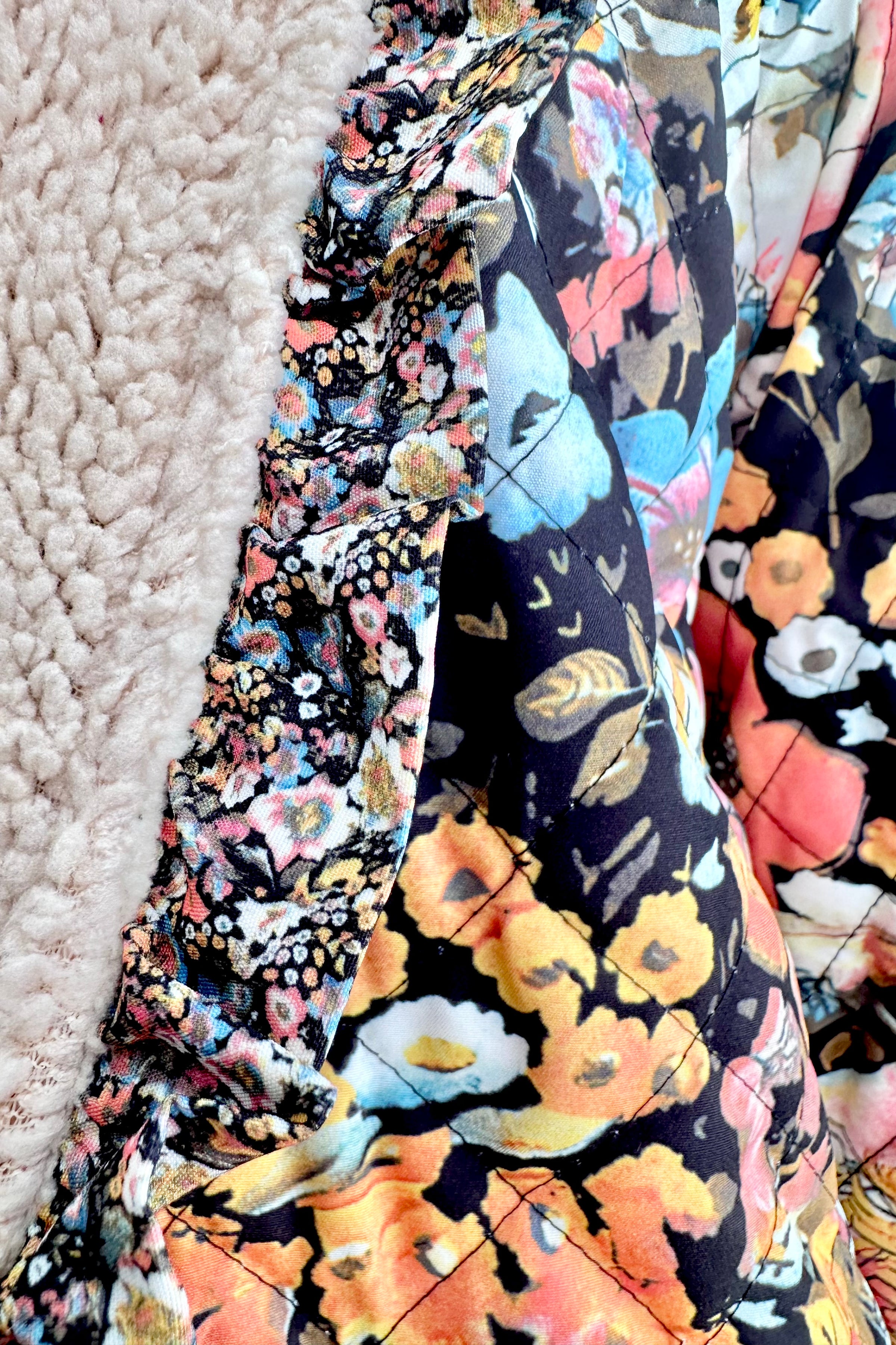 Quilted floral jacket with a boxy fit and bell sleeves and cozy faux shearling lining.