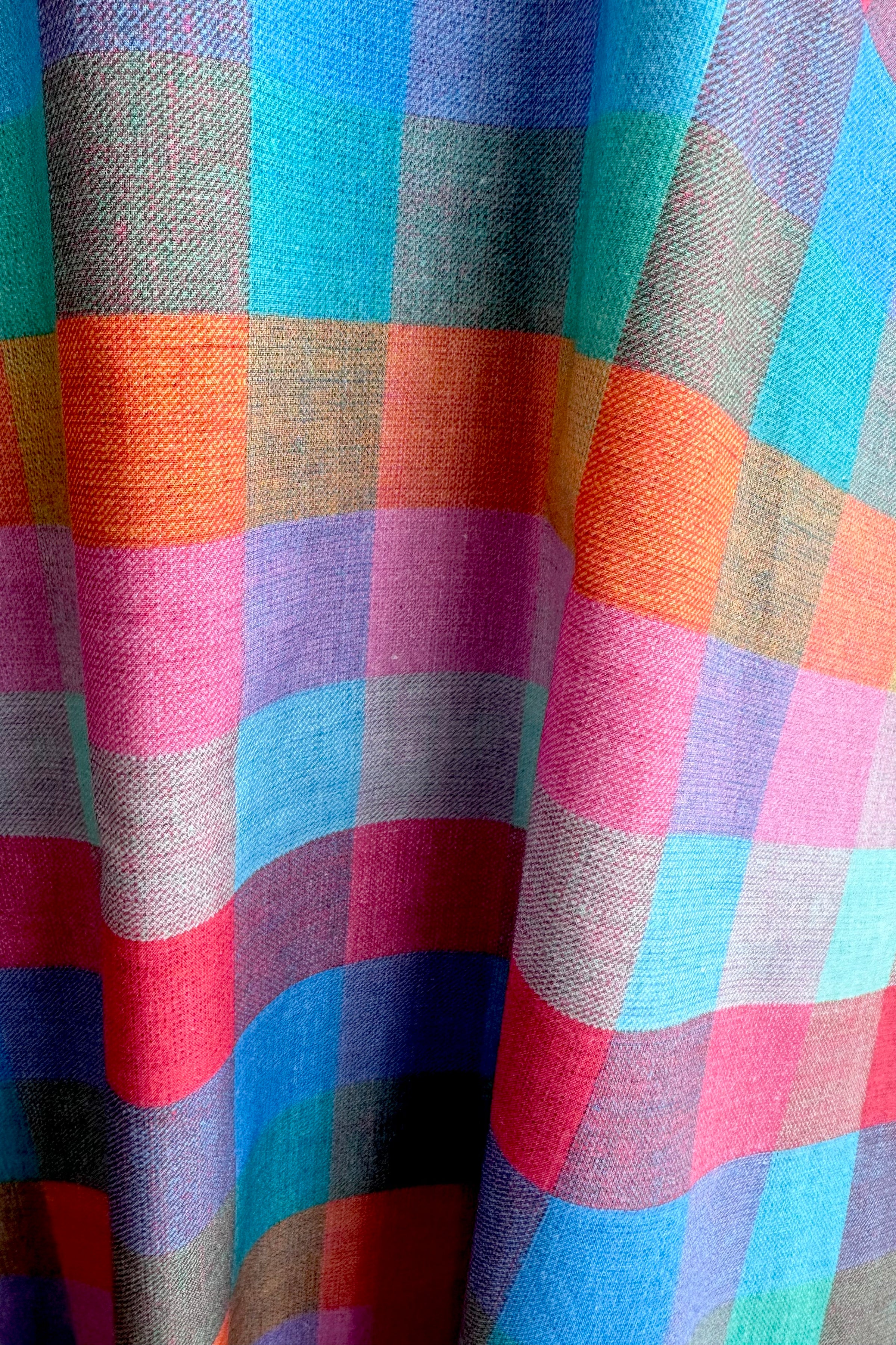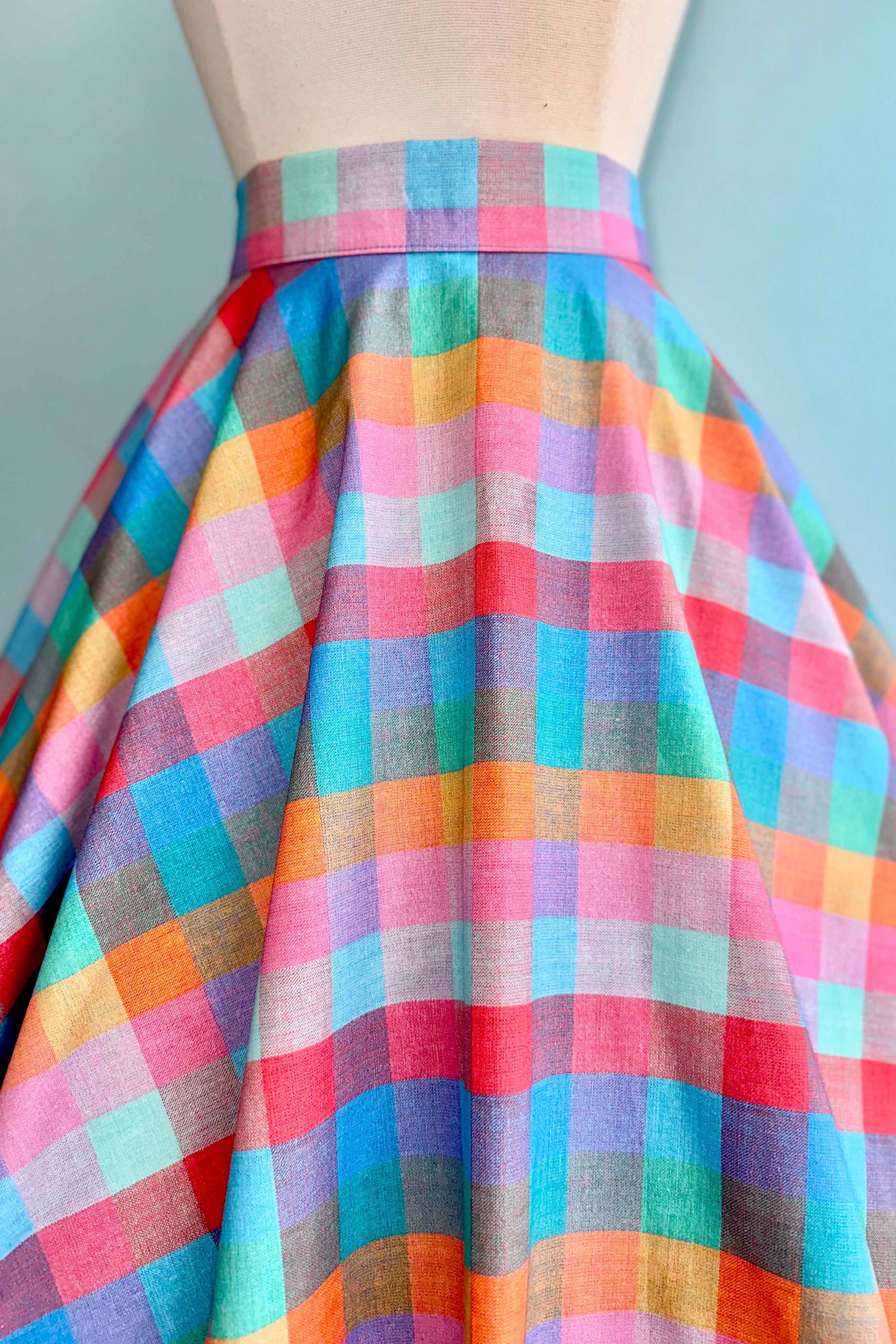 Gorgeous rainbow sherbet plaid circle skirt. This is 100% cotton, has pockets and zips up the back. Full circle skirt shape. Not lined.
