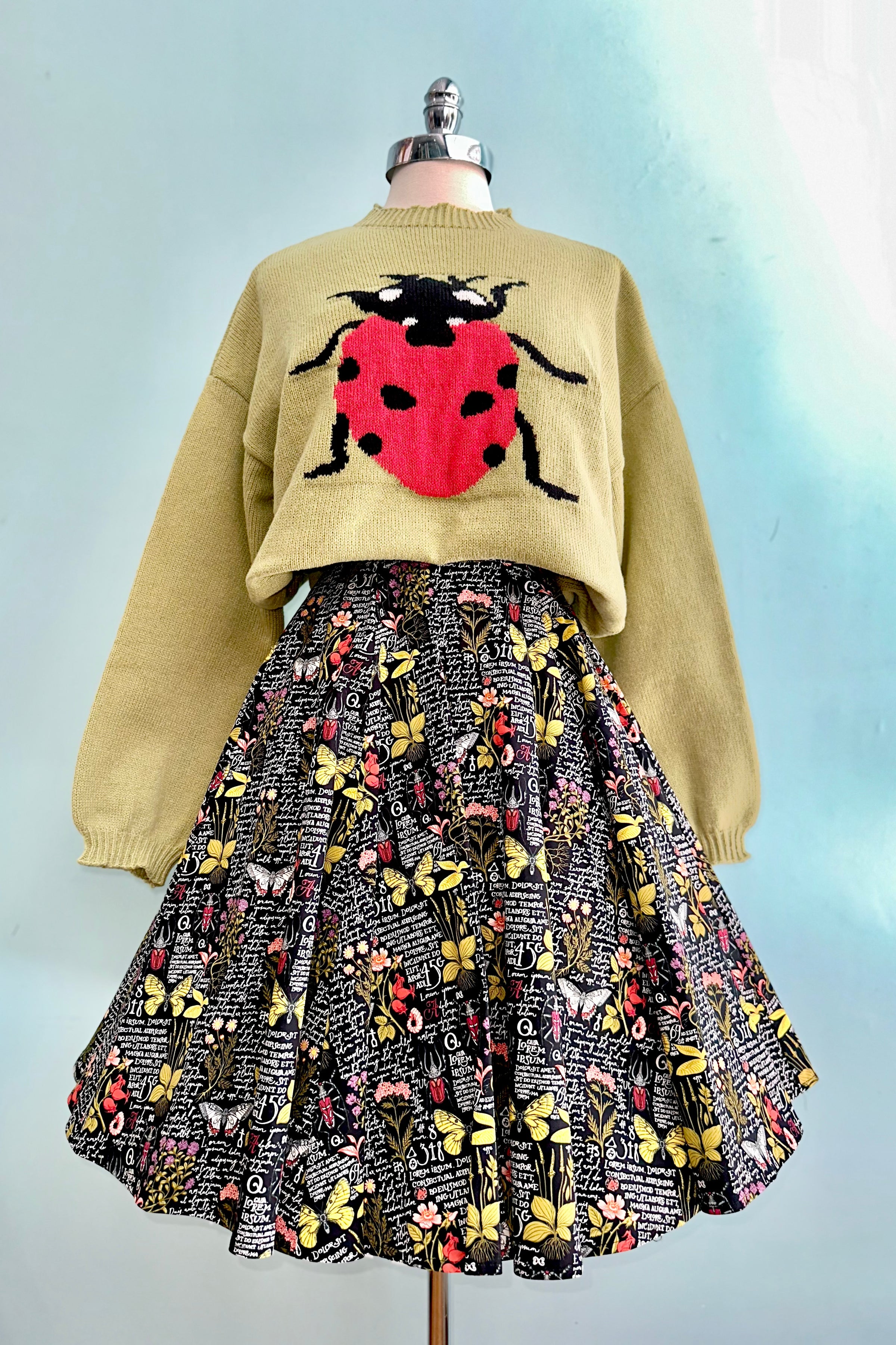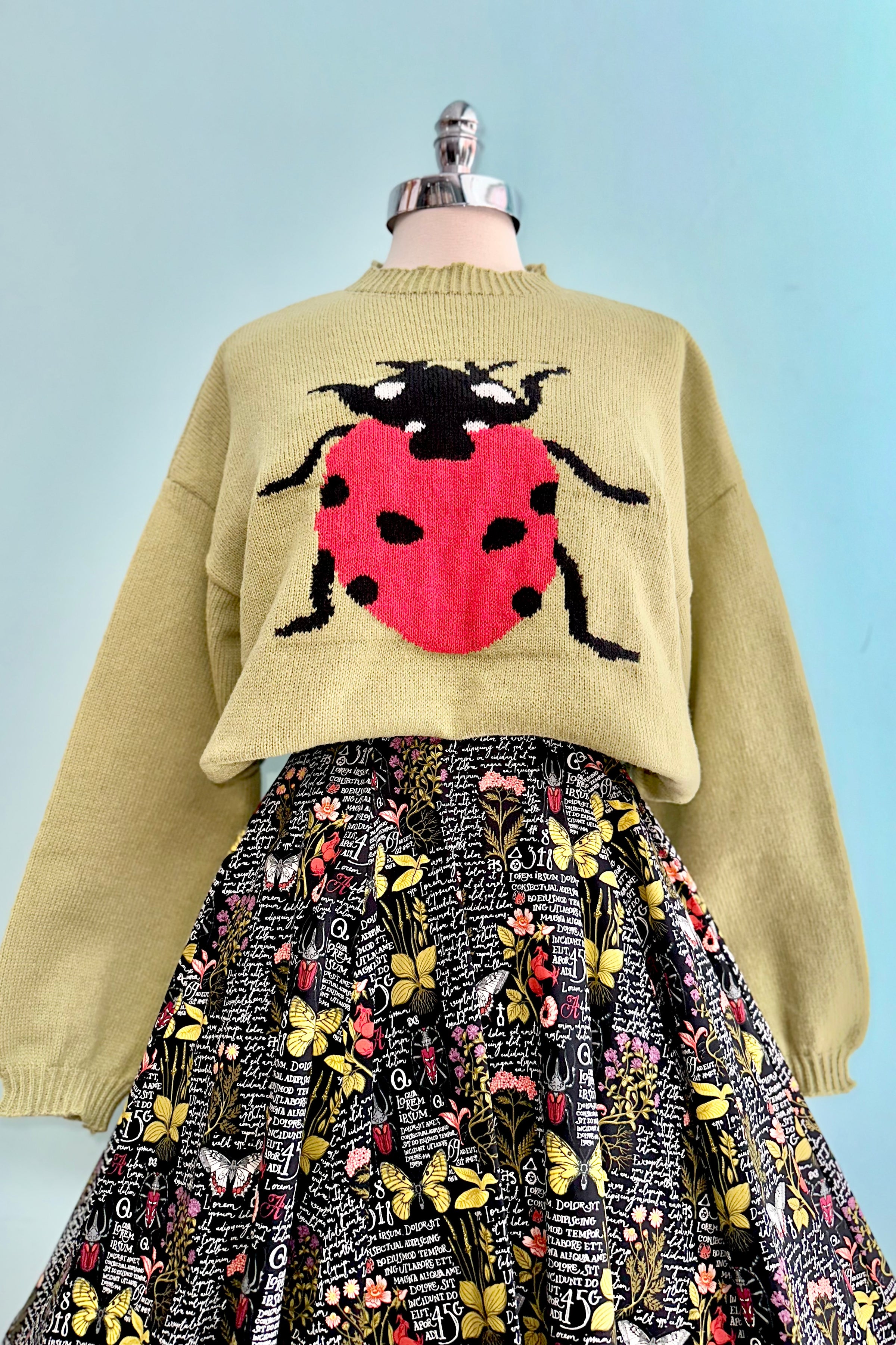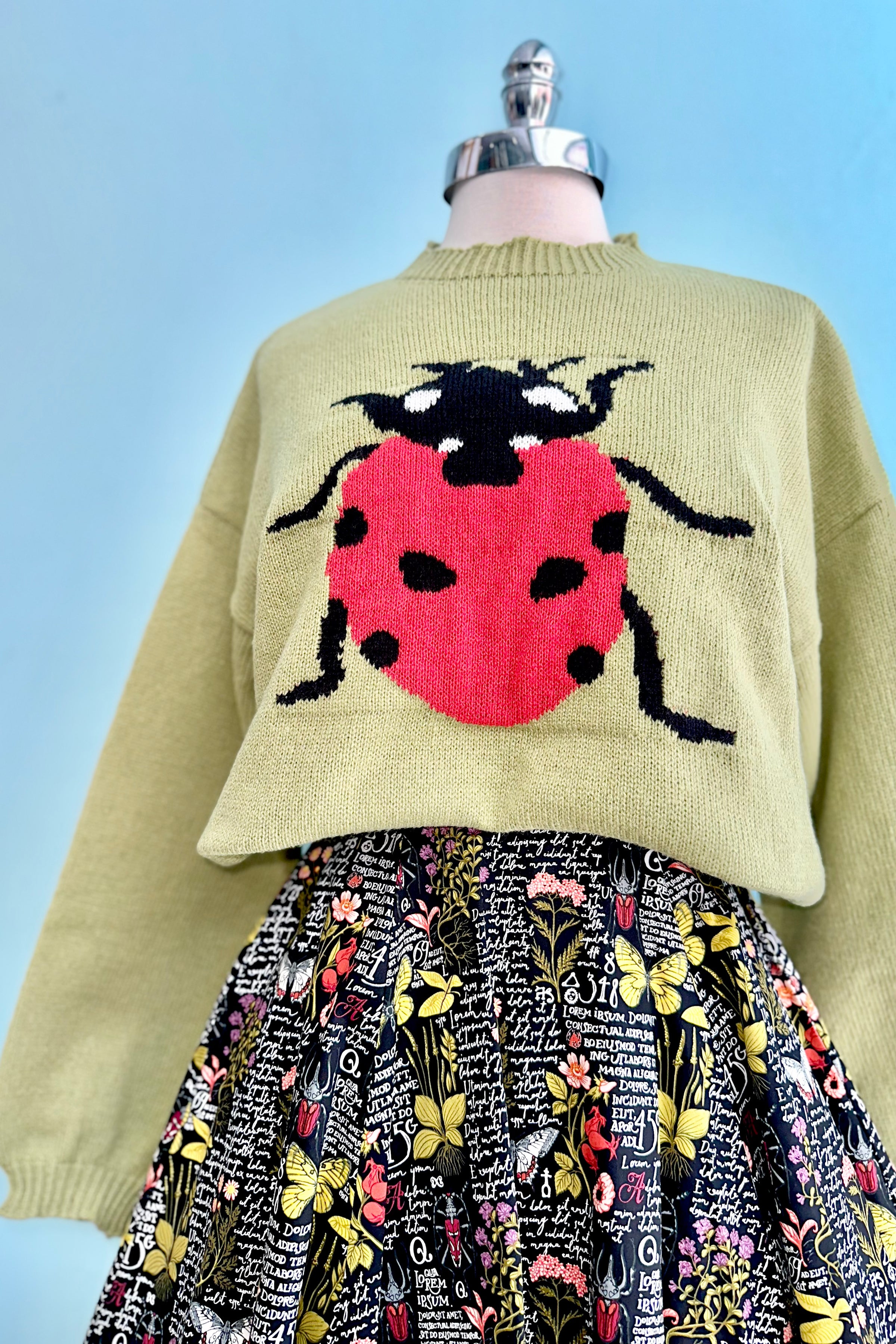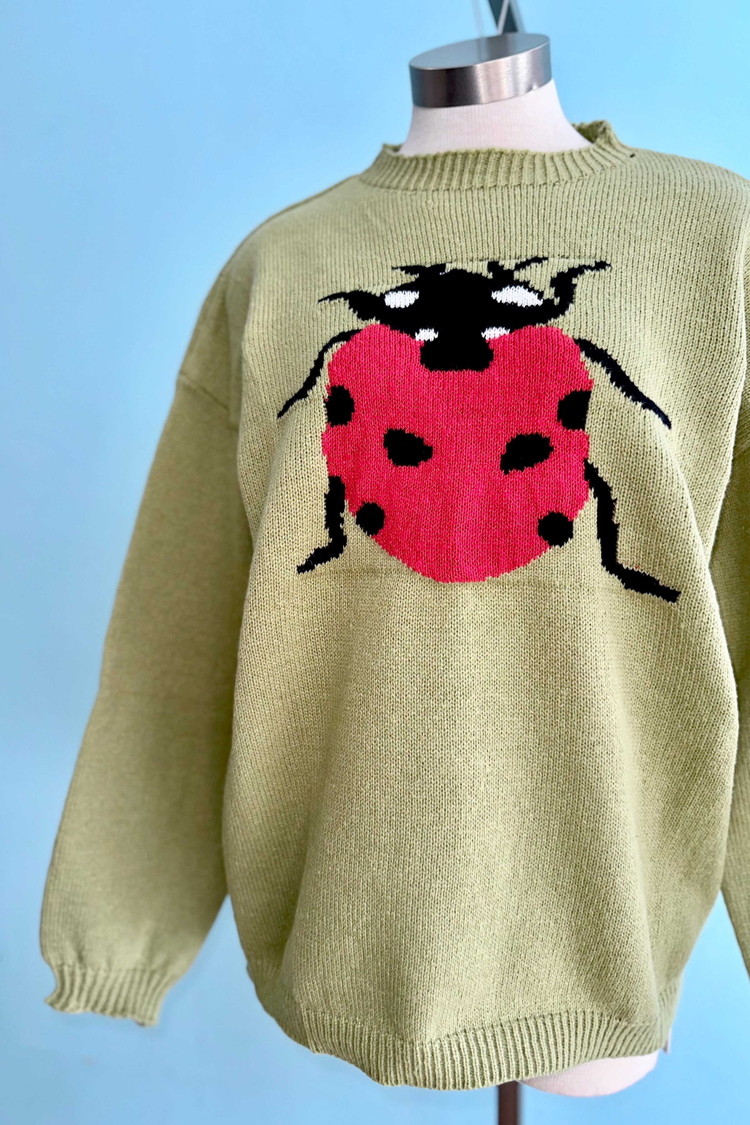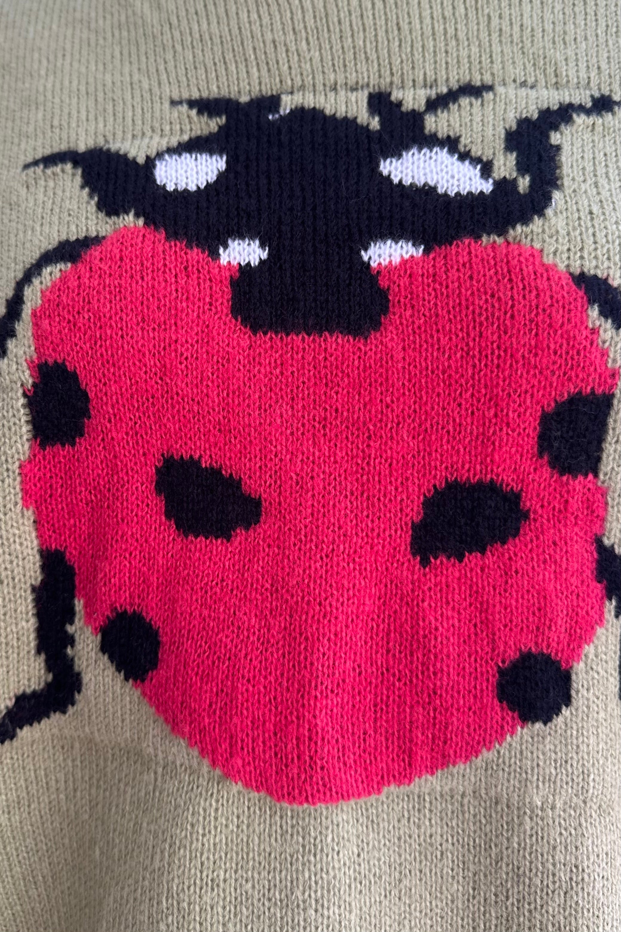 Green pullover long sleeve sweater with a rounded neck and red lady bug center. This is a loose fitting sweater.