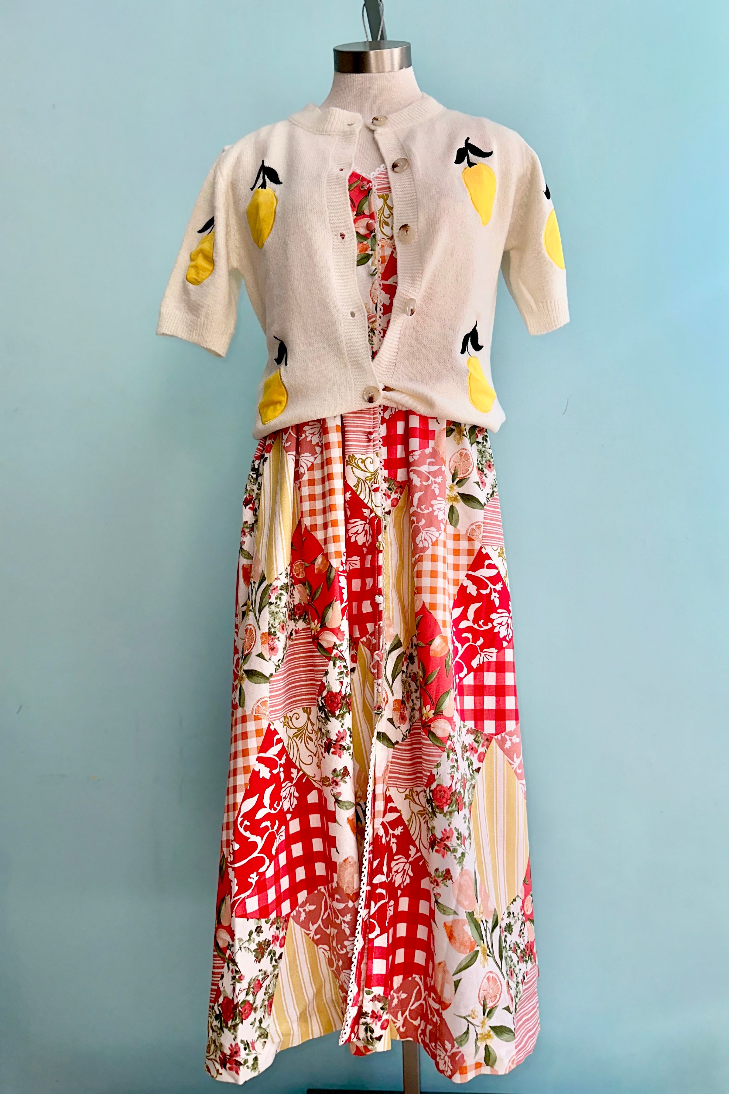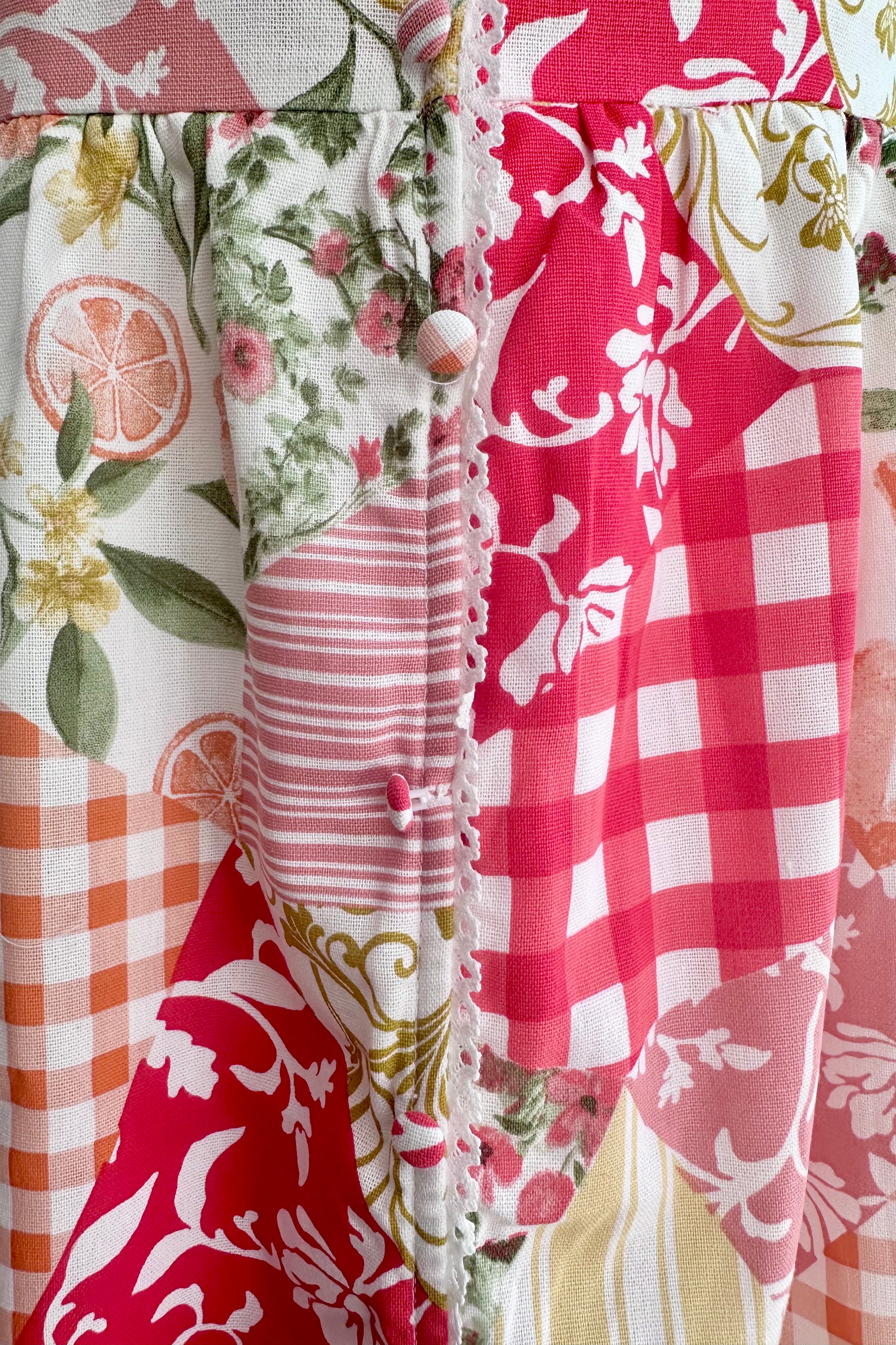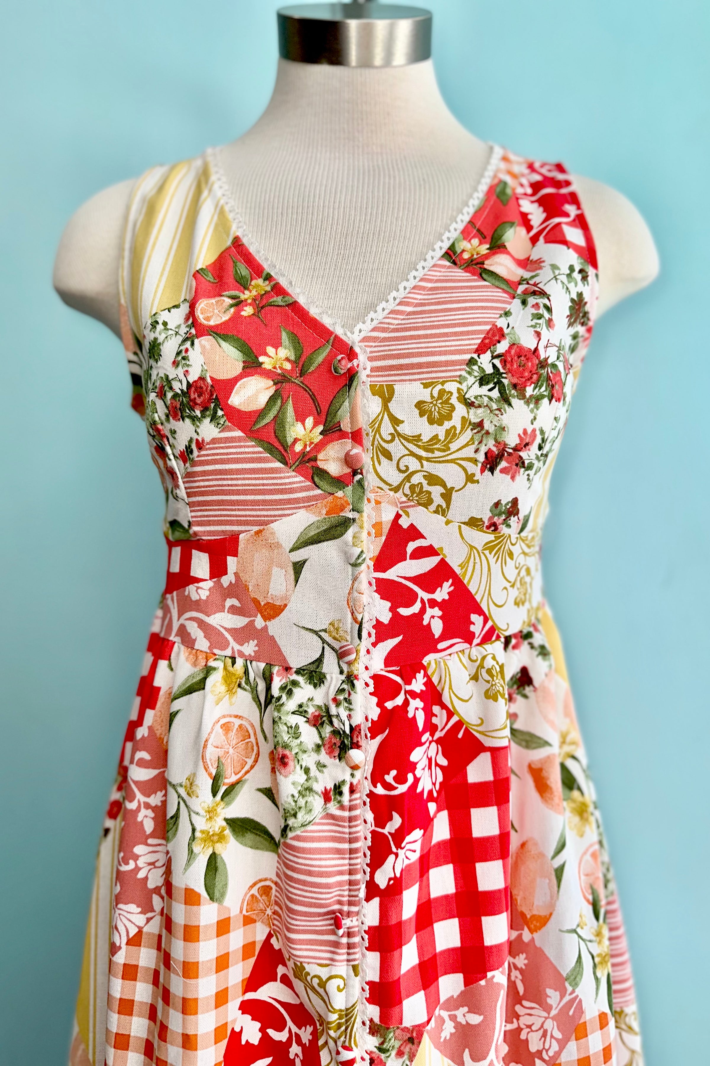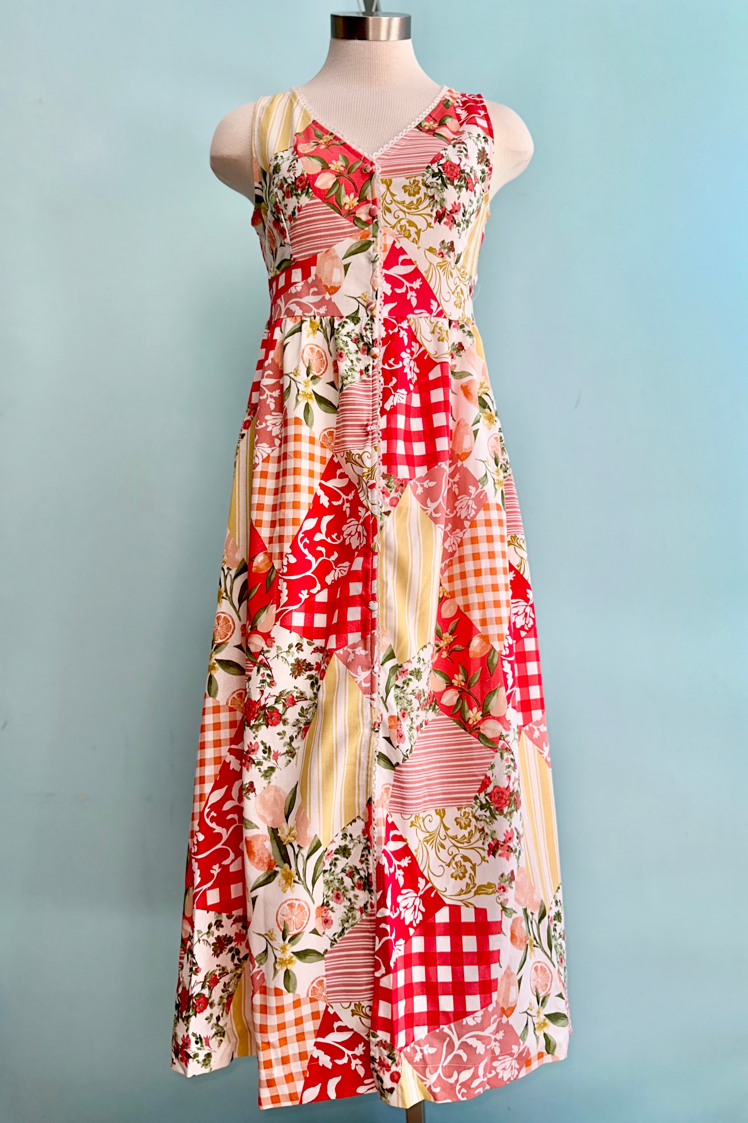 A sleeveless midi dress in white with a print of red, orange, yellow, and peach patchwork. This dress has a ivory lace trim, an elastic backed waist, and faux buttons up the front. The skirt is lined and does not have pockets.