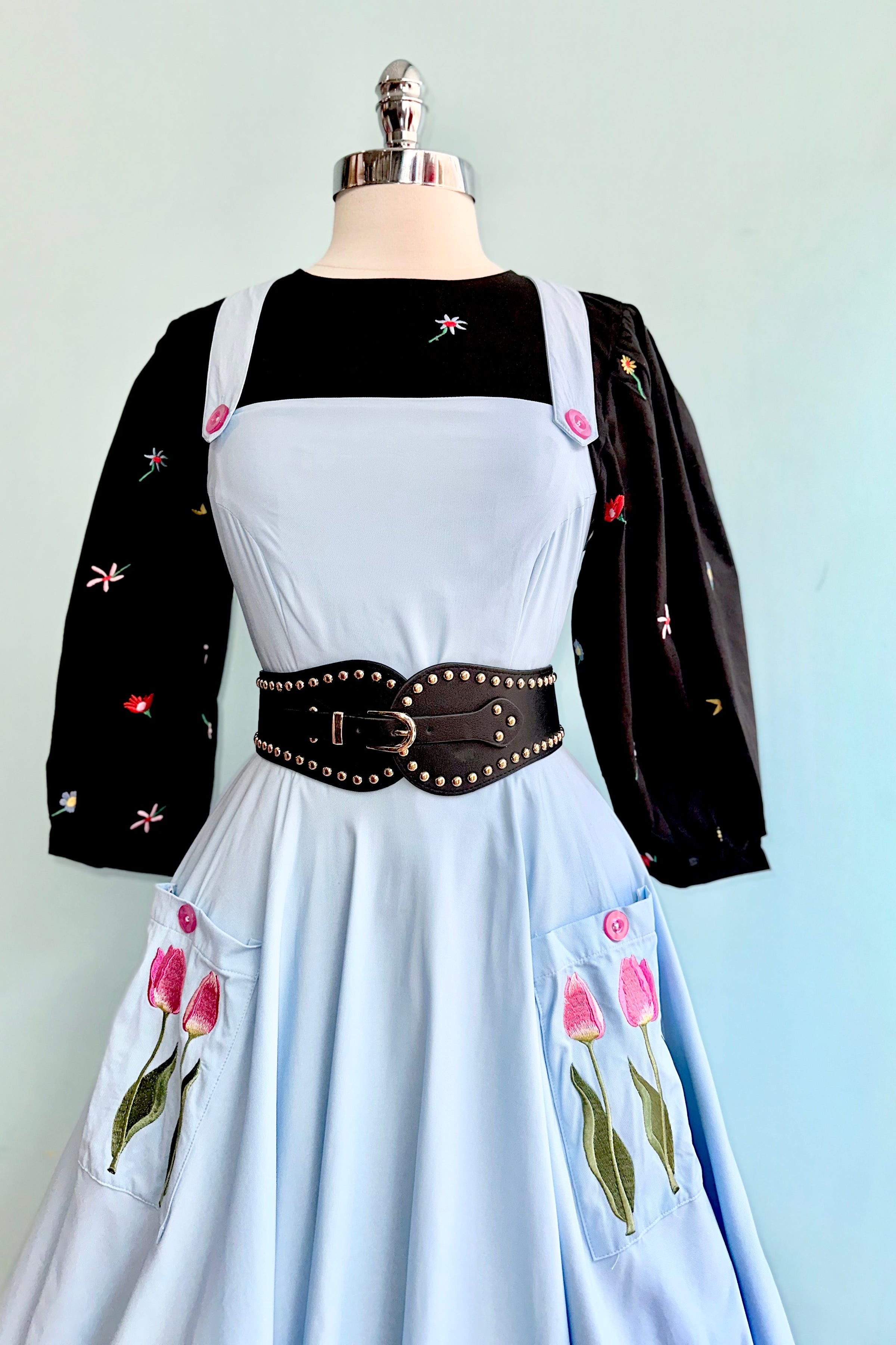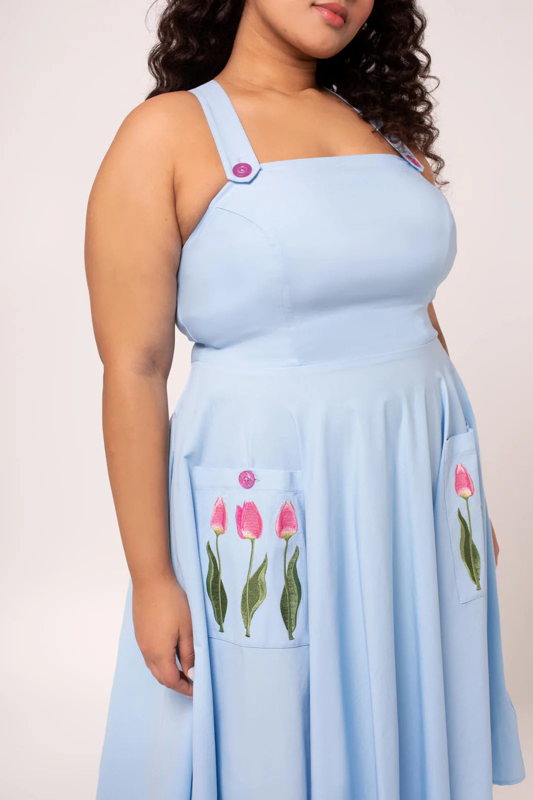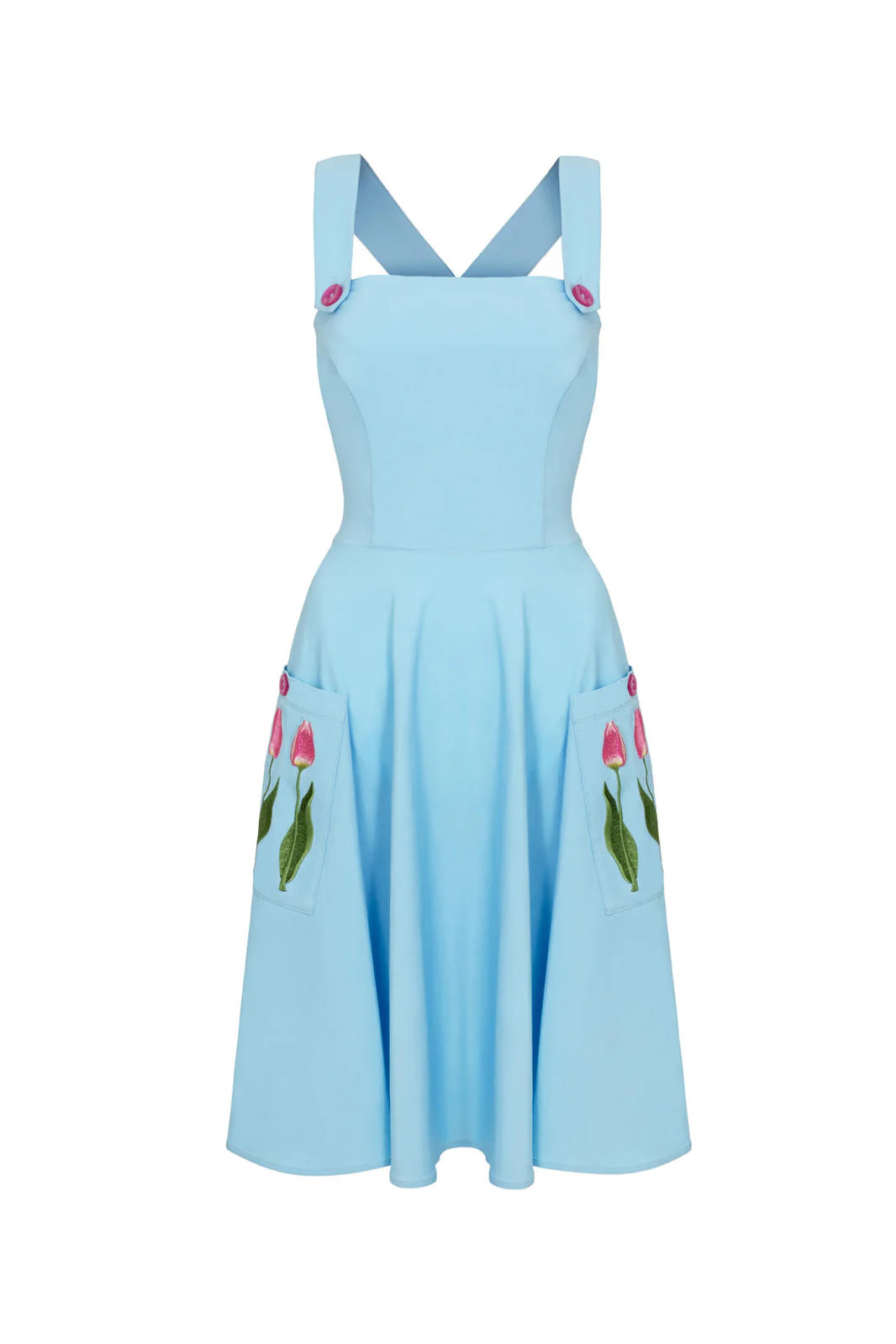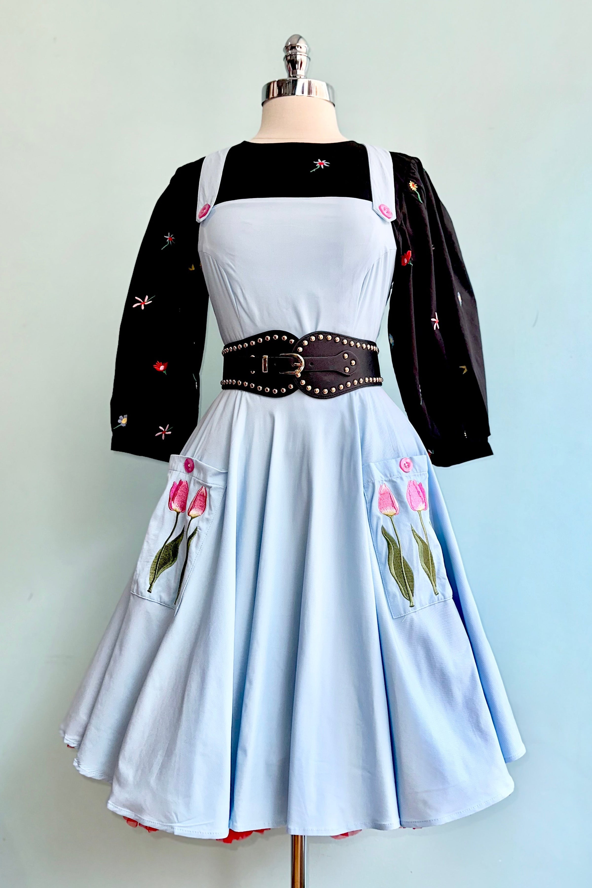 Light blue pinafore dress with tulip embroidered front pockets. This pinafore has crossover straps and a zipper up the center back. It has nice darting on the bodice for a great fit! Fabric has a good amount of stretch. Unlined.