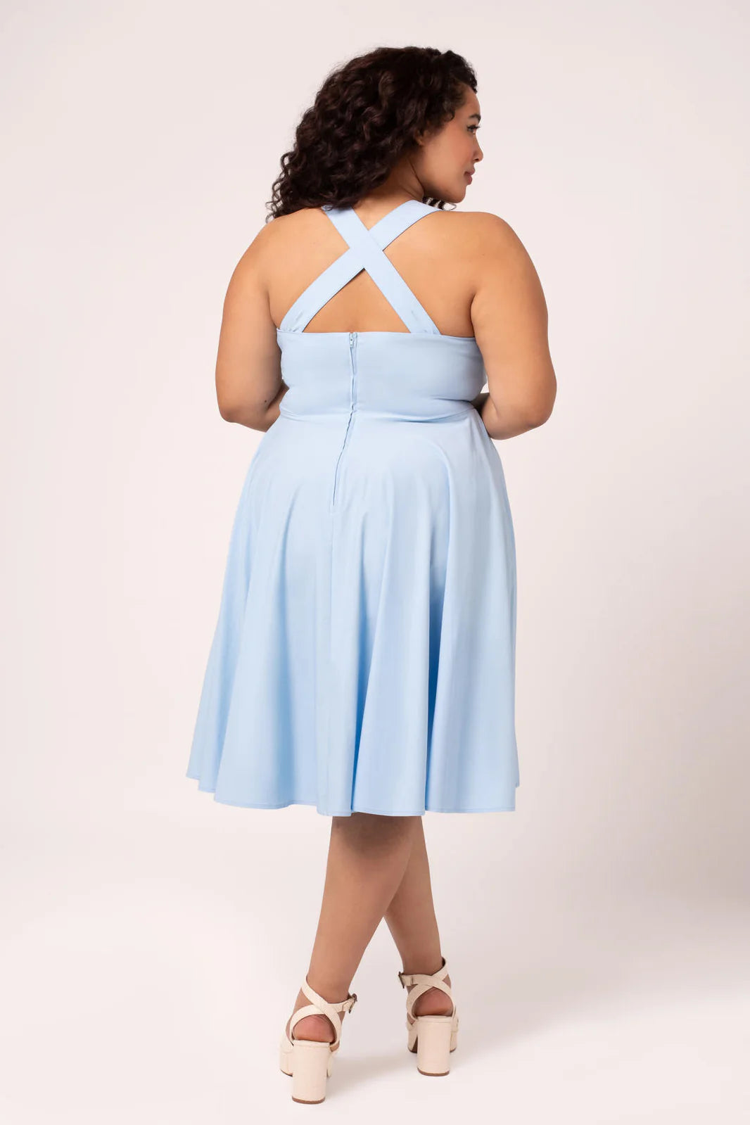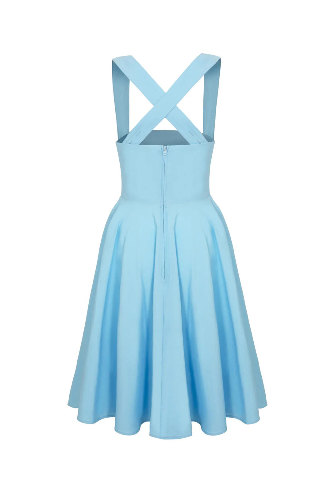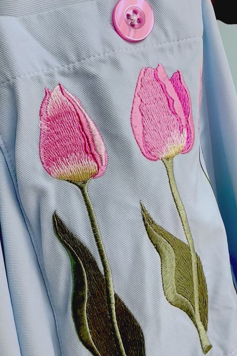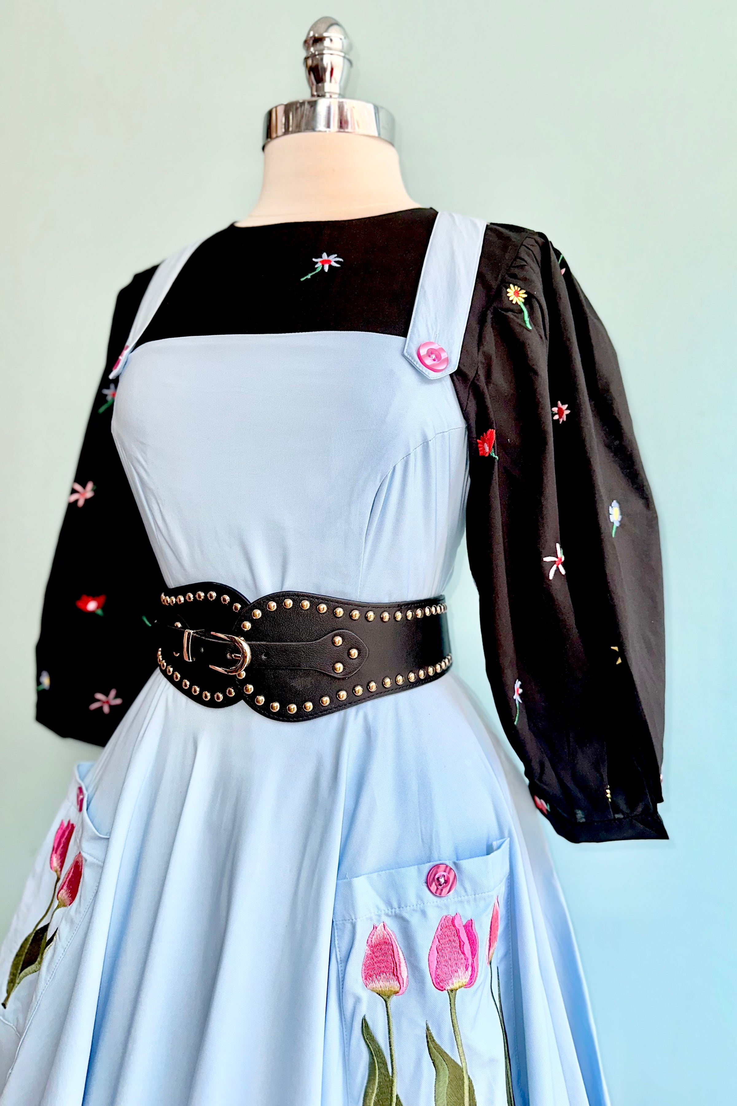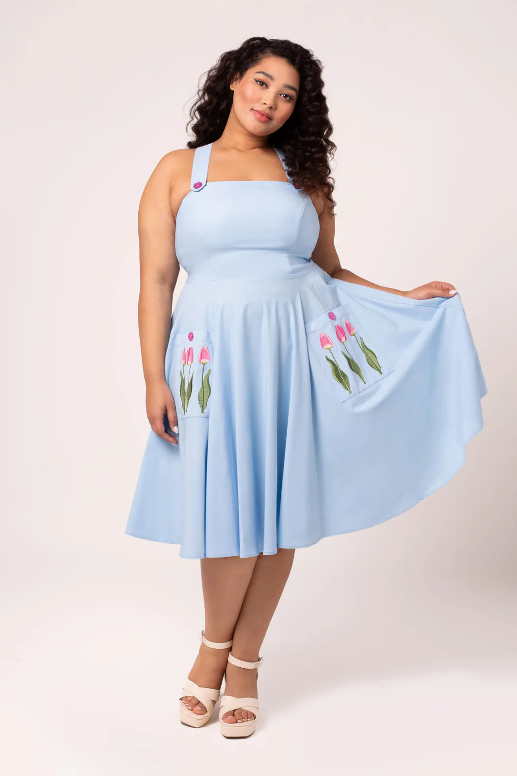 Light blue pinafore dress with tulip embroidered front pockets. This pinafore has crossover straps and a zipper up the center back. It has nice darting on the bodice for a great fit! Fabric has a good amount of stretch. Unlined.