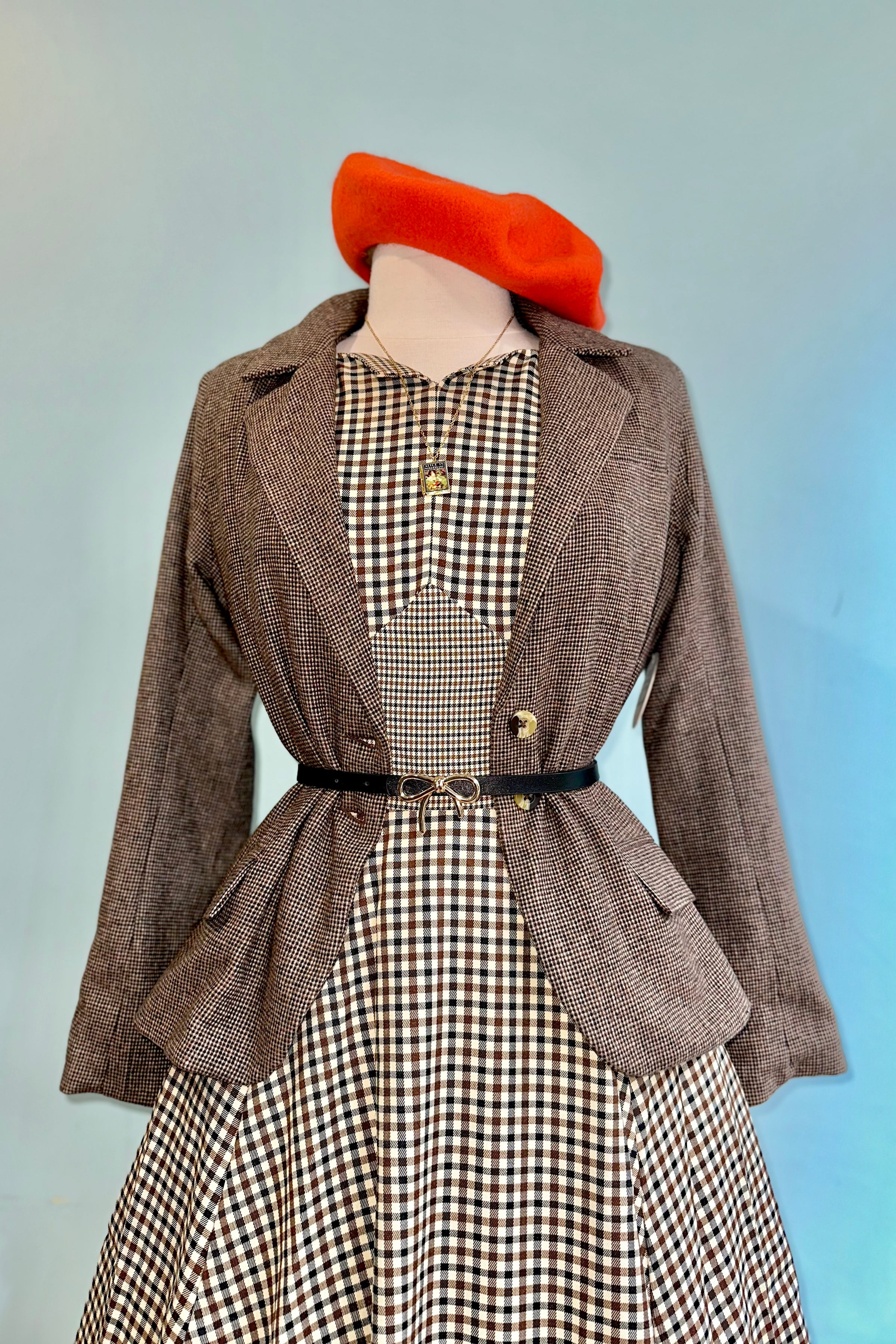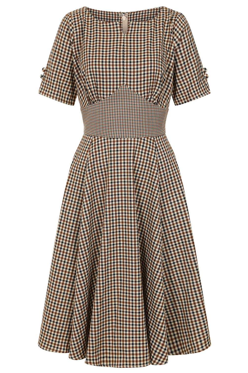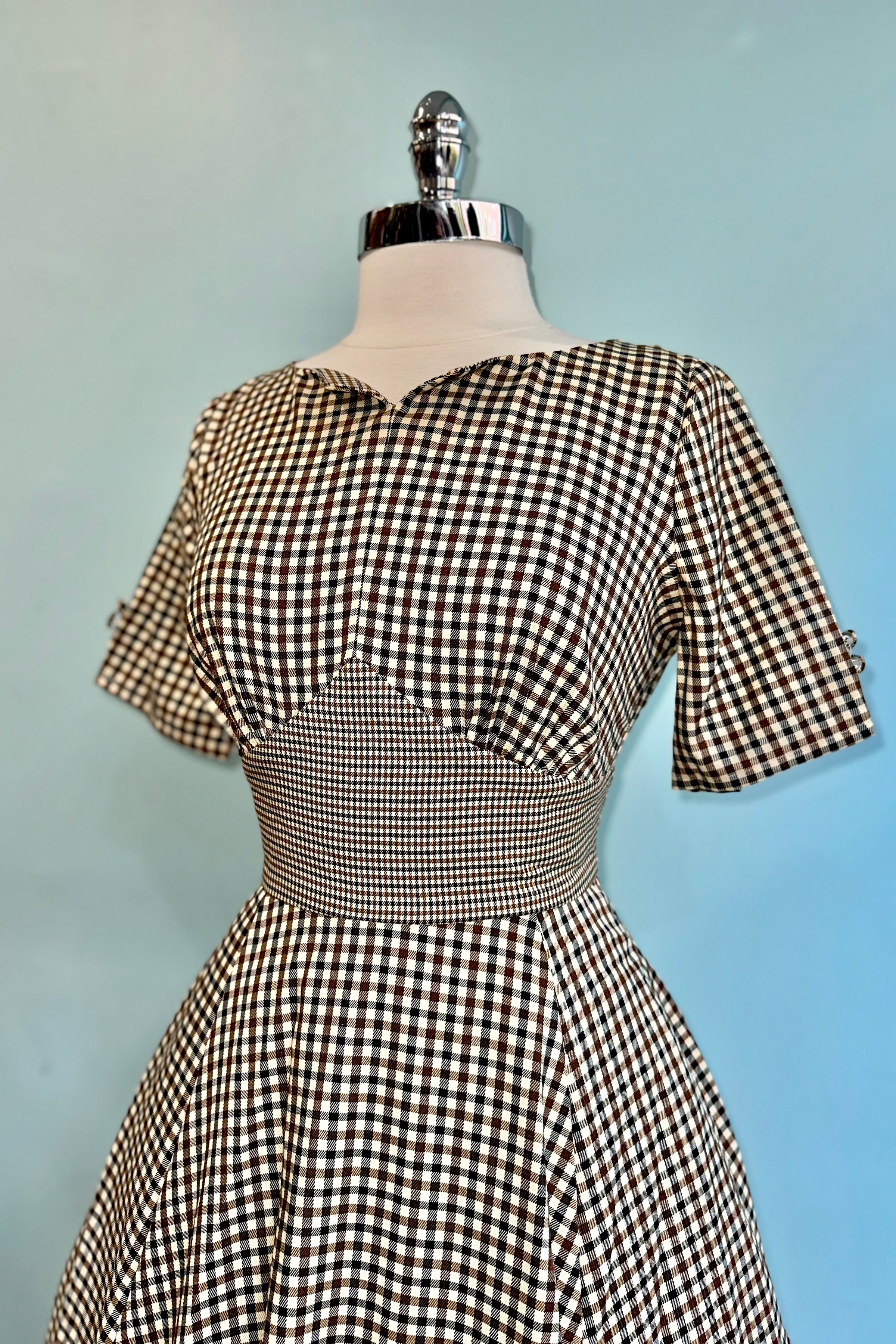 Black dress in black, beige and brown with short sleeves and a full skirt. This dress has a boat neck with a notched collar. The waist has an inset panel with gathering under the bust. The skirt is a circle with side pockets. There is a back zip closure.