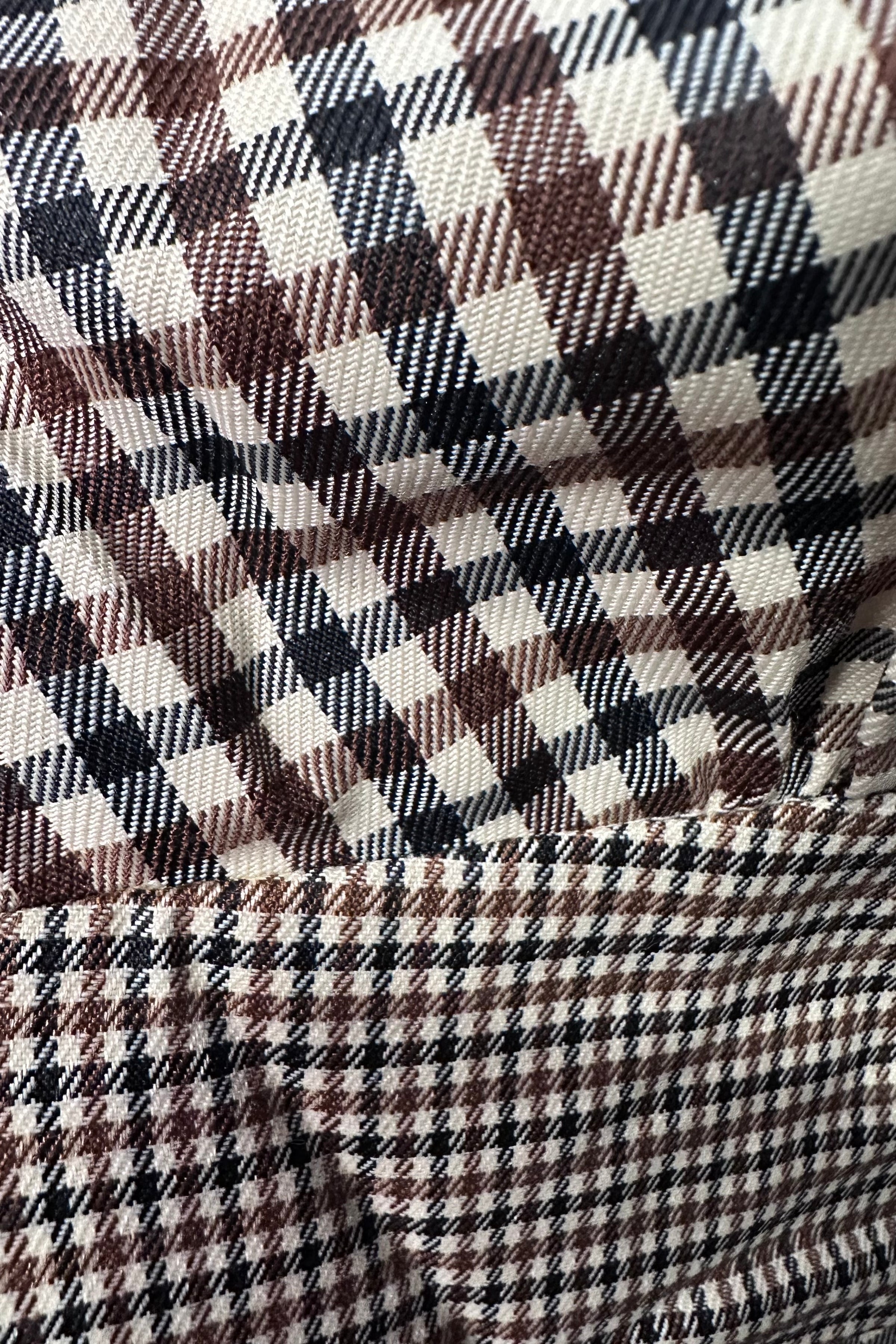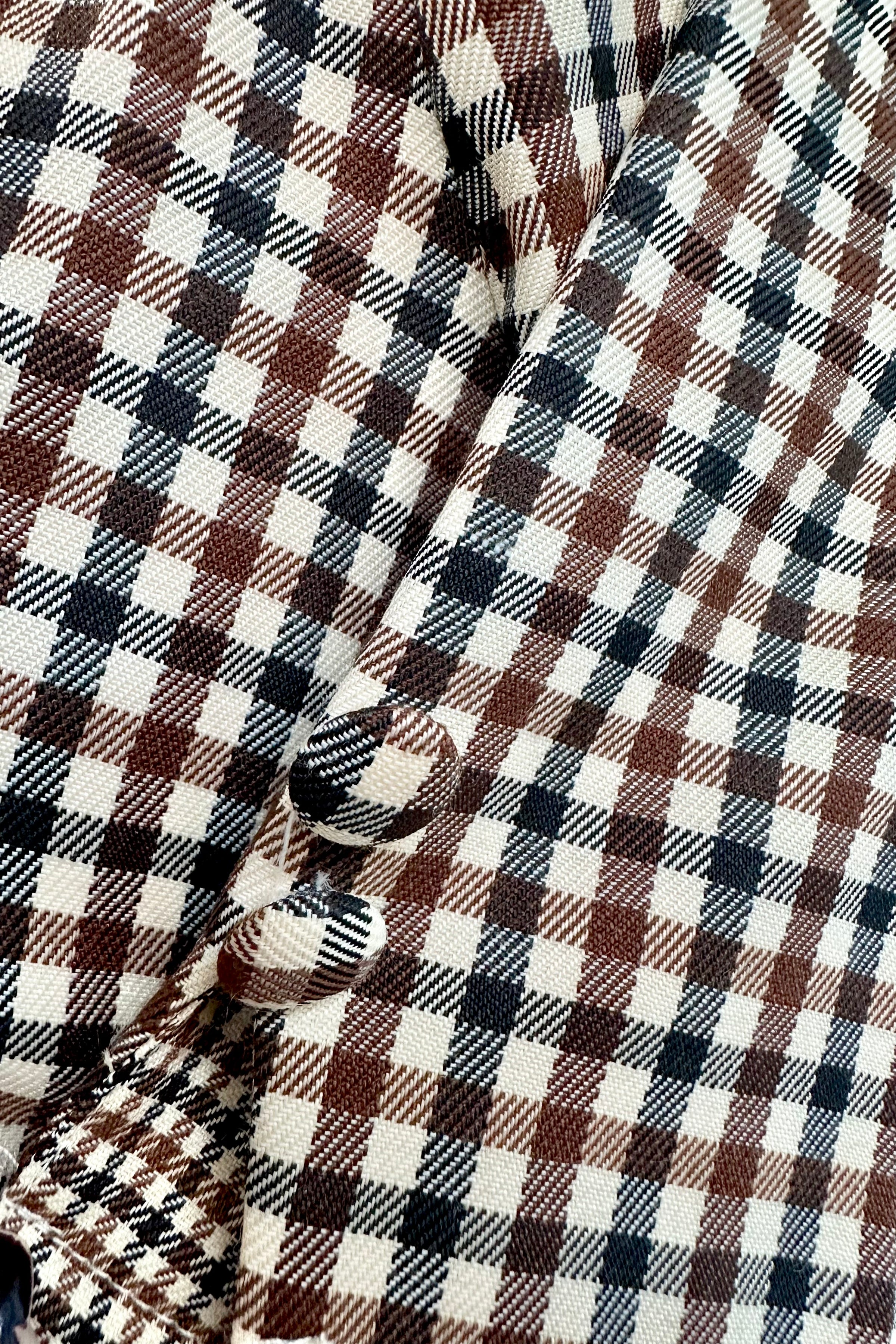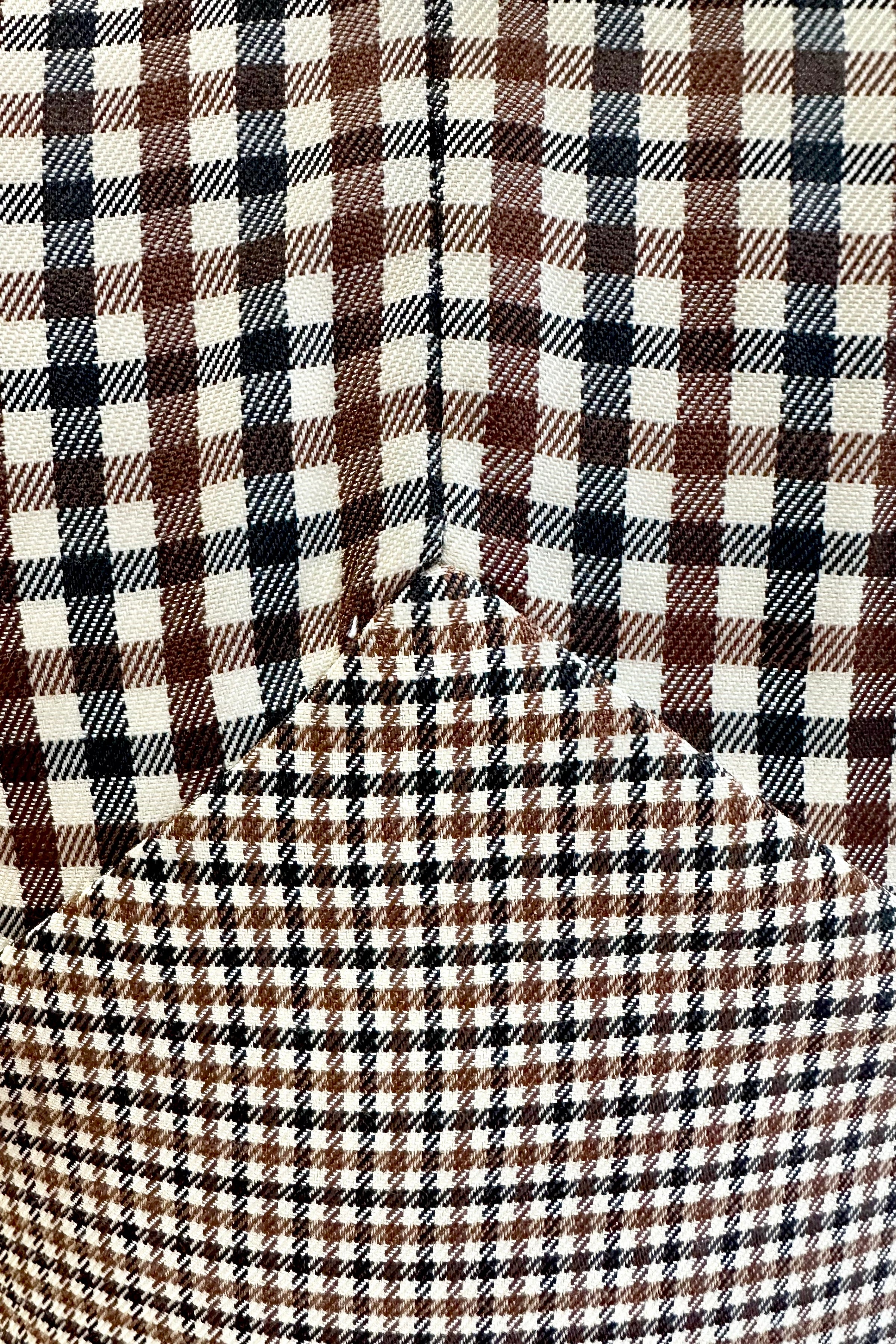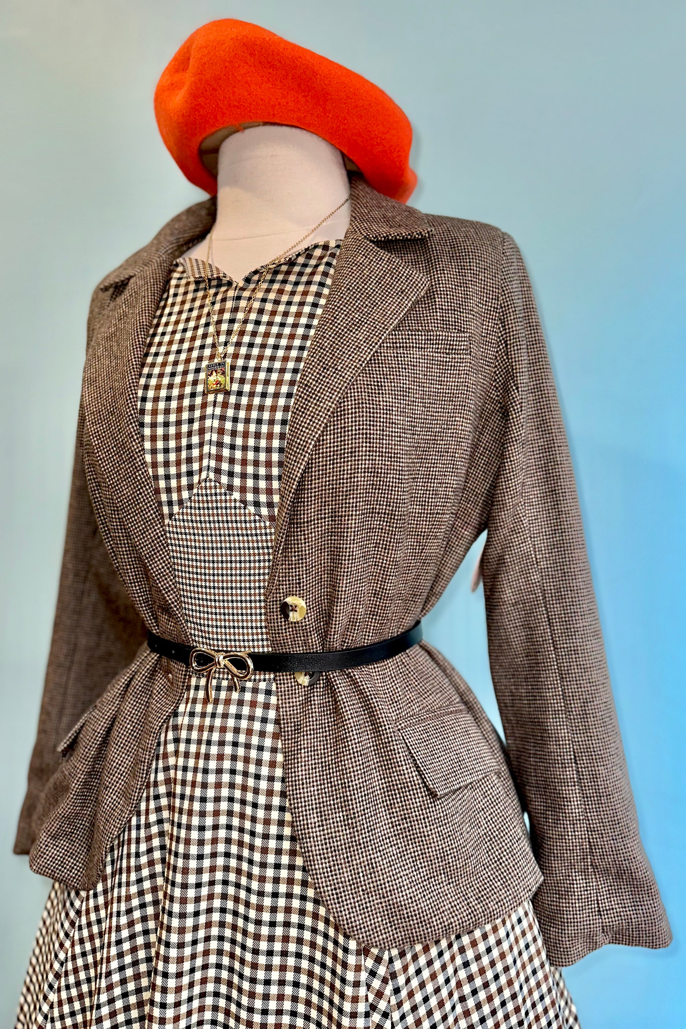 Black dress in black, beige and brown with short sleeves and a full skirt. This dress has a boat neck with a notched collar. The waist has an inset panel with gathering under the bust. The skirt is a circle with side pockets. There is a back zip closure.