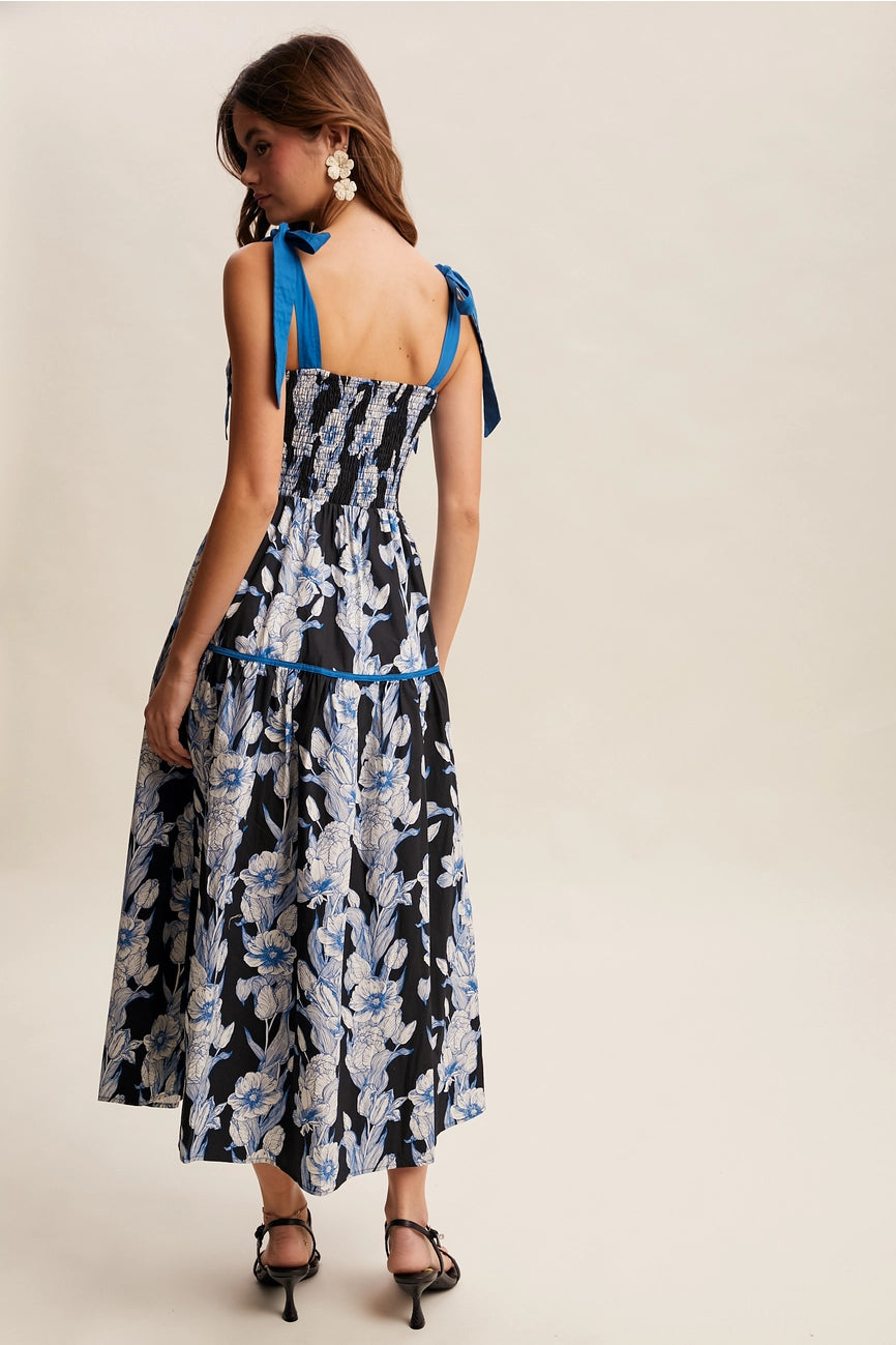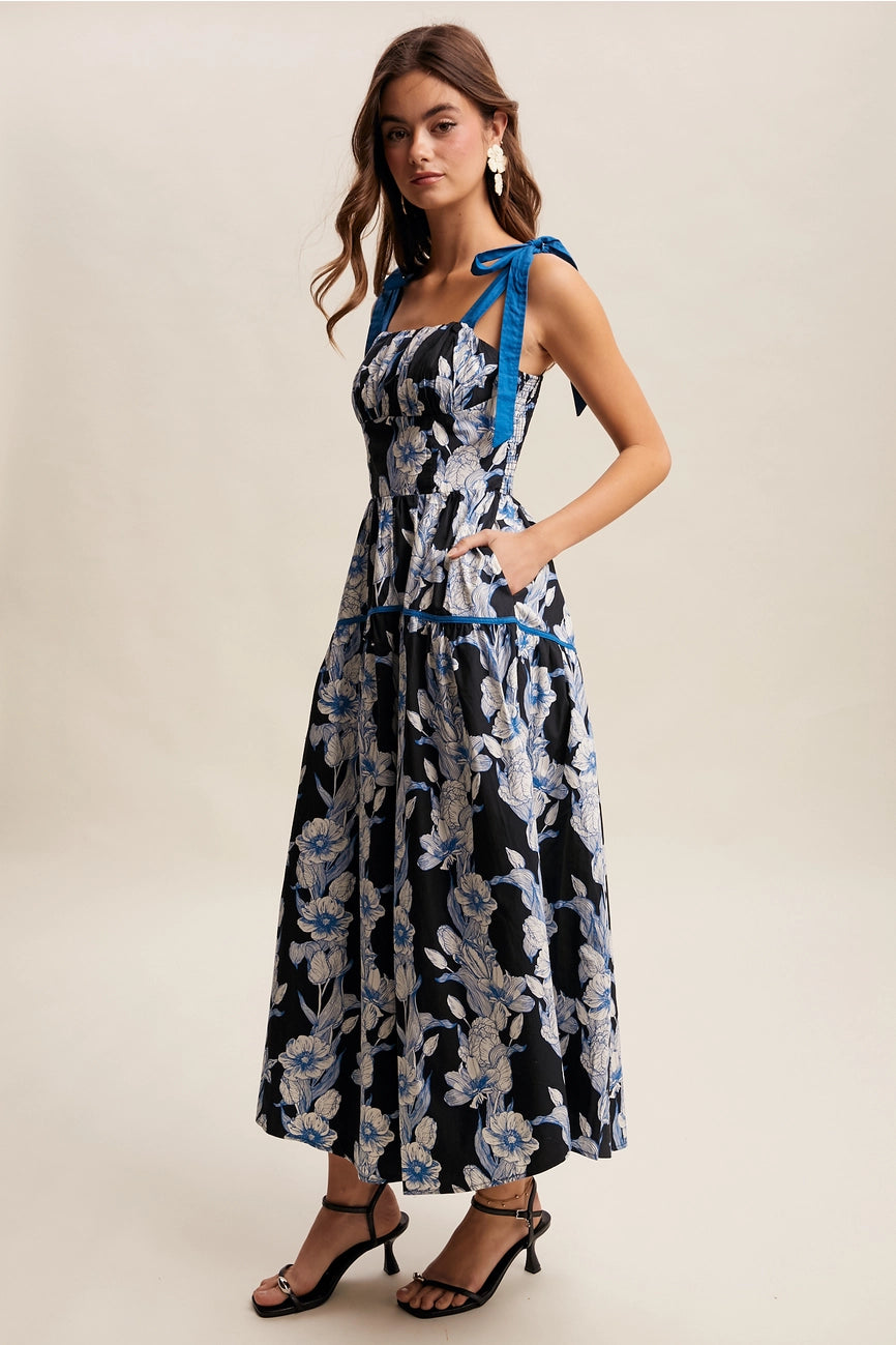 Lightweight woven dress in an airy, breathable material with a soft, flowy drape. This dress is fully lined and has adjustable tie shoulders with wide self-ties. The bodice has a shirred back panel and a tiered maxi skirt with side pockets. Made of a blue floral print on black fabric.
