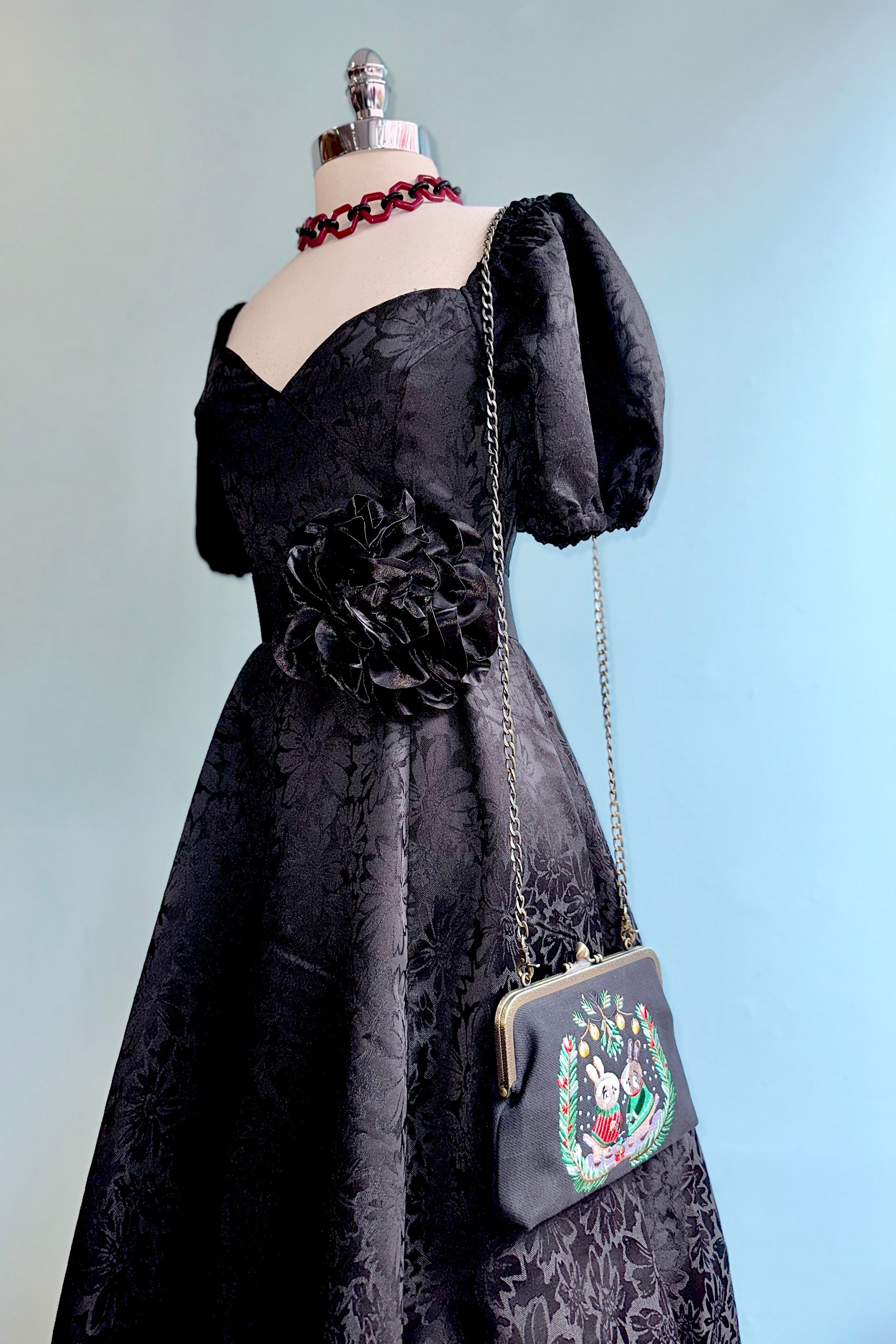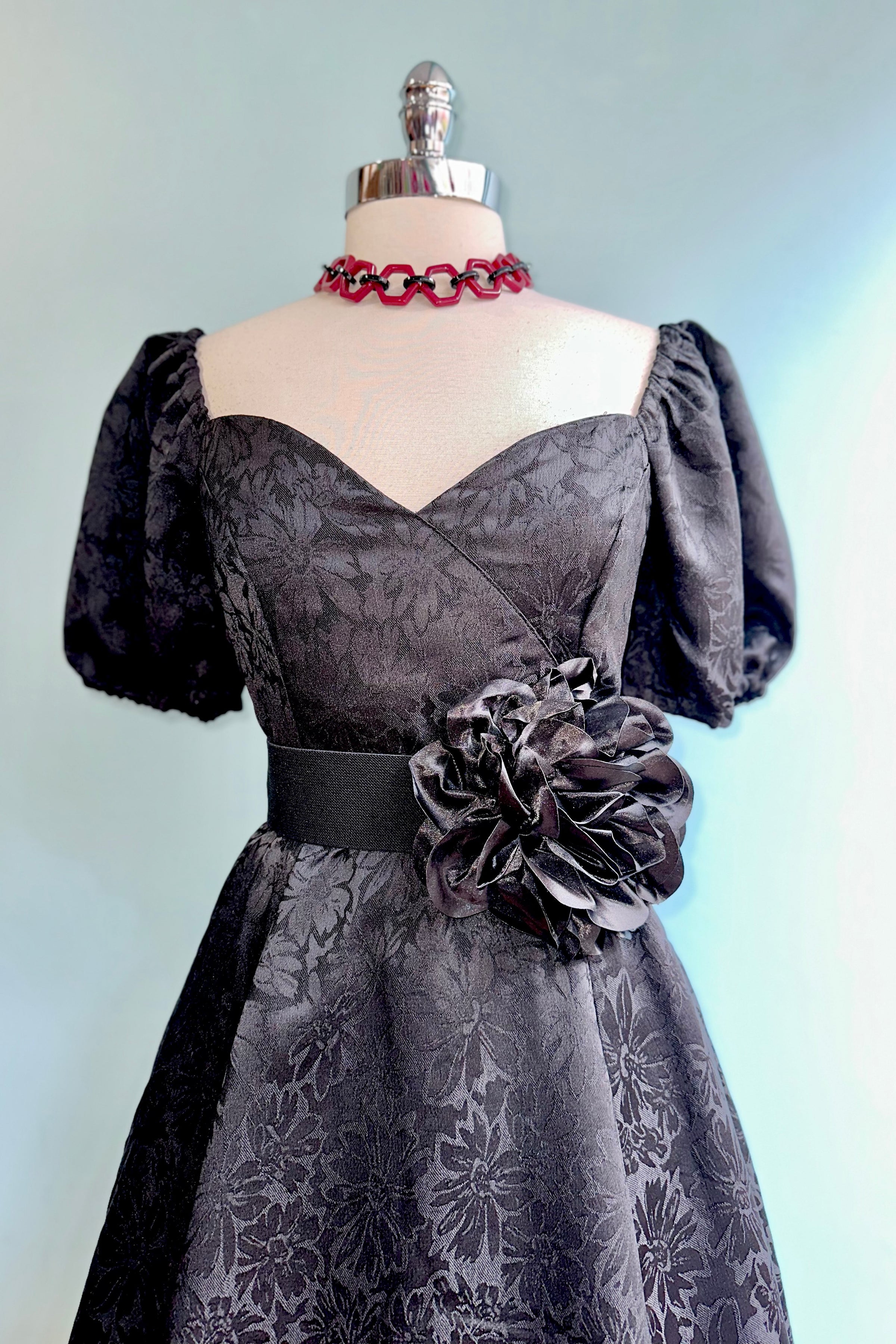 This dress has short sleeves with a little puff at the shoulders. The back zips up, it is not lined, and has pockets.