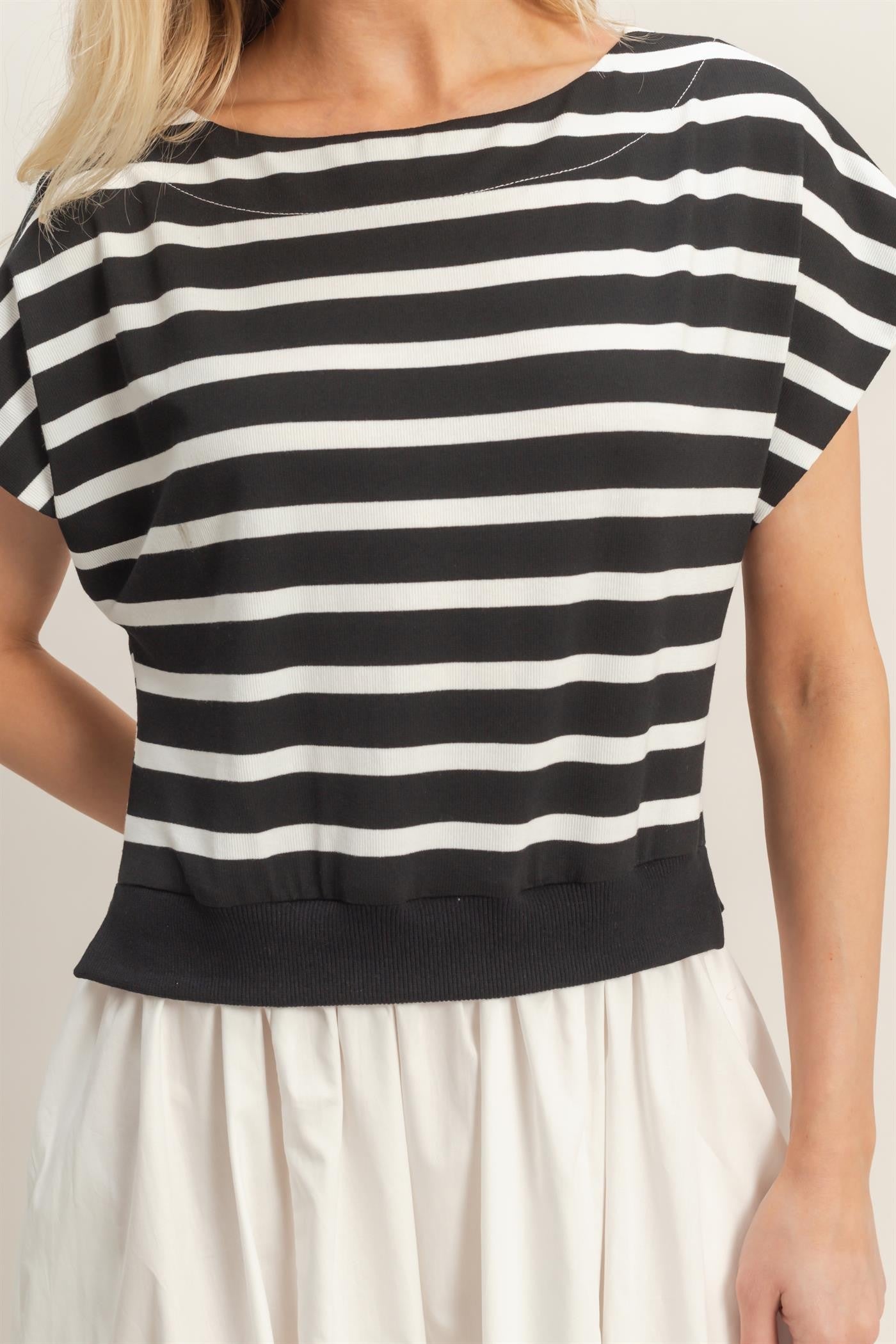 This striped midi dress features a crew neckline and short sleeves. The ribbed waist accentuates its relaxed fit, while the flowy skirt creates an elegant silhouette. This dress is unlined, and has side seam pockets. The fit is oversized so we suggest sizing down if you would like a tighter fit.
