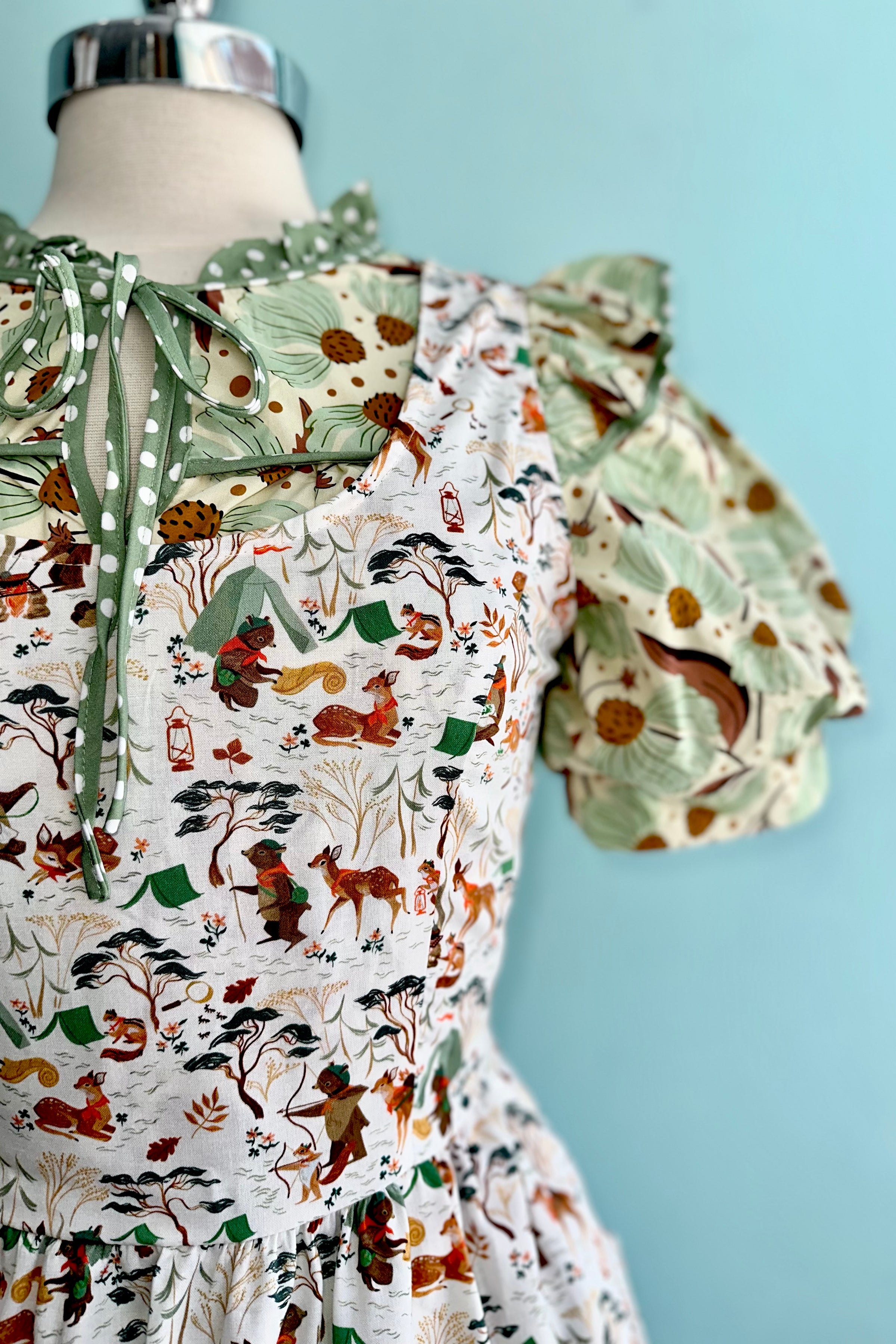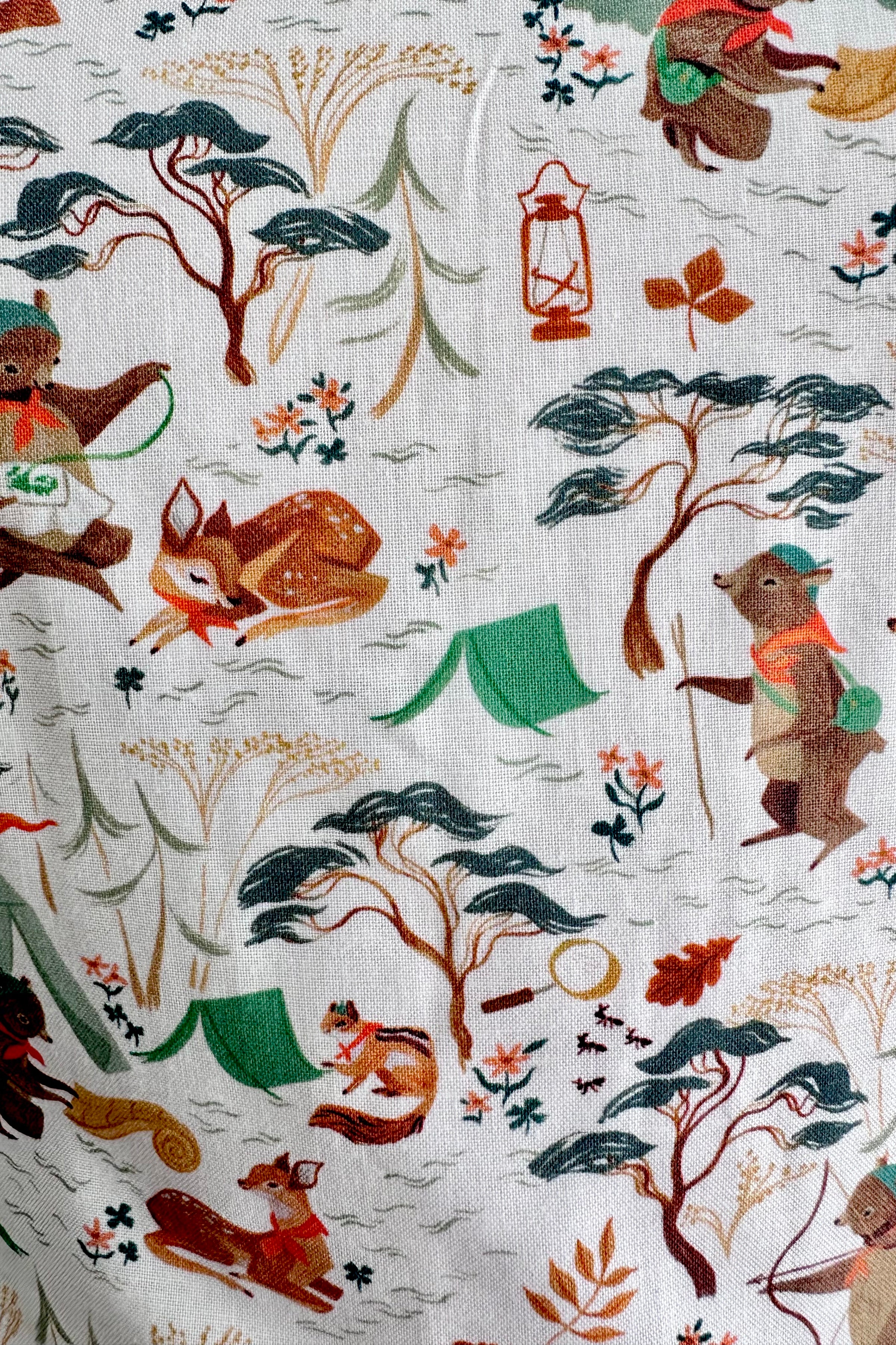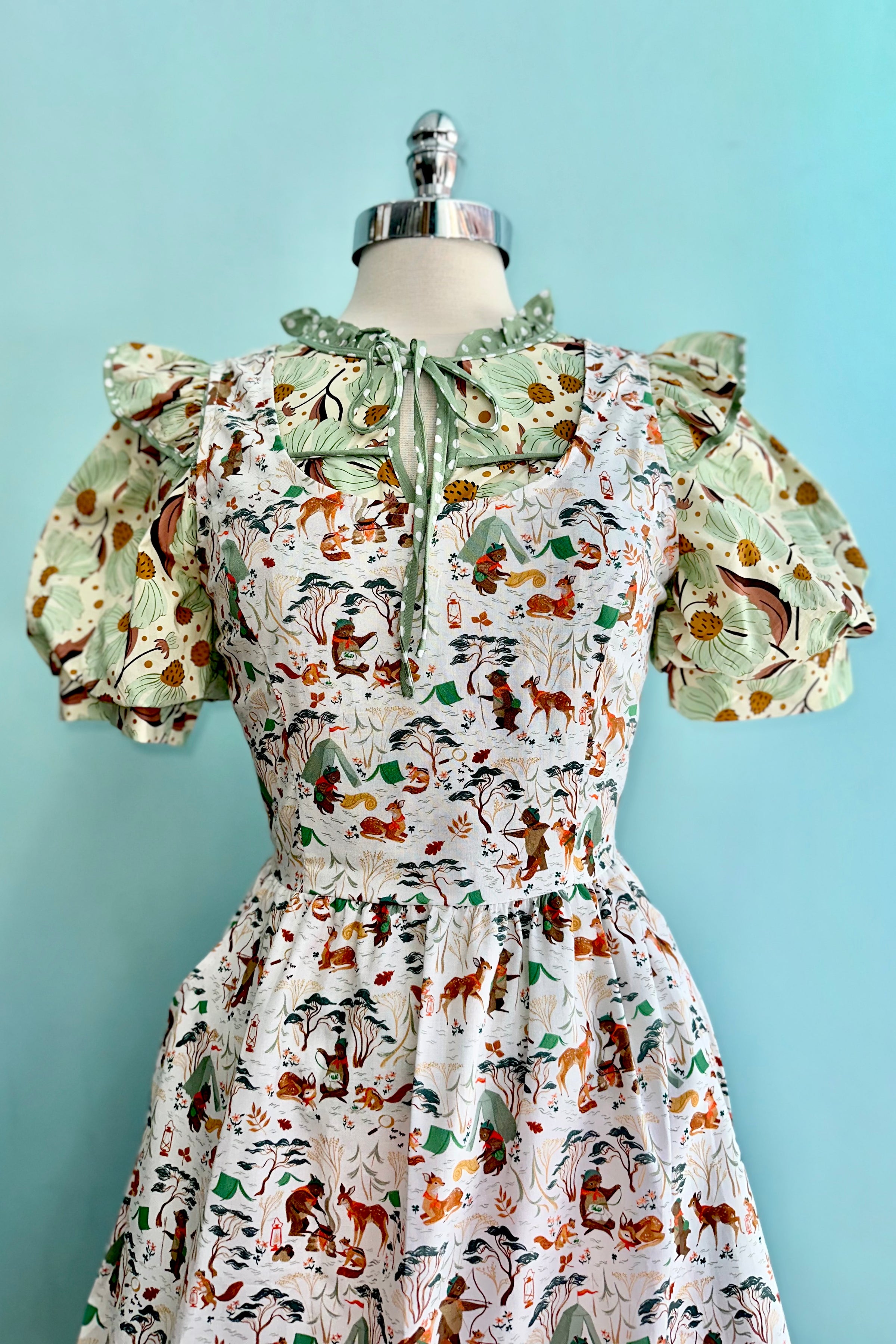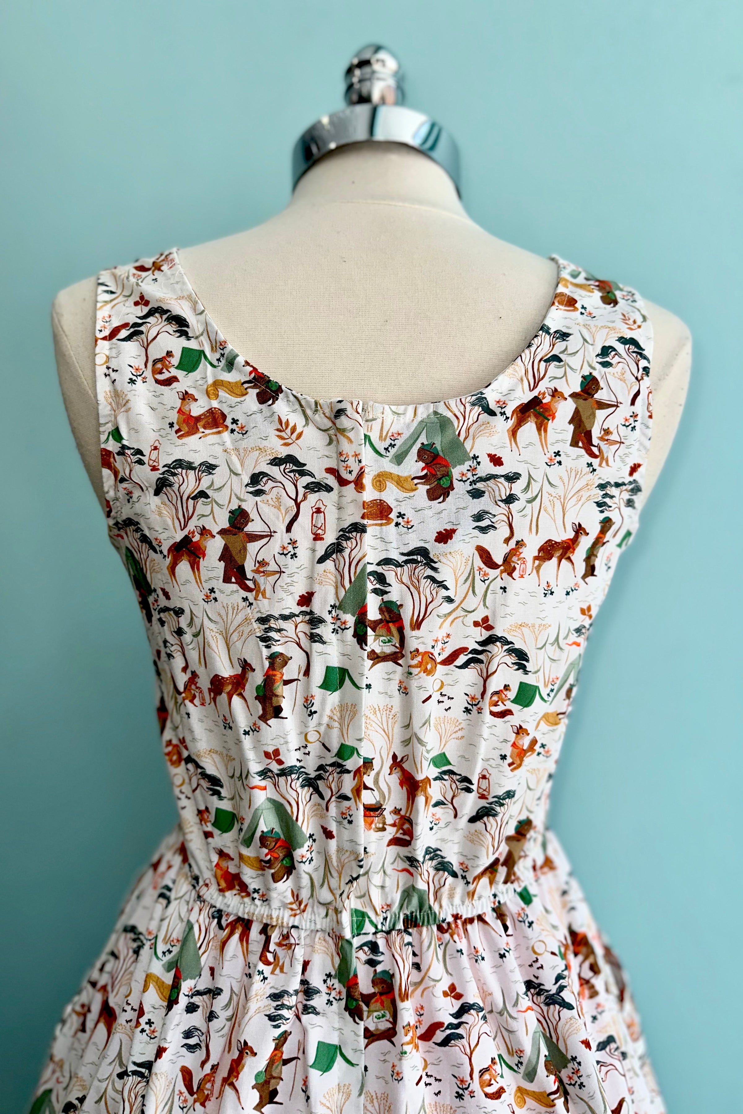 Made of 100% cotton and a great layering piece! The fabric background is white with a camping bear, deer and squirrel print. The back waist is elastic for added comfort and the neckline is a slight scoop. This dress has pockets on the side and zips up the back!