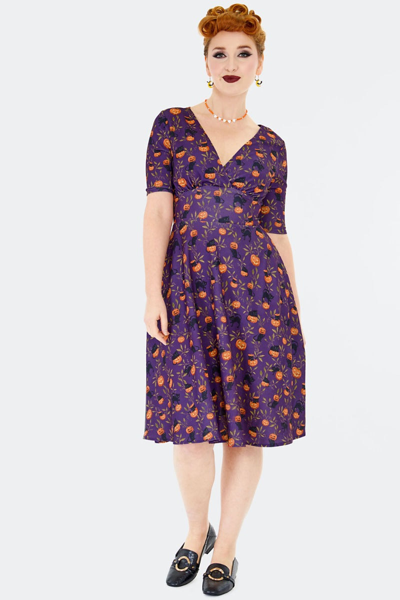 Purple dress with a print of Jack O' Lanterns and black cats. Features a faux wrap style V-neckline and elbow length sleeves. The skirt is full with side seam pockets. Unlined.