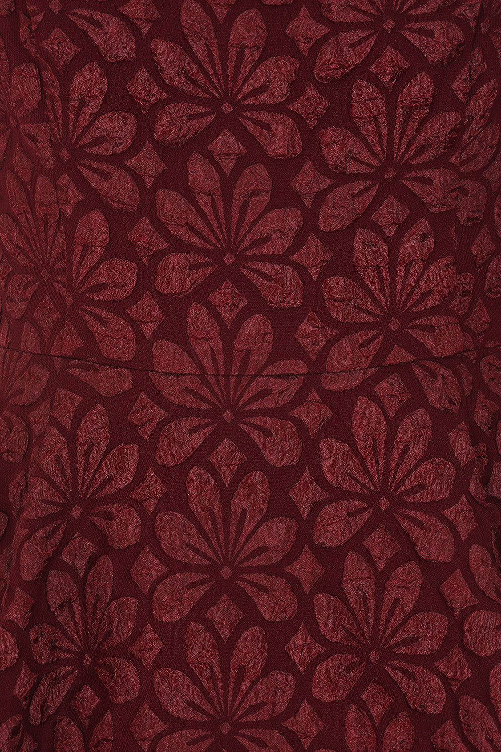 Step into timeless elegance with our vintage-inspired Thea Swing Dress with Bolero, crafted in a rich wine hue and adorned with an exquisite embossed floral print. The dress features a flattering fitted bodice that accentuates the waist, flowing into a full swing skirt for graceful movement. A refined lapel neckline adds a touch of retro charm, while the included matching bolero completes the look with sophisticated flair. Perfect for special occasions or making a stylish statement any day of the week.