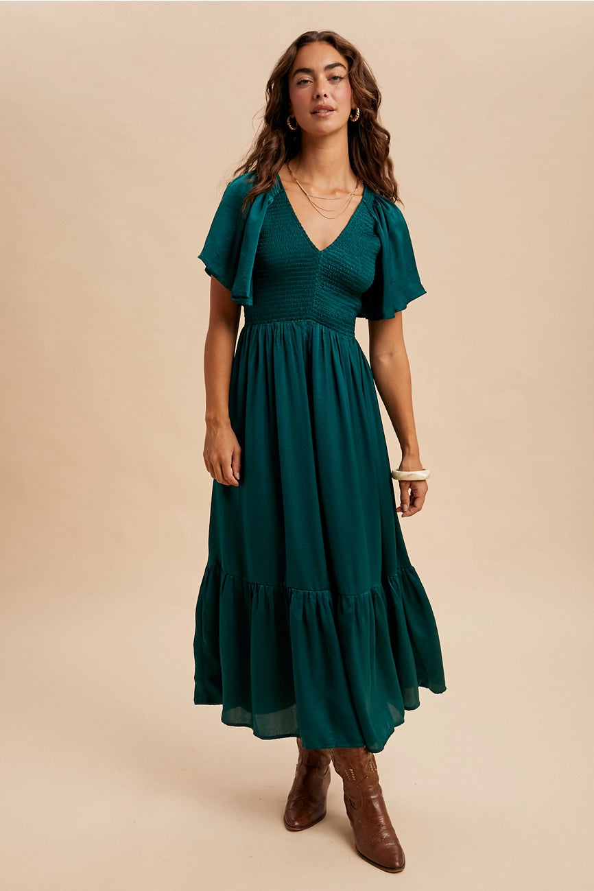 Easy to wear midi dress with a smoked bodice and a v-neckline. This dress has flutter sleeves and a midi length skirt with a tiered hem.