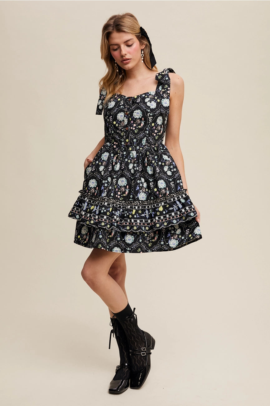 Sweetheart neckline mini dress with adjustable shoulder straps and a tiered ruffle skirt. This dress has an allover floral print that is vintage-inspired in soft tones with a black background for a dreamy cottage core vibe. Faux button placket front bodice and a