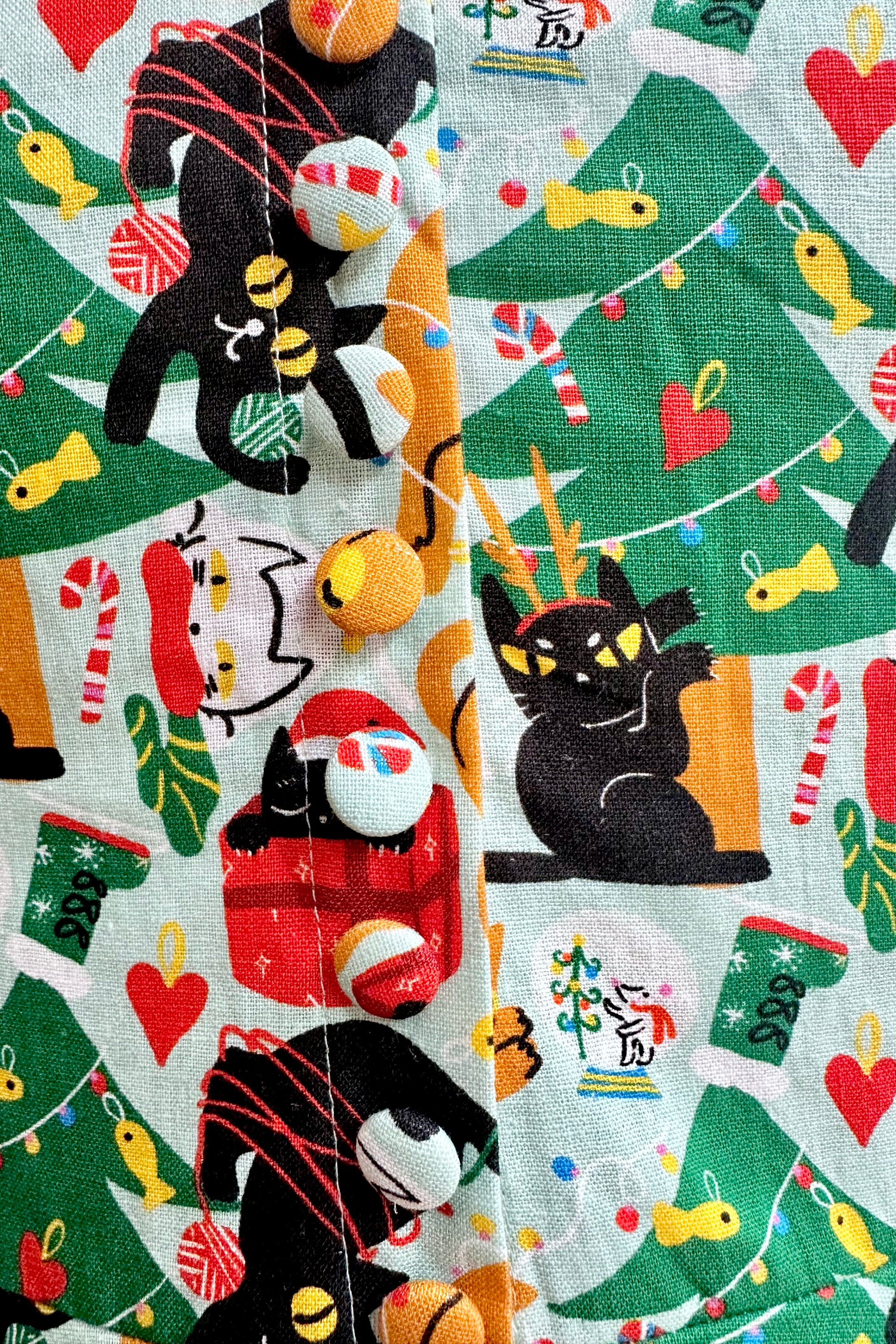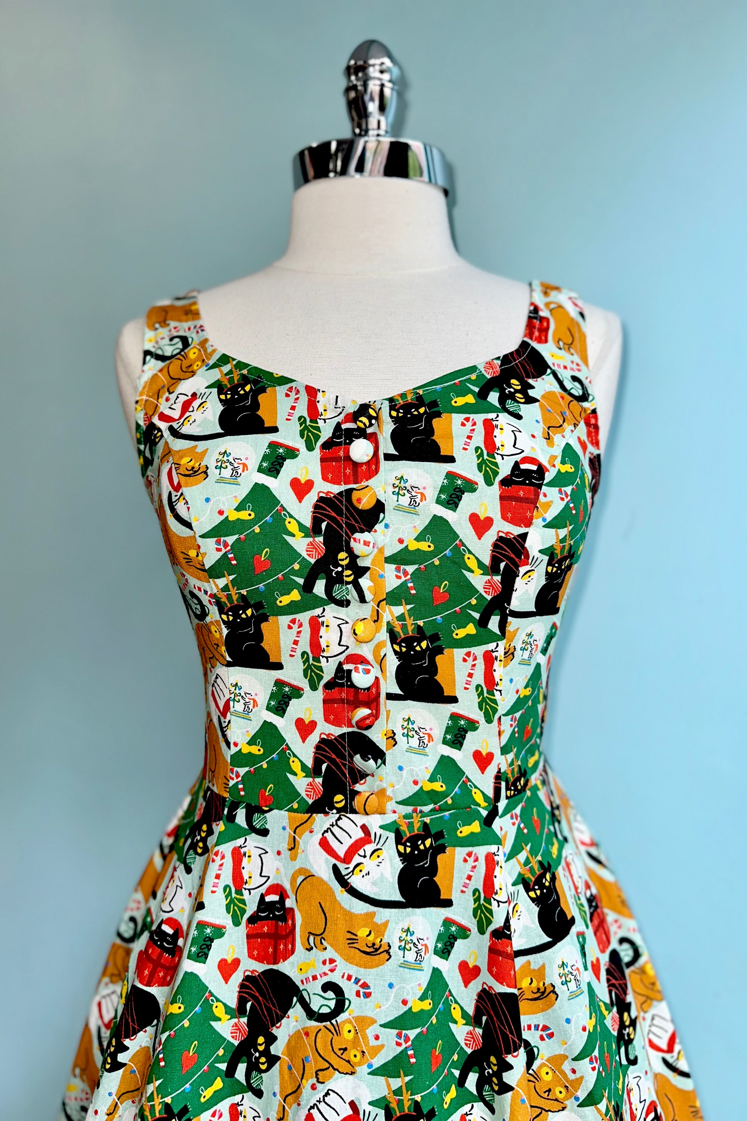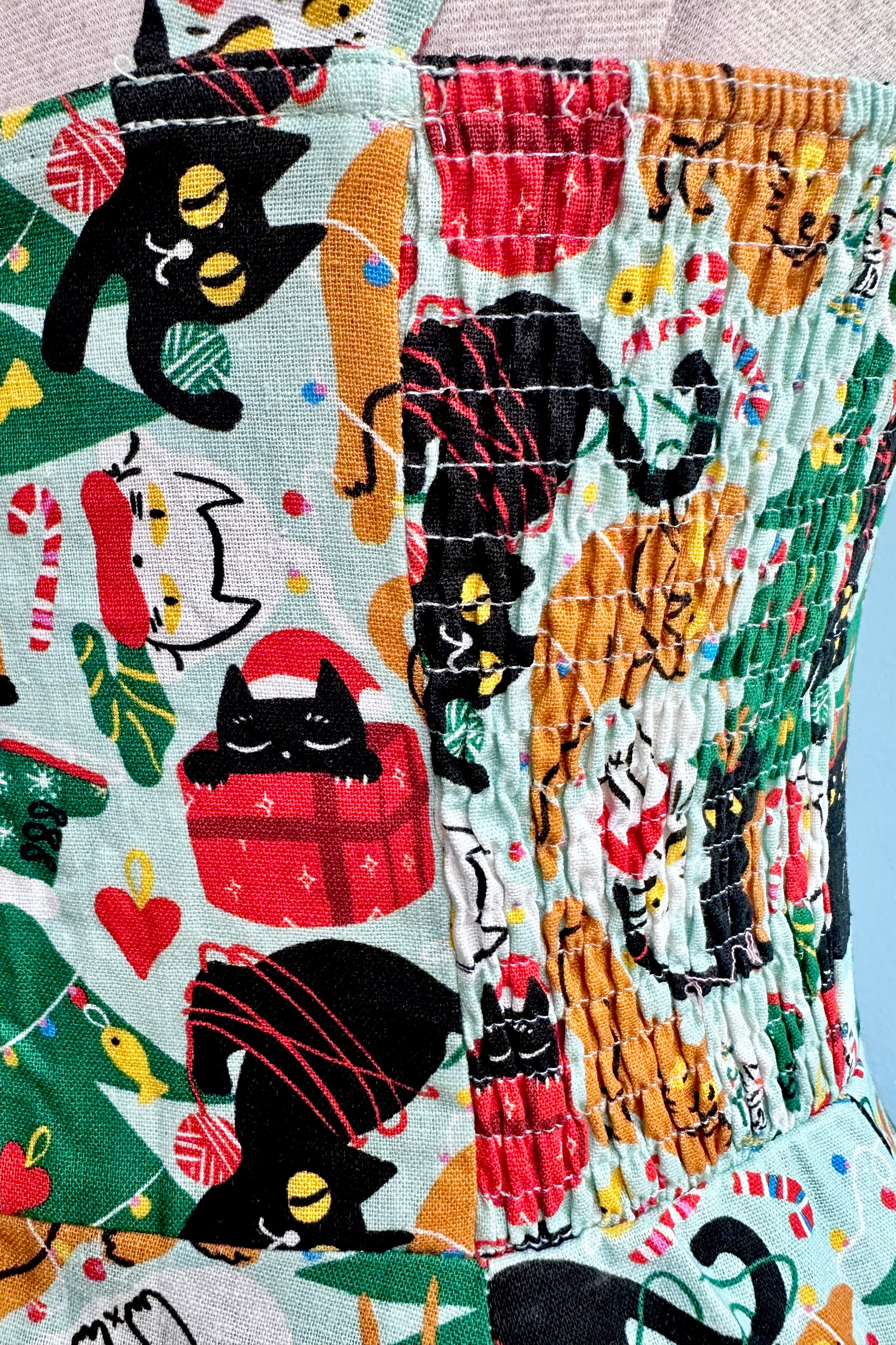 Cat Christmas themed dress with mischievous kitties! The Heidi is a sleeveless dress with a subtle v-neckline and fixed straps. This dress has a great fit! The back bodice sides are smocked which allows ease of wear and comfort. Zips up the back, is unlined and has pockets! Amazing artwork by Sweven Designs.