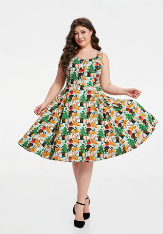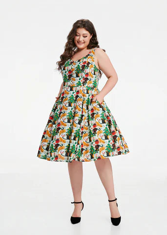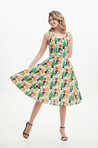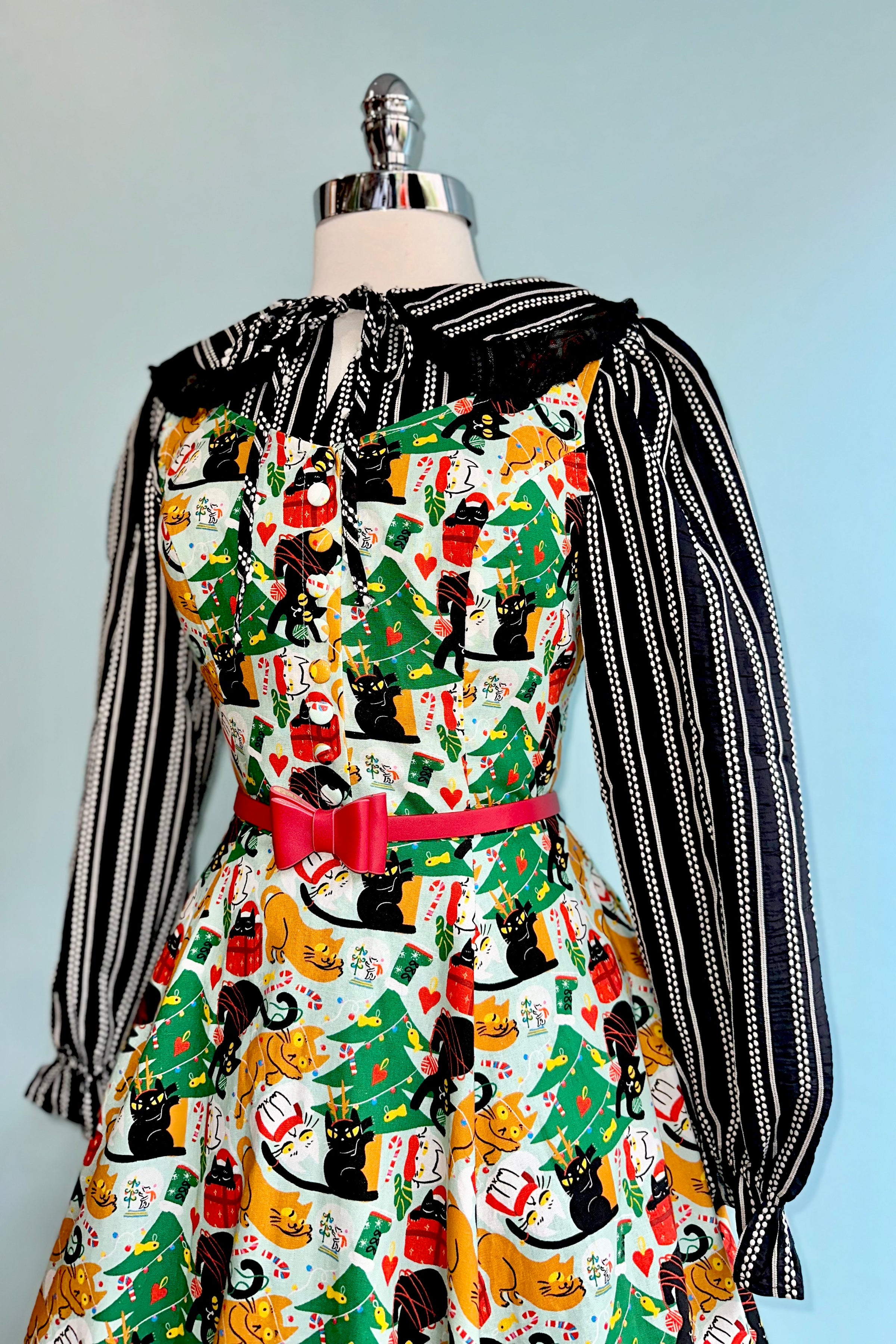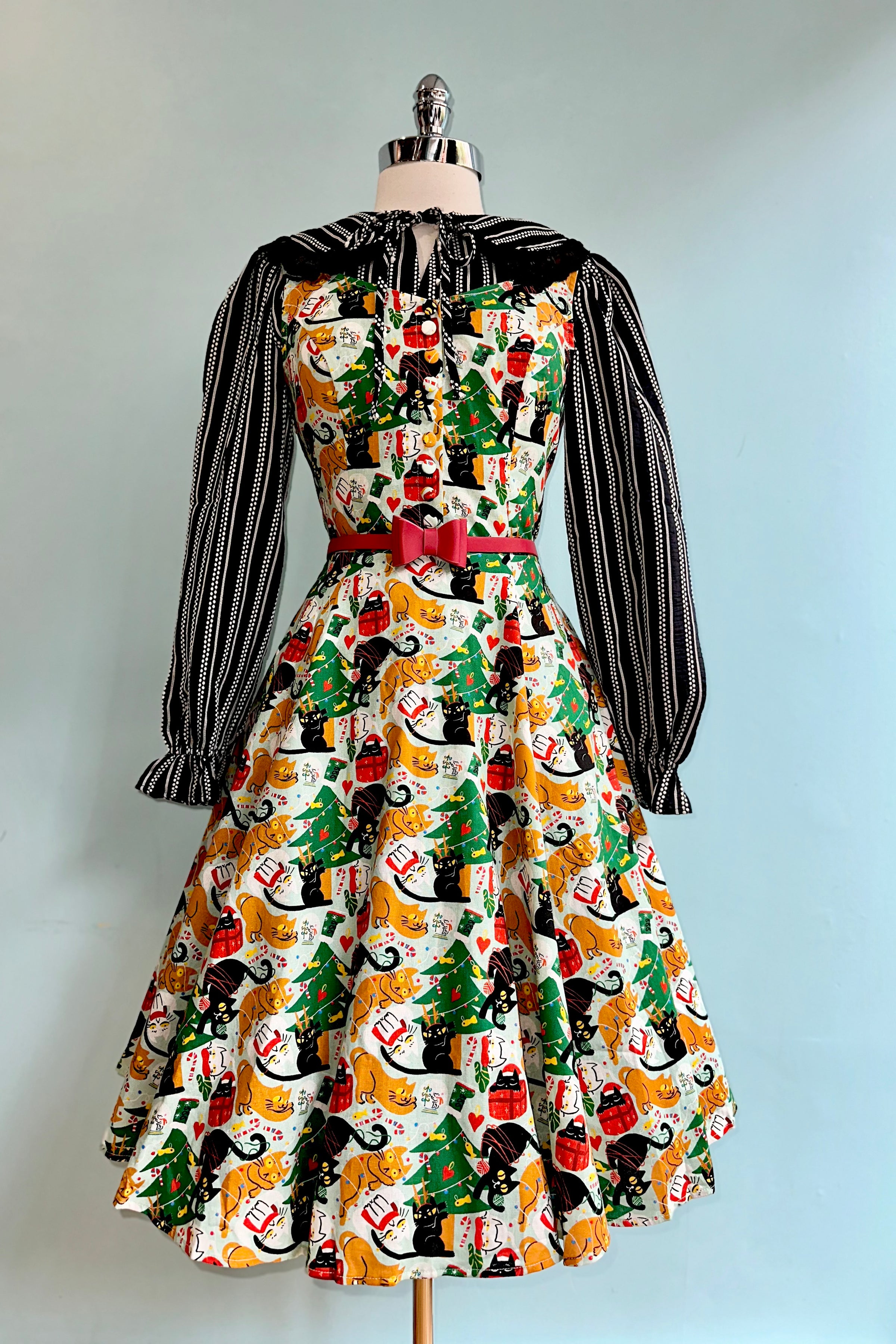 Cat Christmas themed dress with mischievous kitties! The Heidi is a sleeveless dress with a subtle v-neckline and fixed straps. This dress has a great fit! The back bodice sides are smocked which allows ease of wear and comfort. Zips up the back, is unlined and has pockets! Amazing artwork by Sweven Designs.
