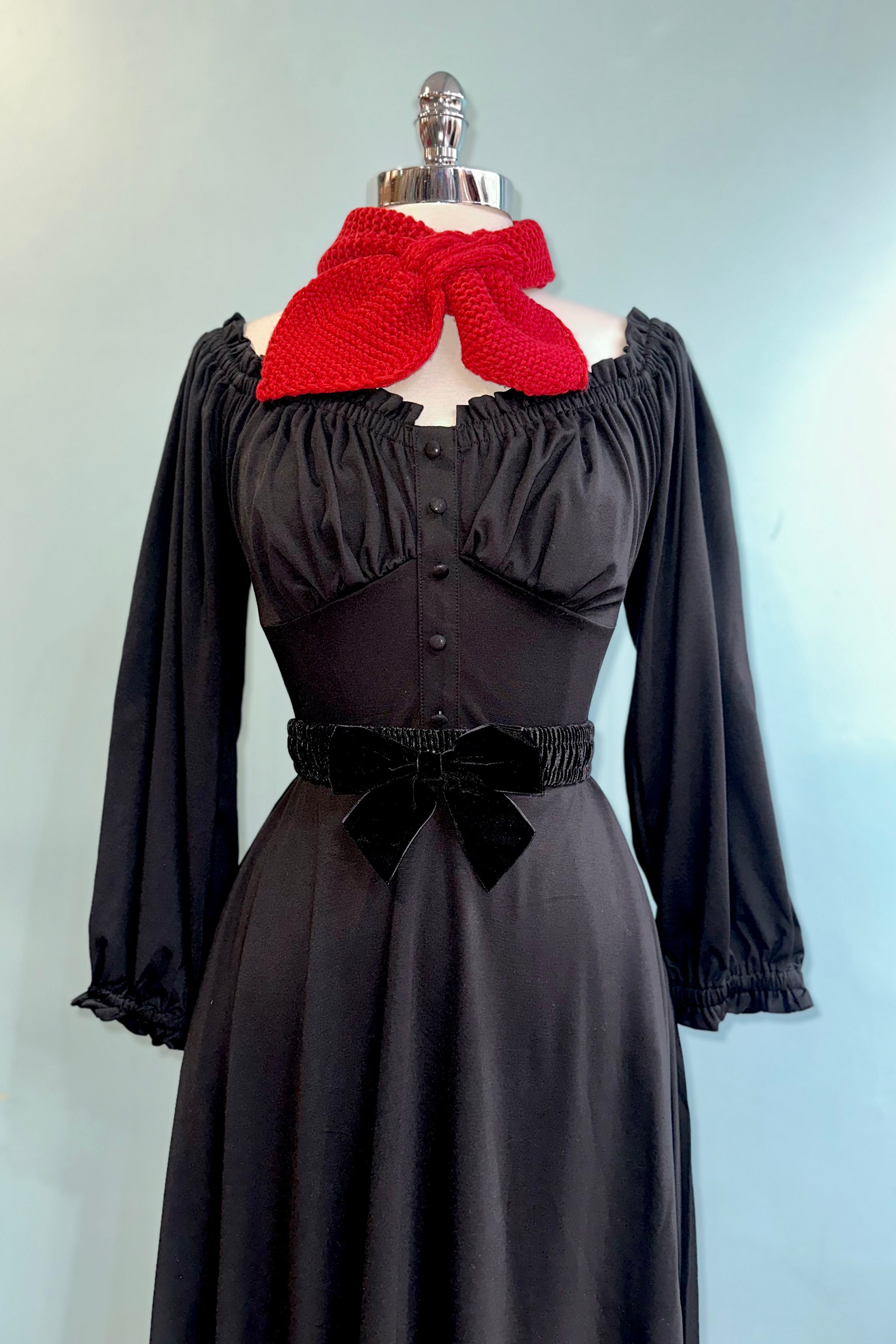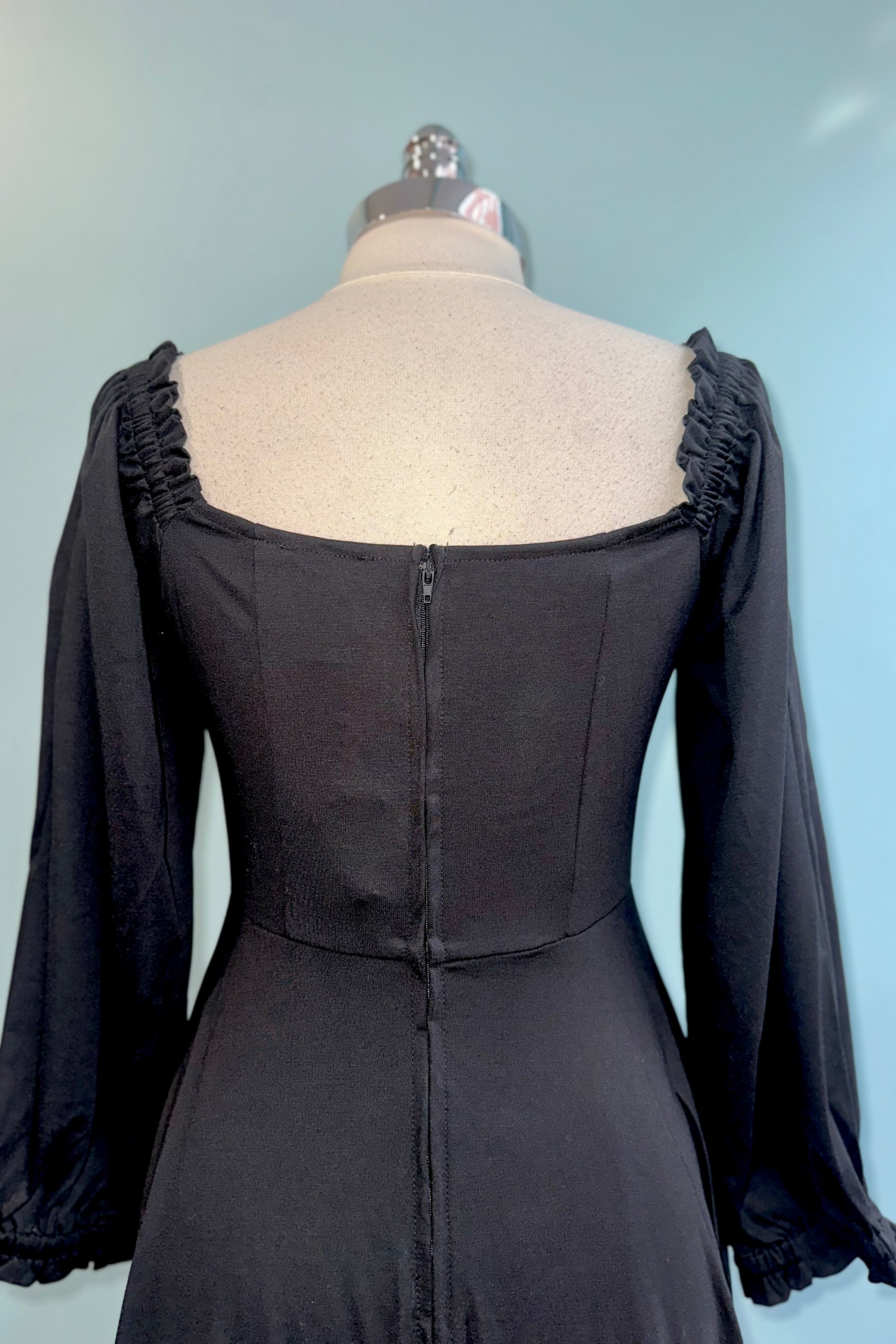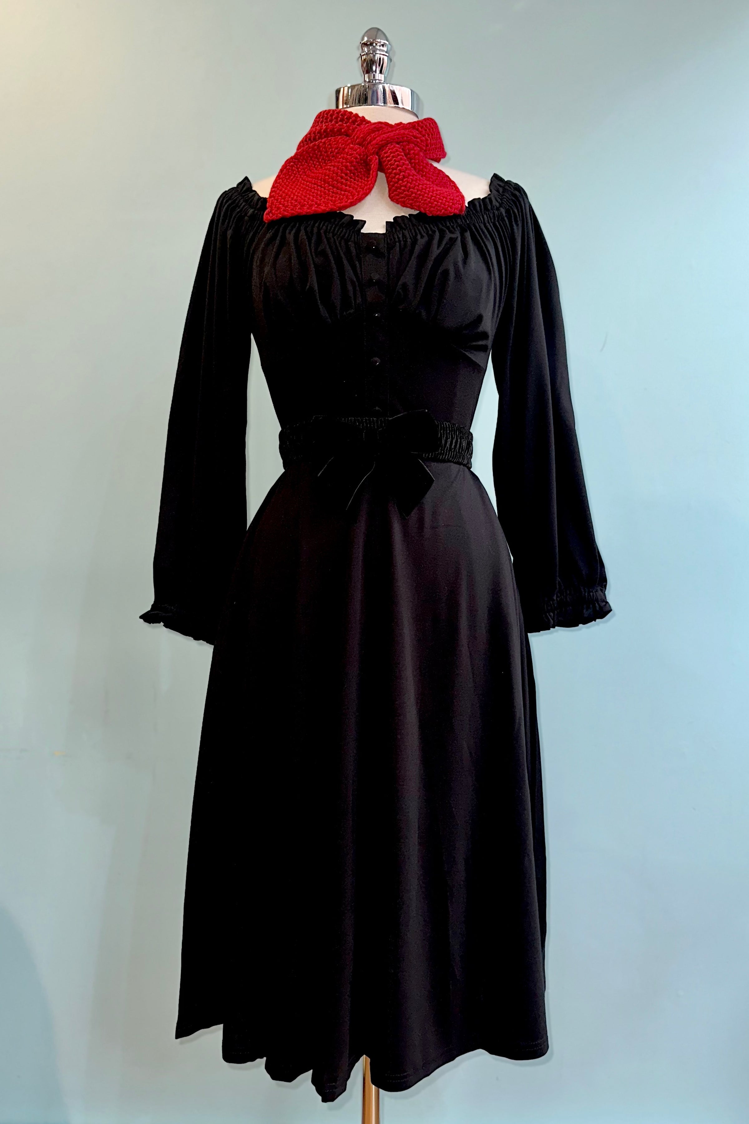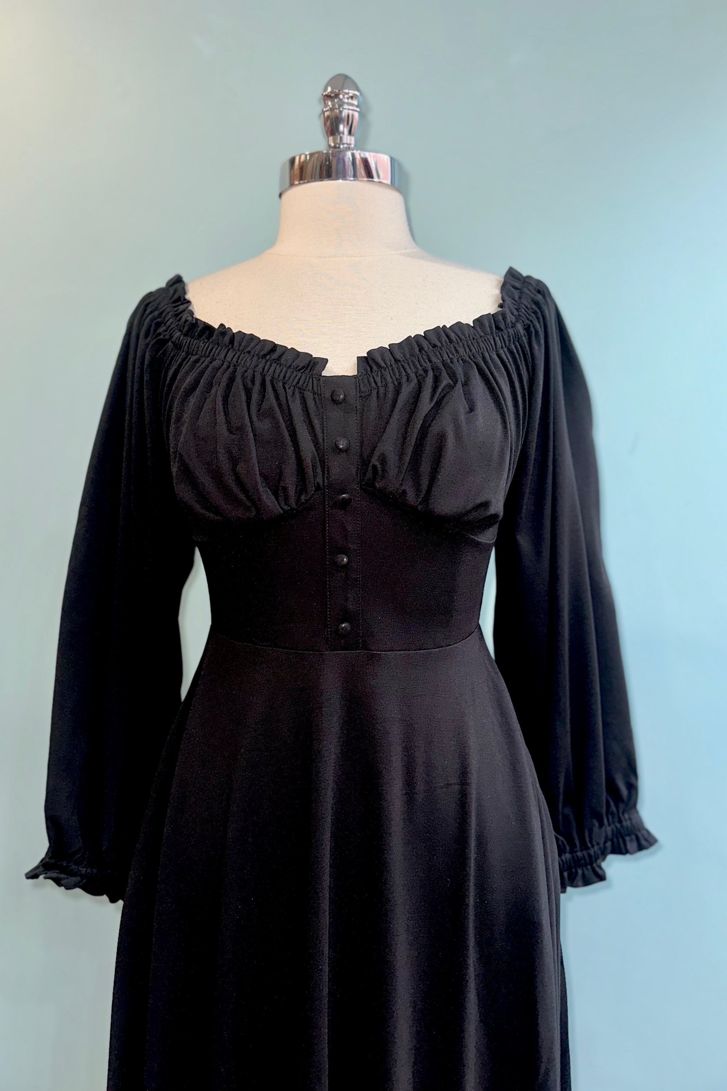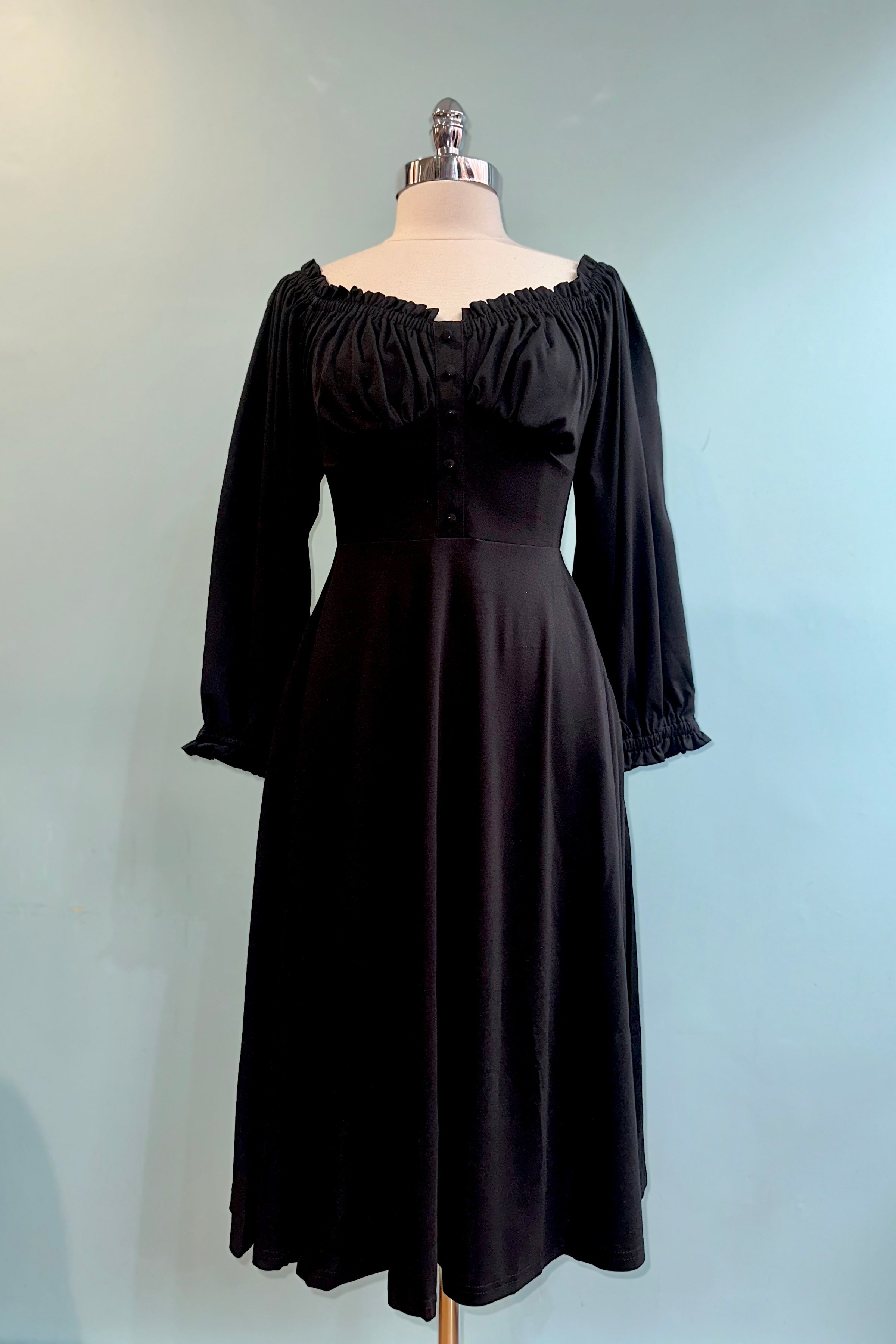 Black dress in a soft stretchy jersey fabric.  There is a back zipper closure and ide pockets in the full skirt.  The bodice has an elasticized neckline that can be worn on or off the shoulder and gathering under the bust.  Very comfortable and flattering fit!