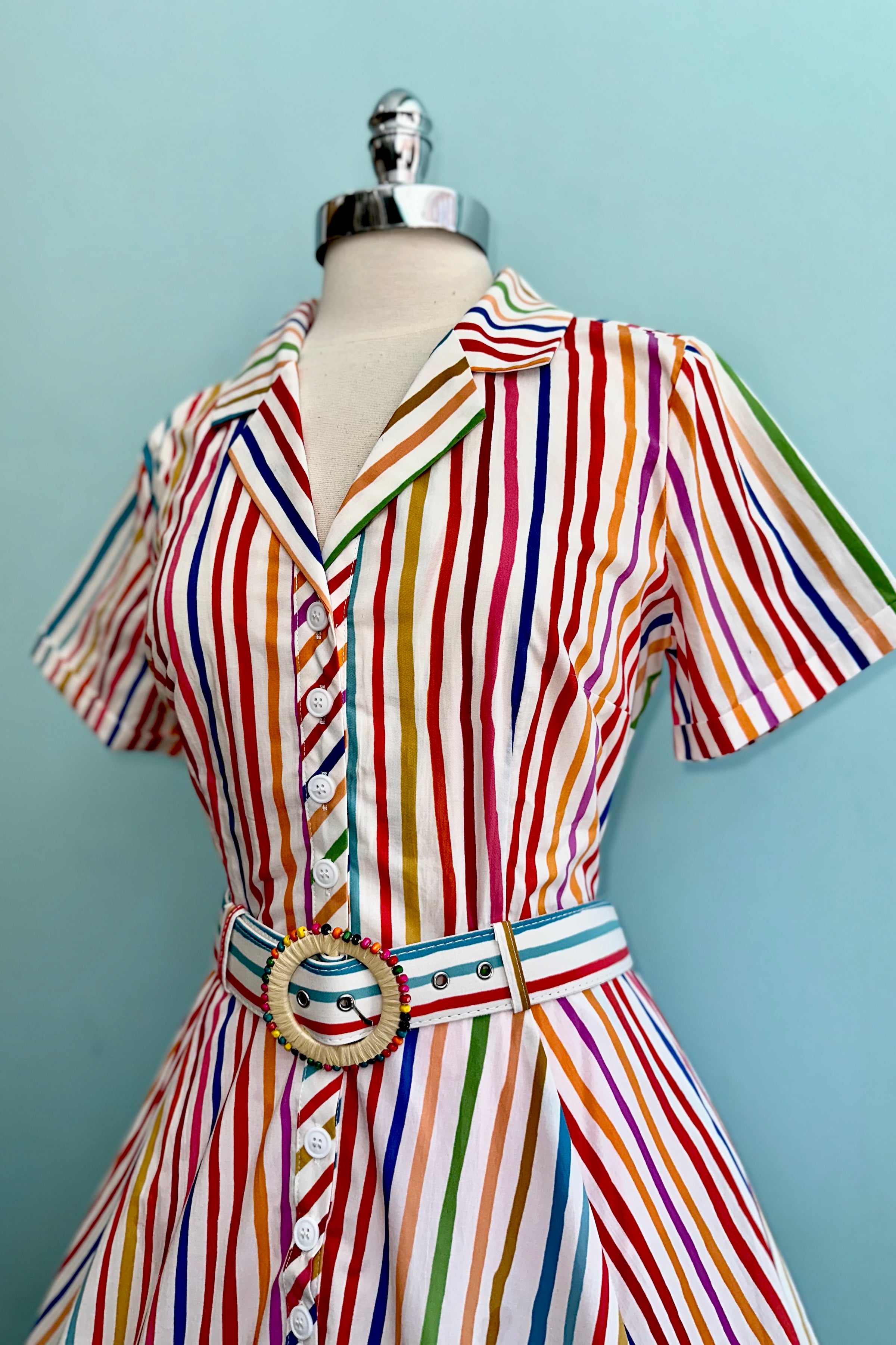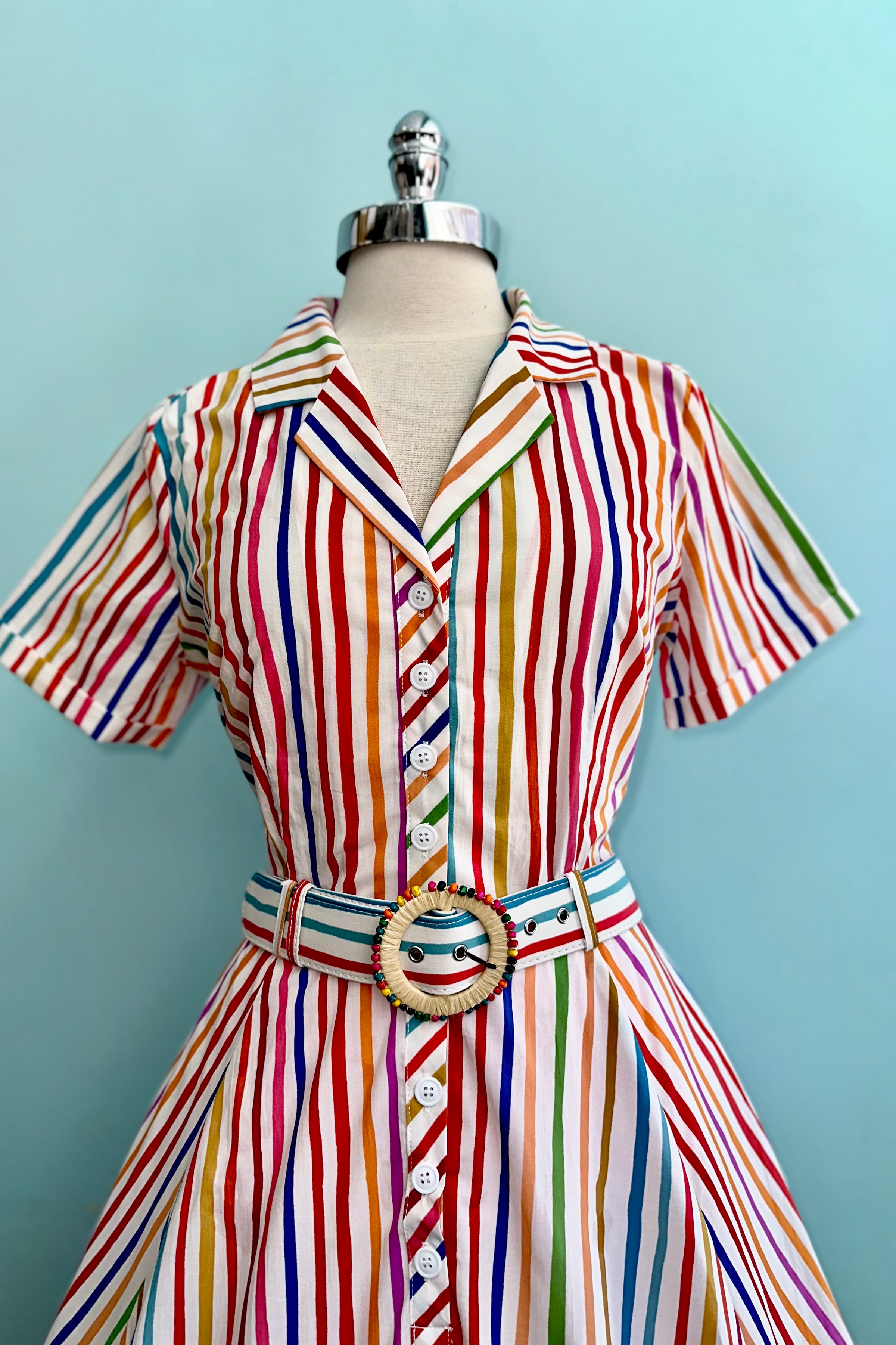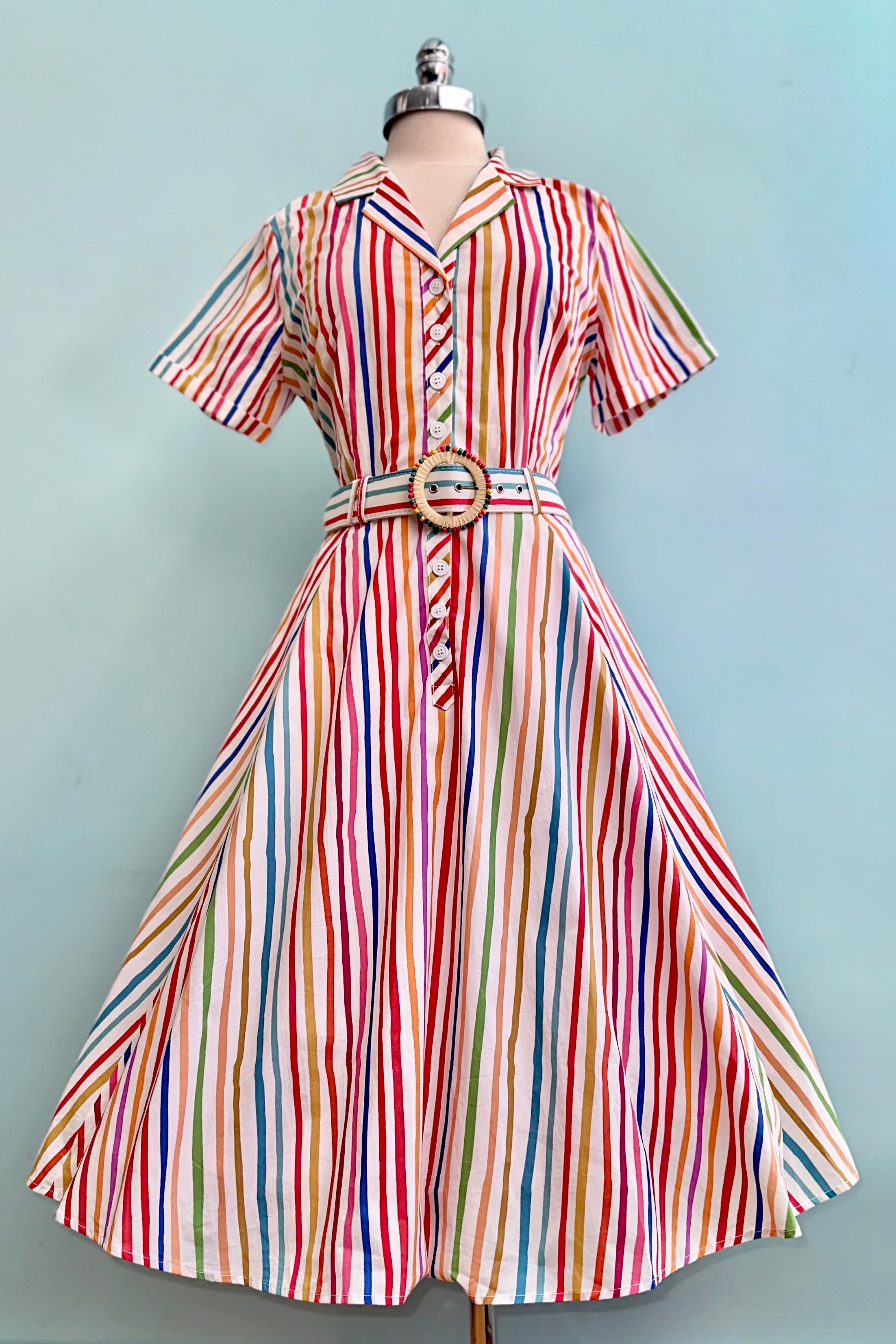 True 3/4 shirt dress with a striped rainbow pattern. This dress has a fold over collar, a coordinating belt with a round beaded buckle and short sleeves. There is a row of functional buttons up the front, it has pockets, and is unlined.