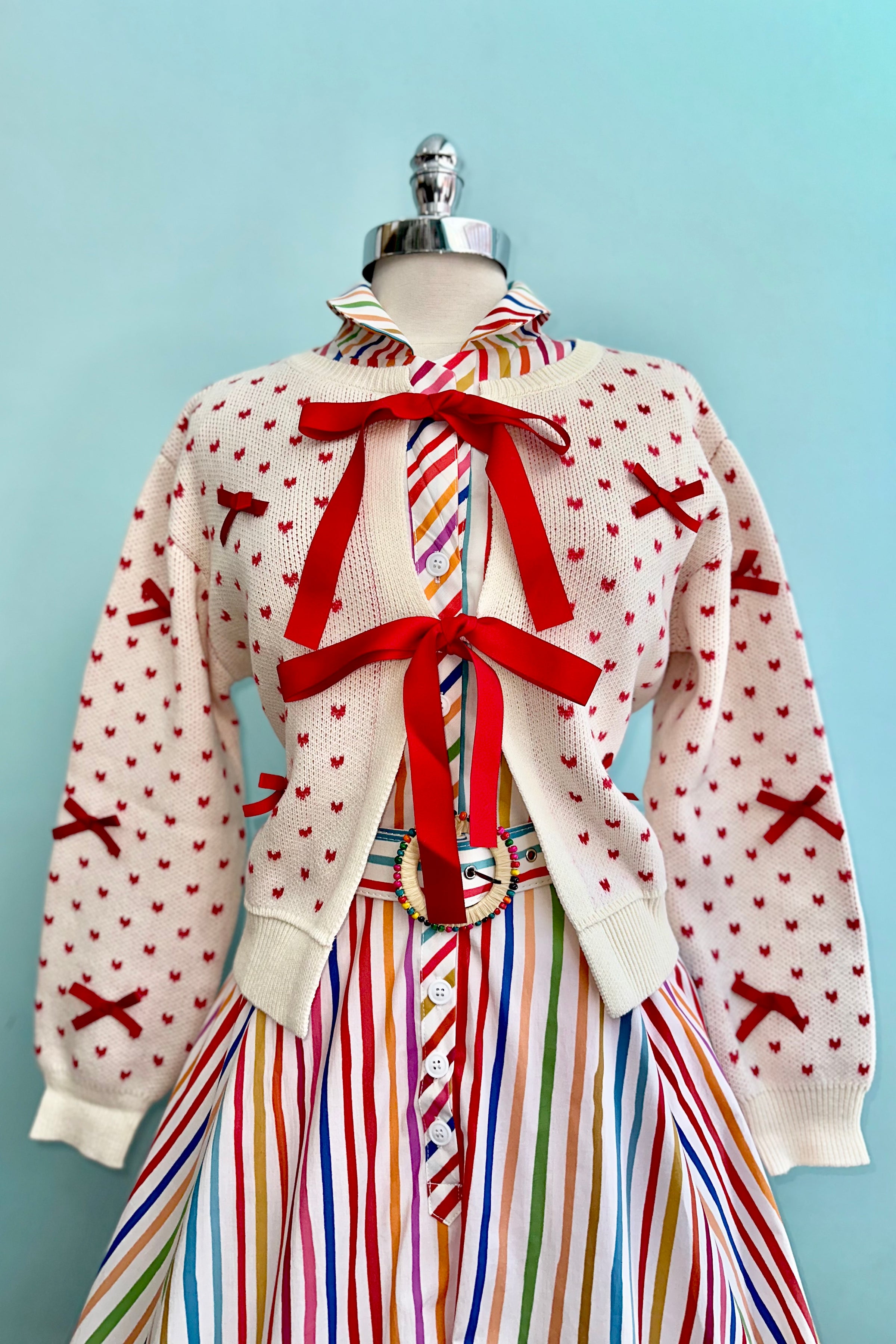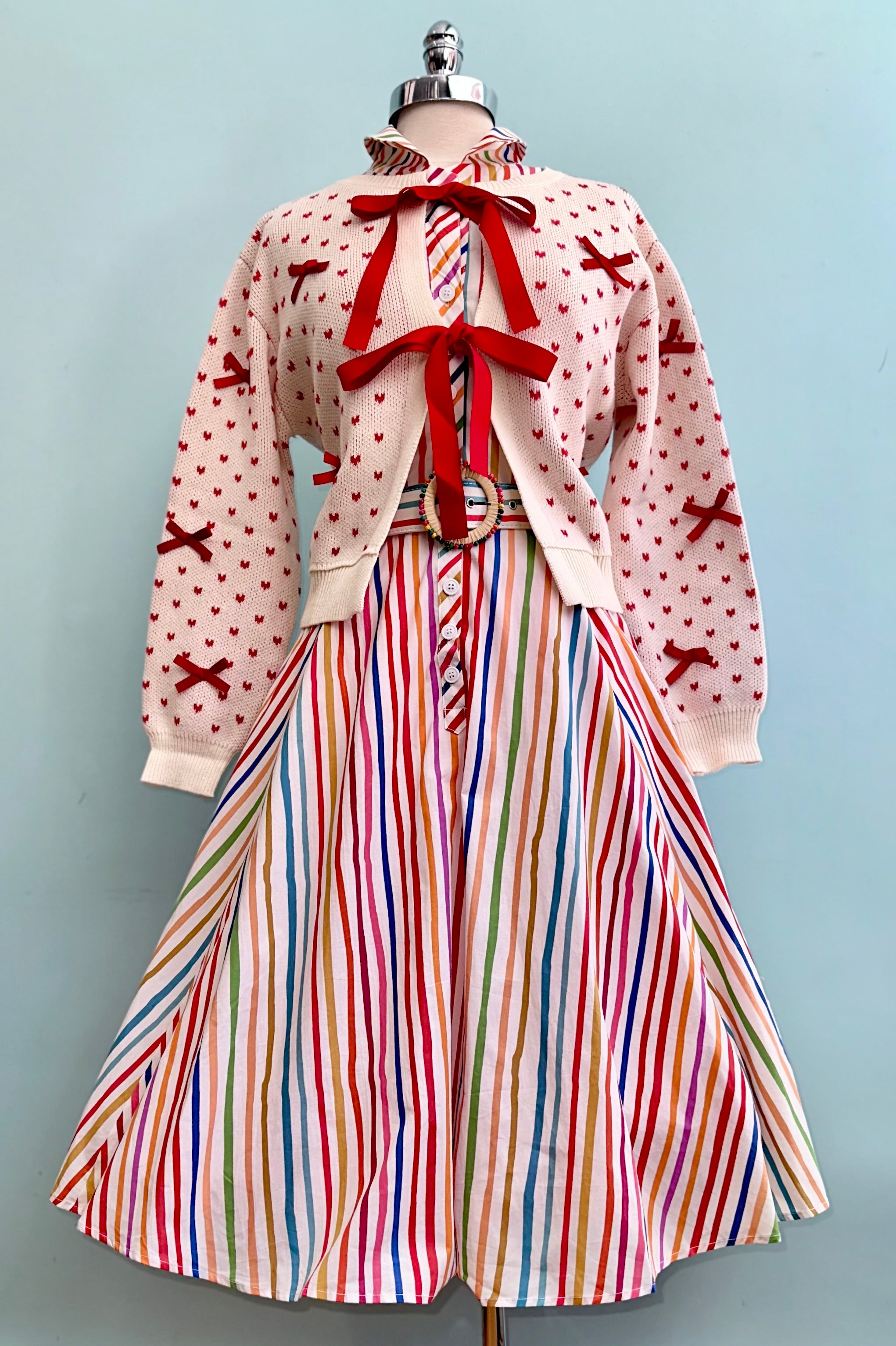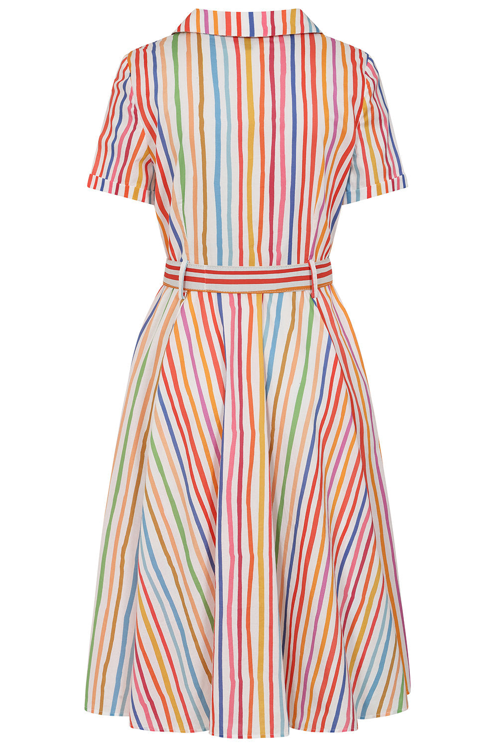 True 3/4 shirt dress with a striped rainbow pattern. This dress has a fold over collar, a coordinating belt with a round beaded buckle and short sleeves. There is a row of functional buttons up the front, it has pockets, and is unlined.