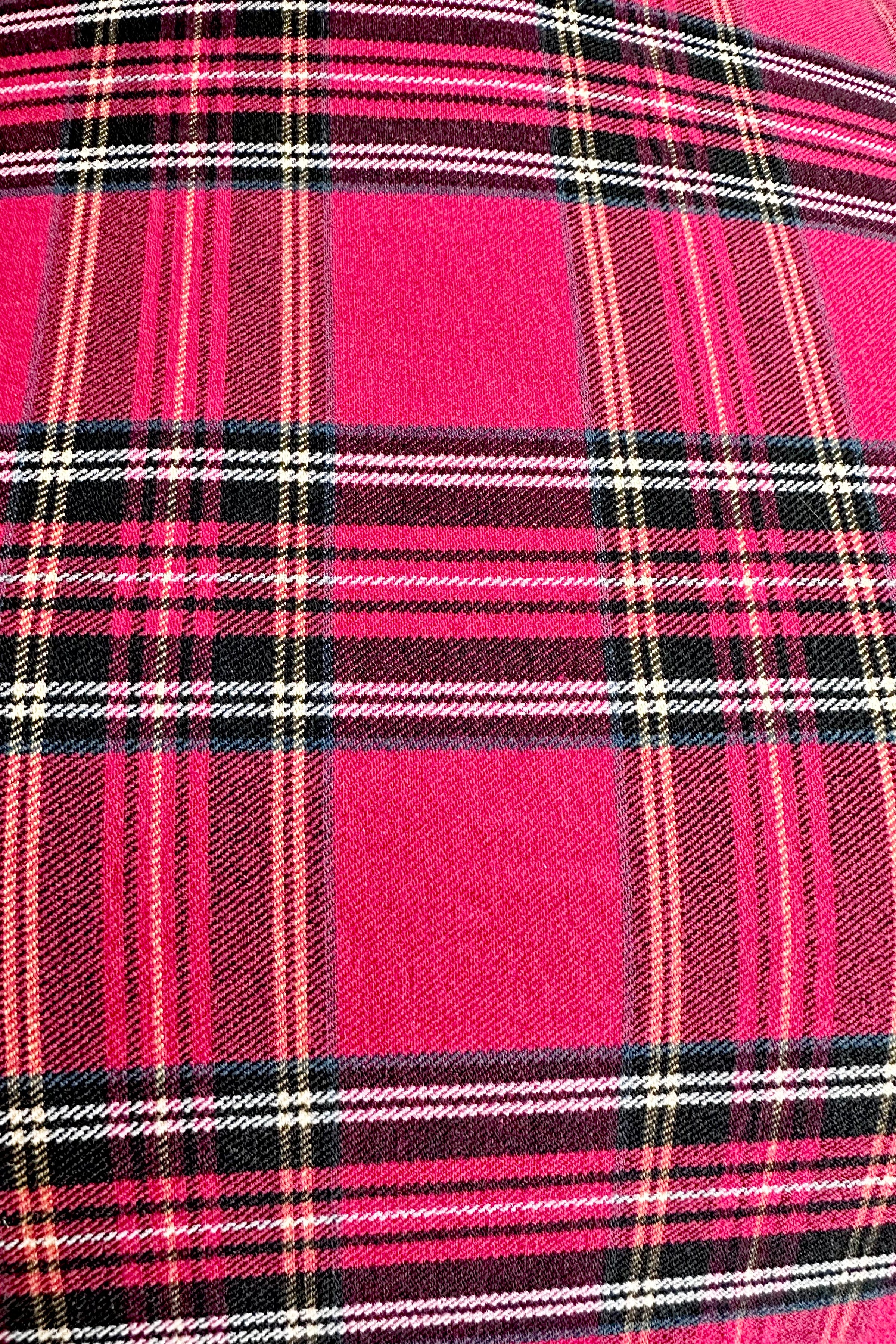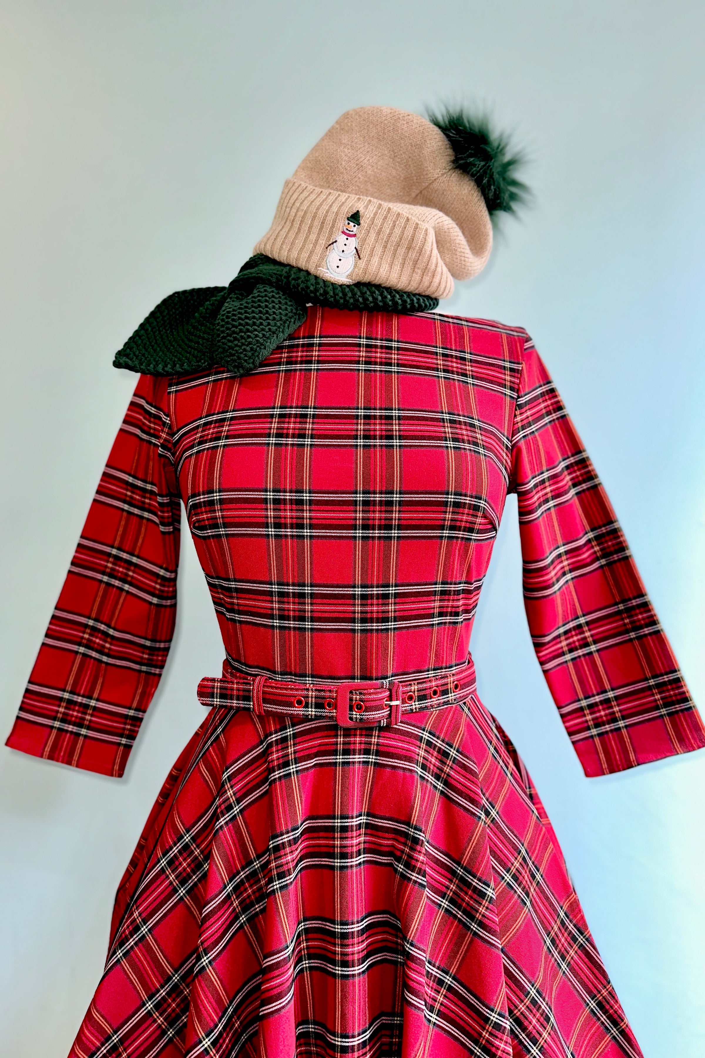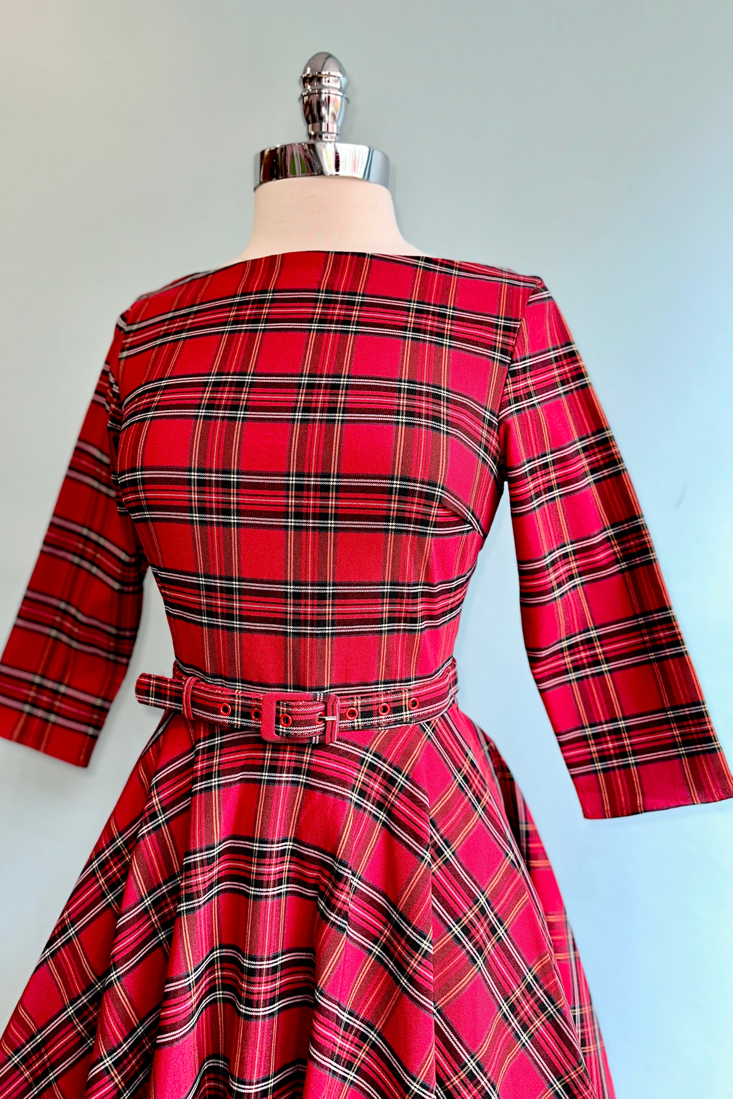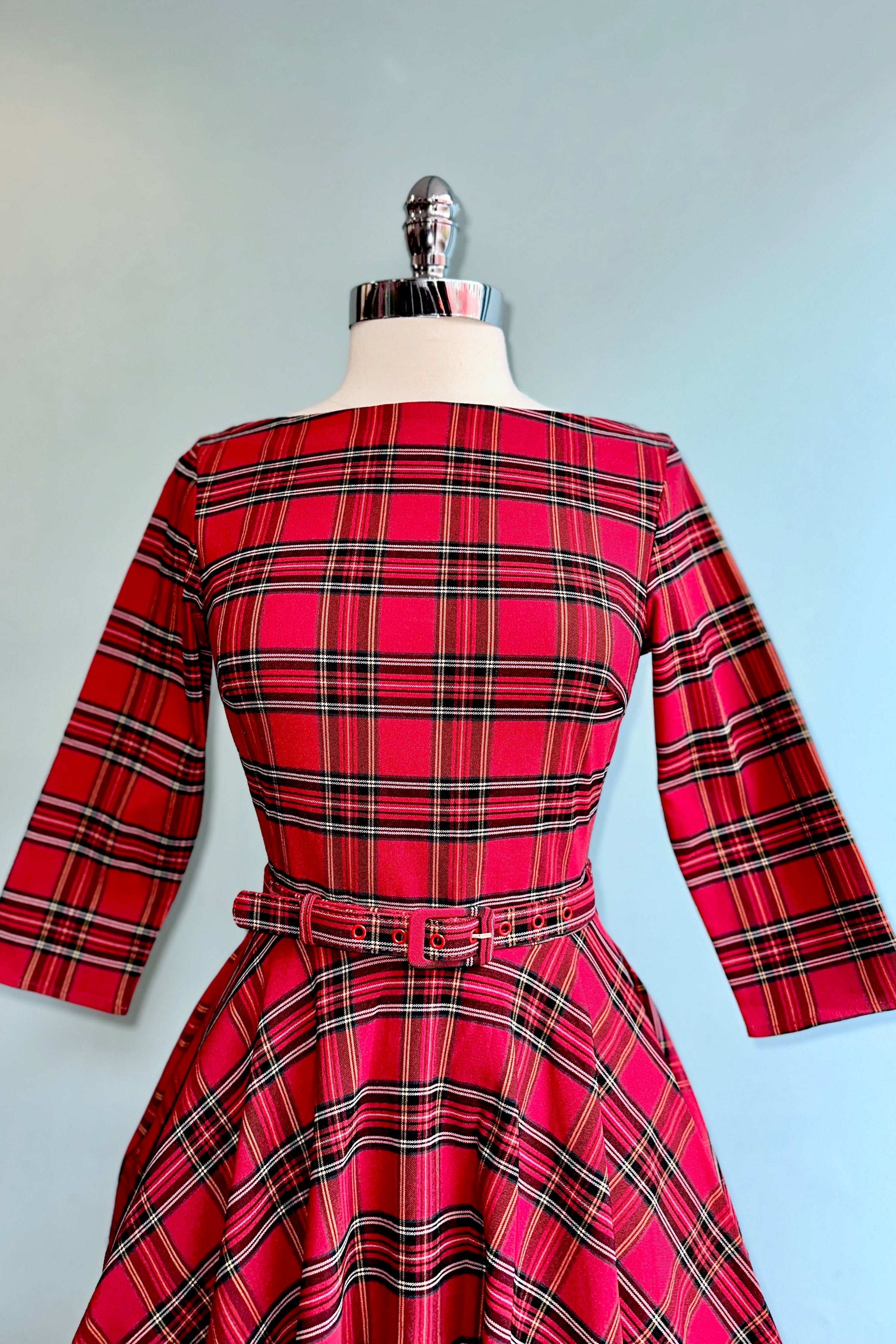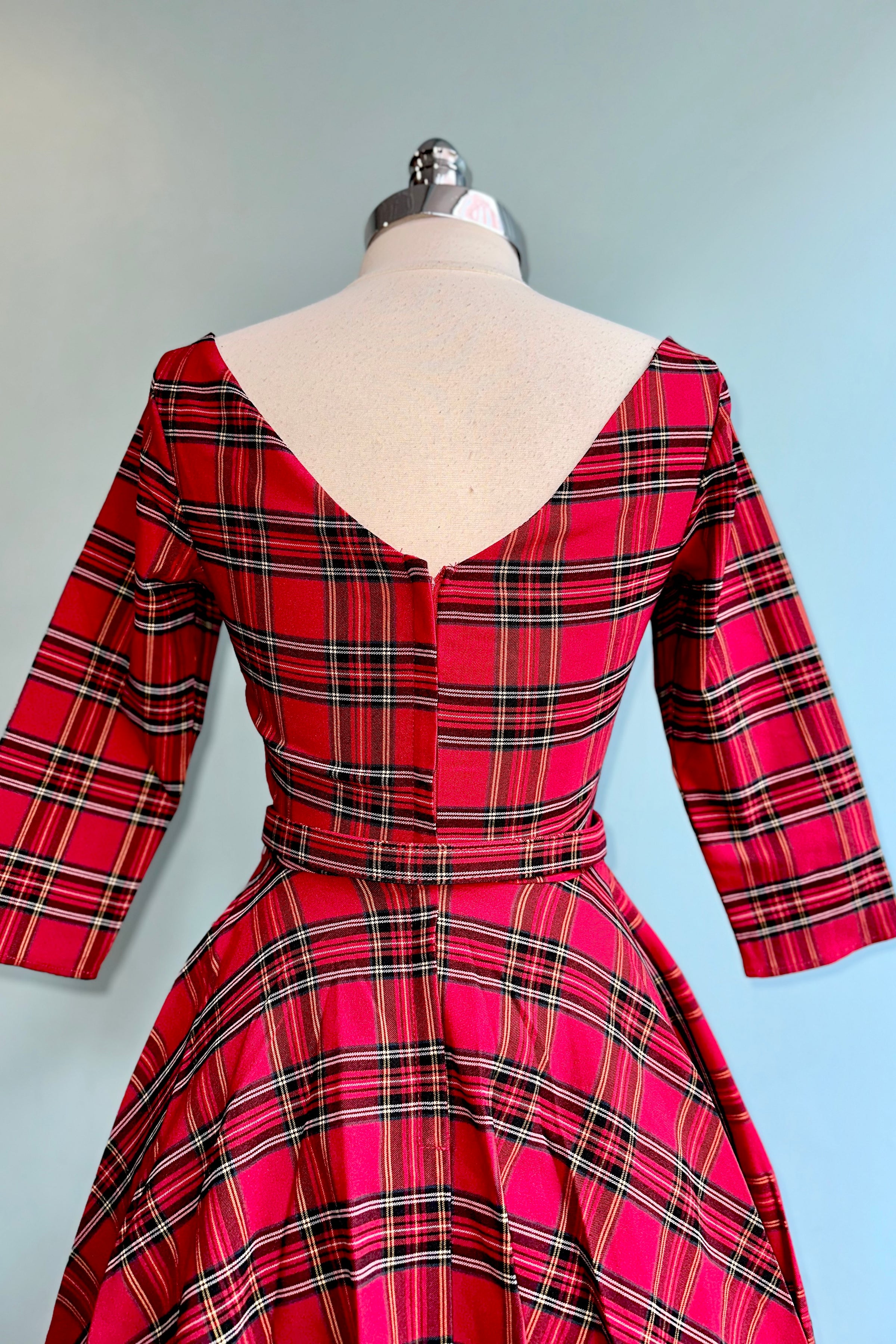 Stretch red plaid dress with a bateau neck and 3/4 sleeves. There are hidden side pockets and zips up the back to a deep V. This dress is not lined.