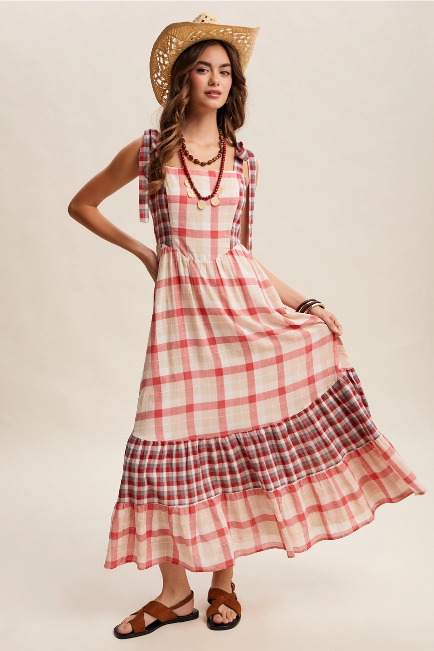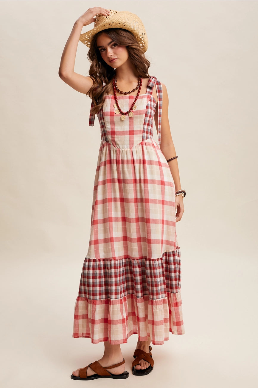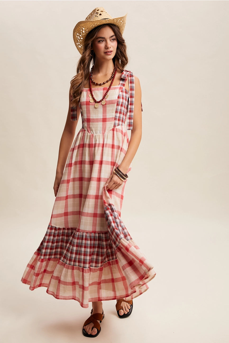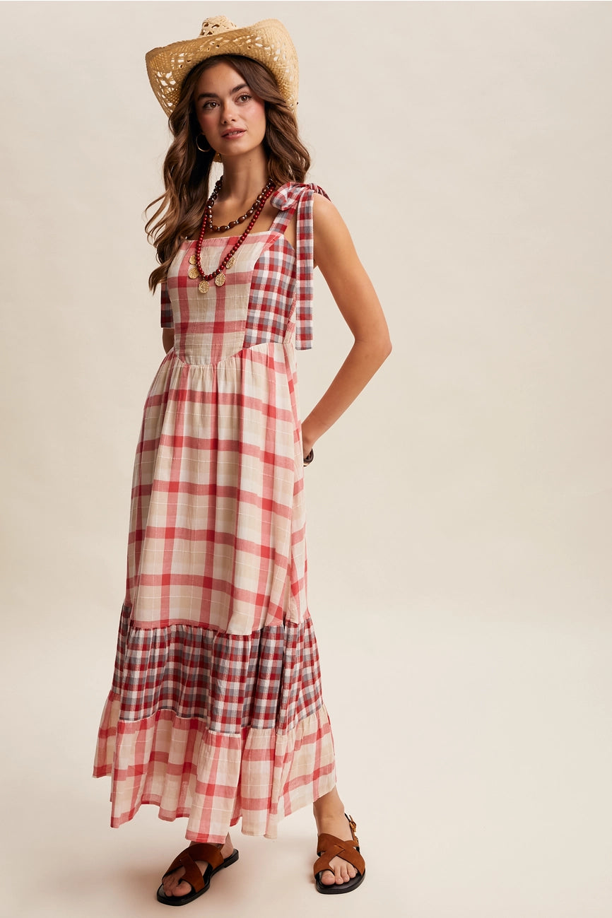Lightweight woven dress in an airy, breathable material with a soft, flowy drape. This dress is fully lined and has adjustable tie shoulders with wide self-ties. The bodice has a shirred back panel and a tiered maxi skirt with side pockets. Made of a red and off white plaid fabric.