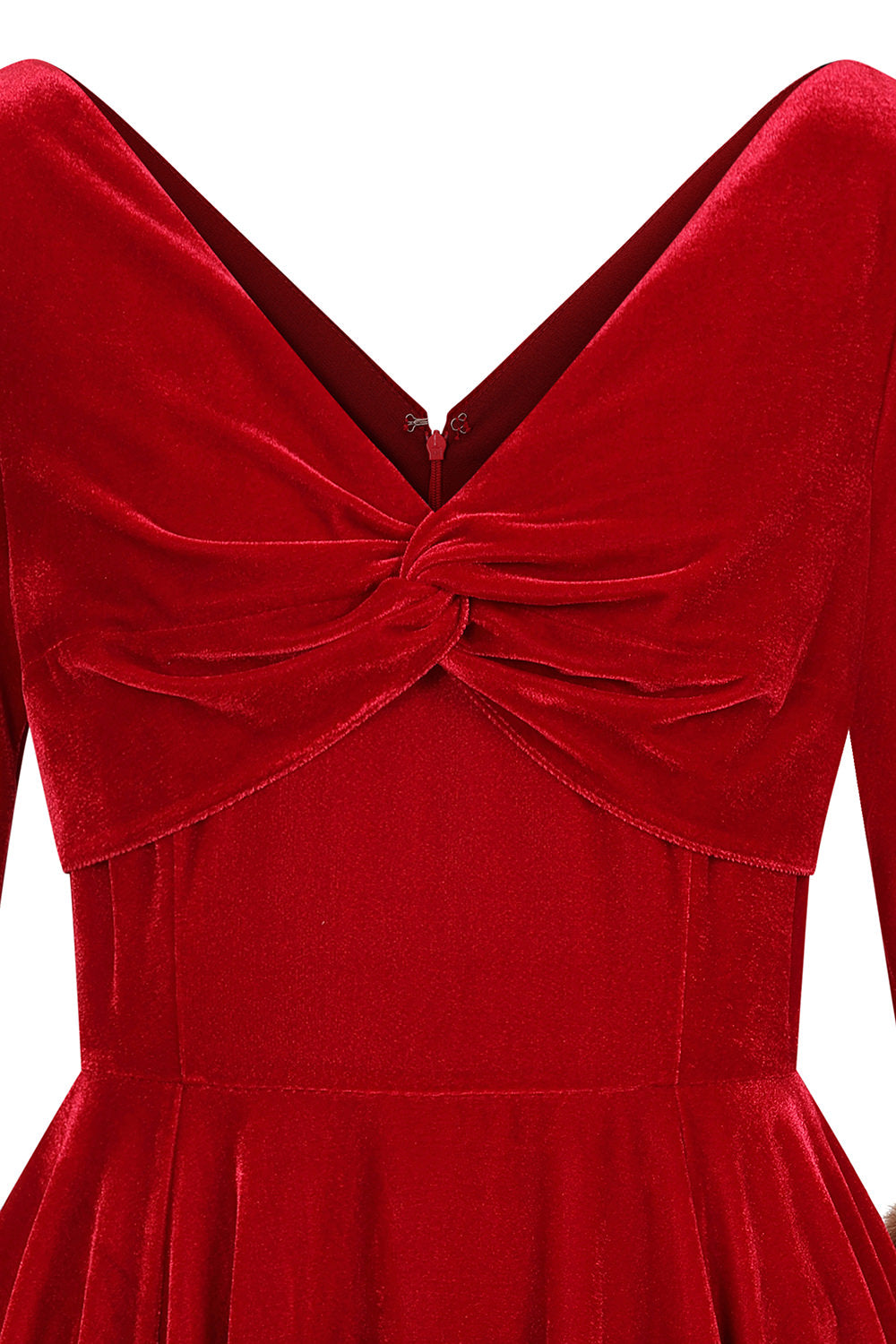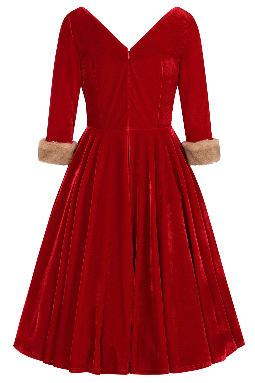 Stunning stretch red velvet holiday dress with a deep v in the front and back and removable faux fur cuffs. The skirt is very full and has pockets! There is a back zip closure.