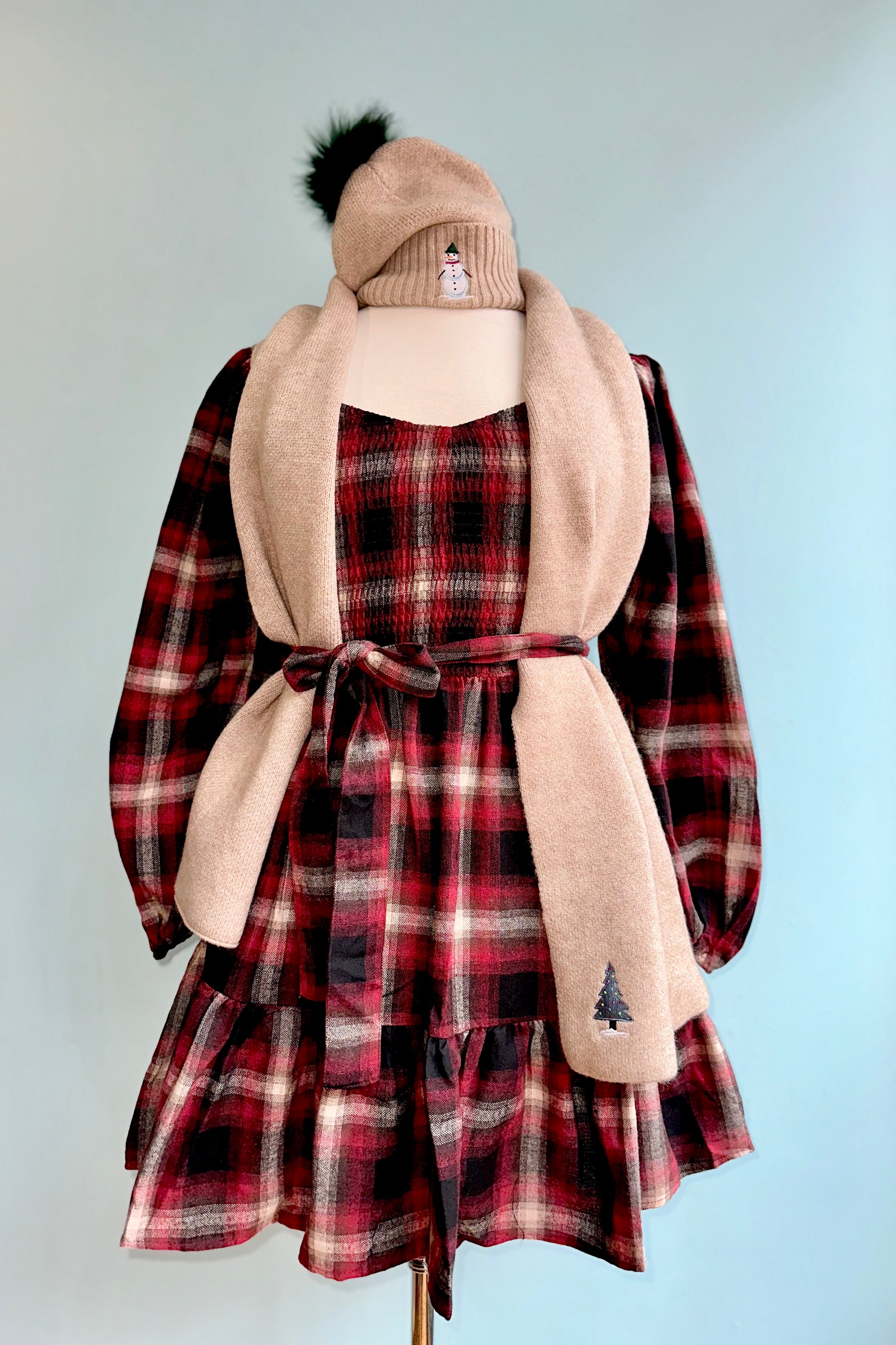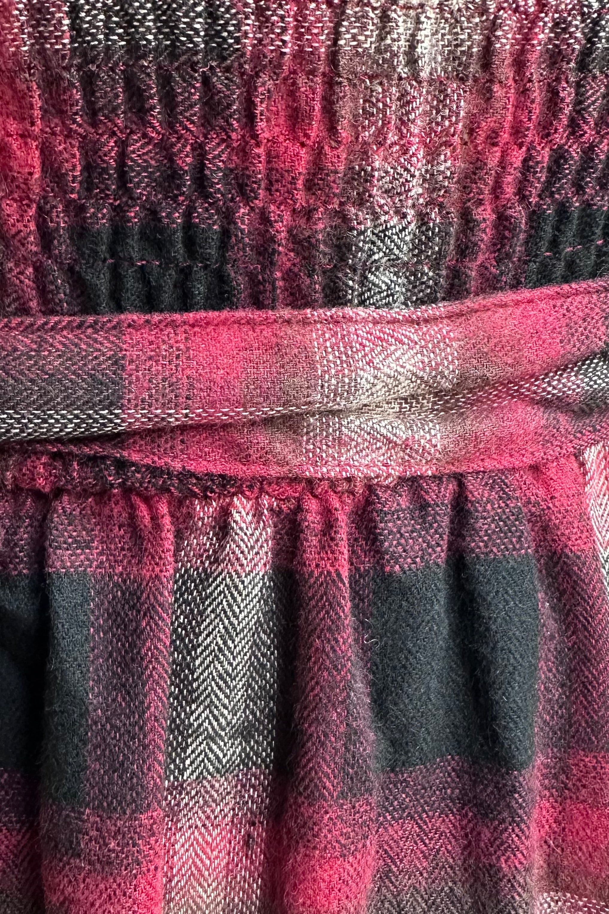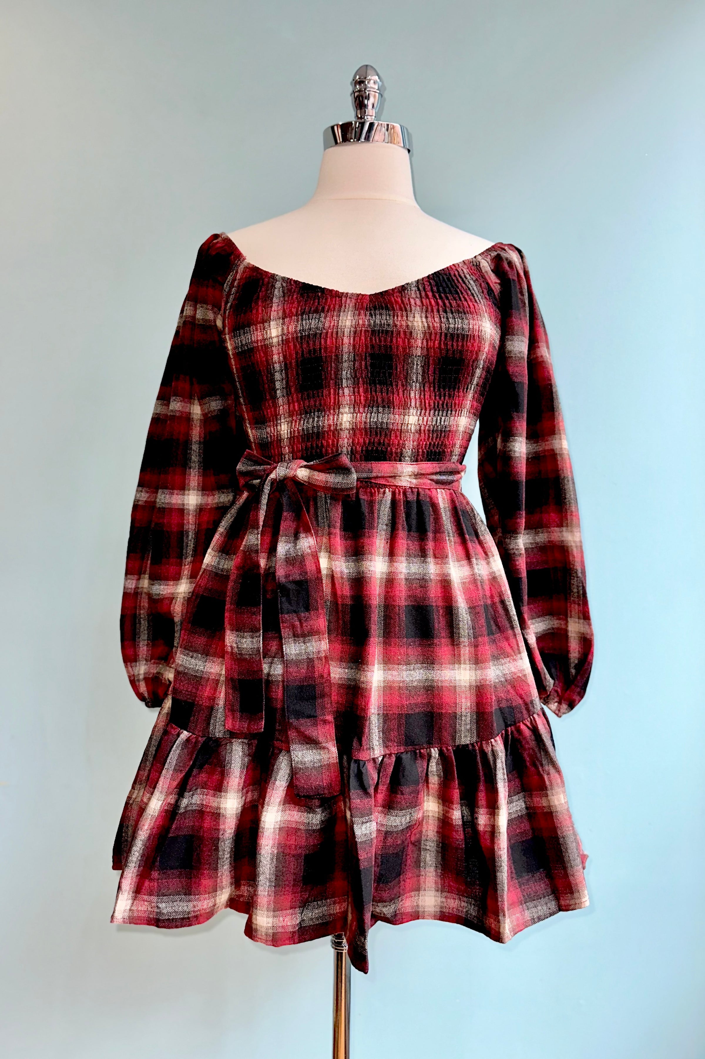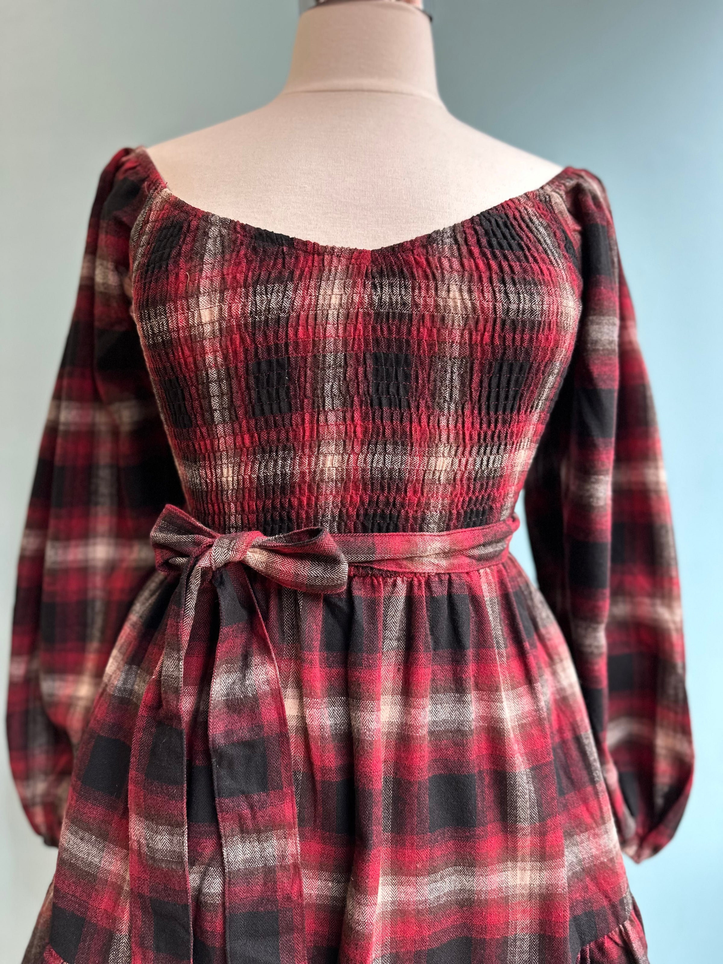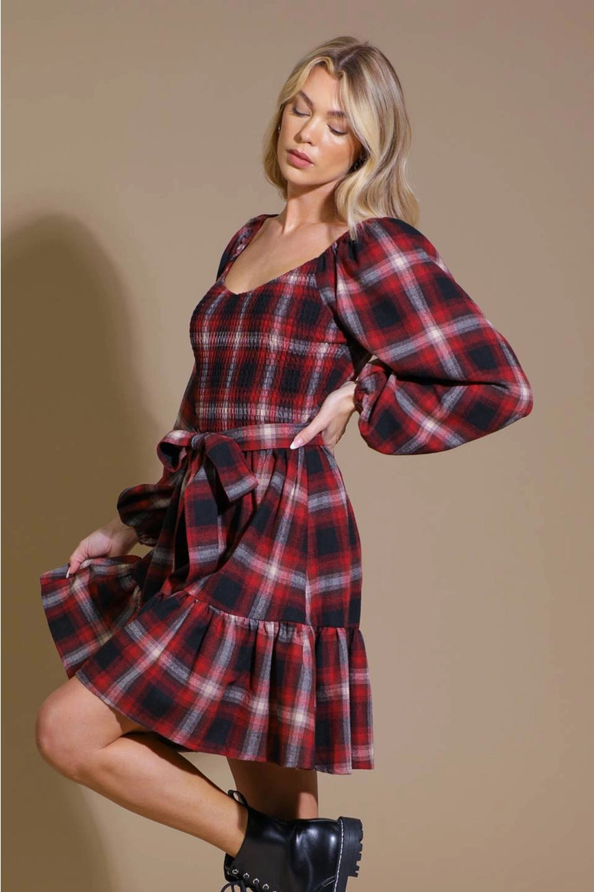 Deep red, ivory, and black plaid smocked bodice mini with a self tie fastener. This dress has long, full sleeves that have an elastic wrist. The bodice is smocked for ease of wear and the skirt is a mini with a flounced hem.