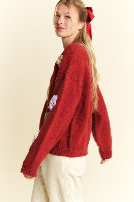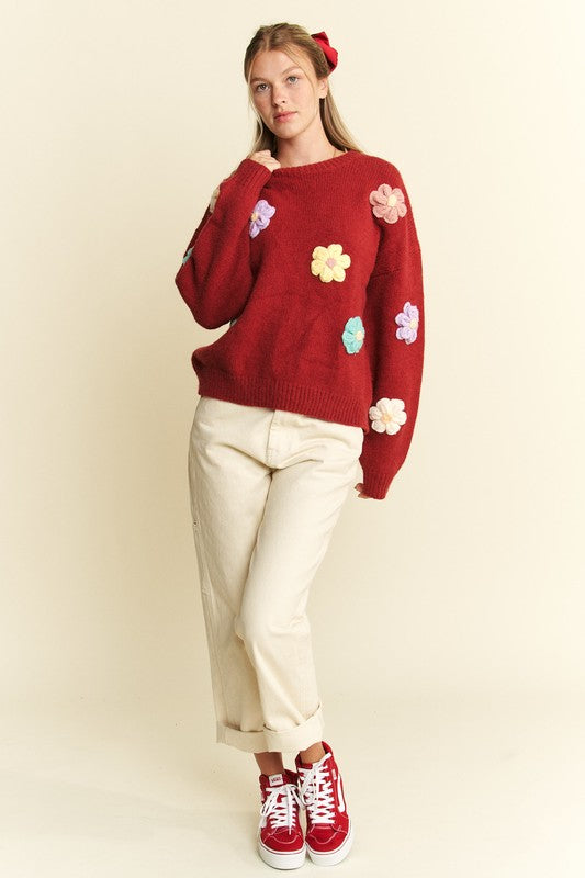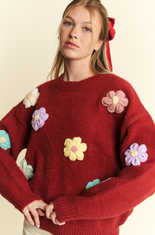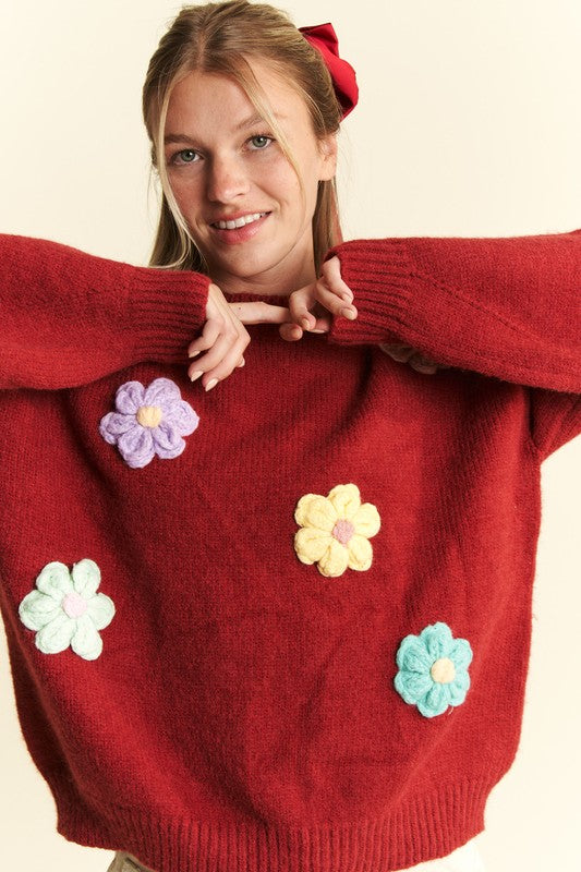 3D Flower Pullover Sweater in Red