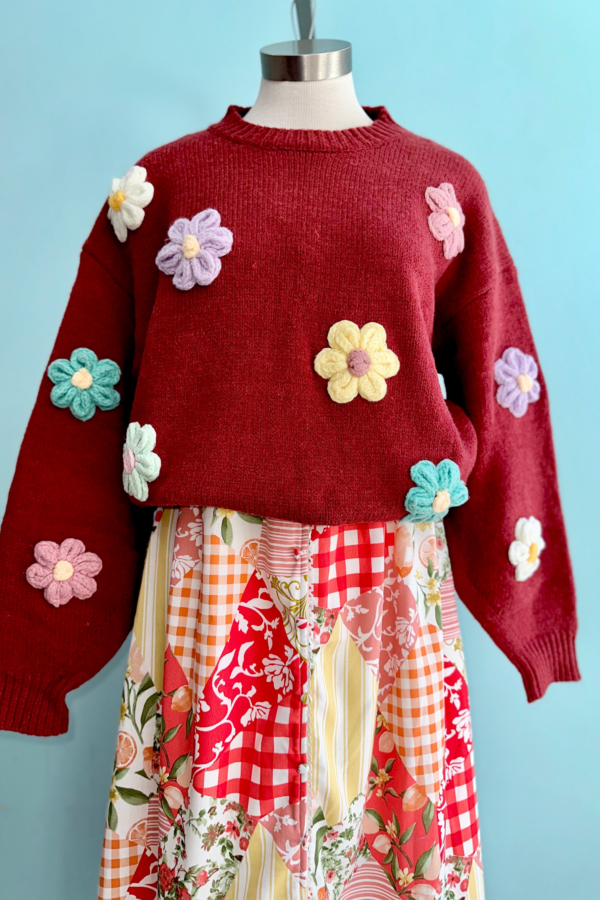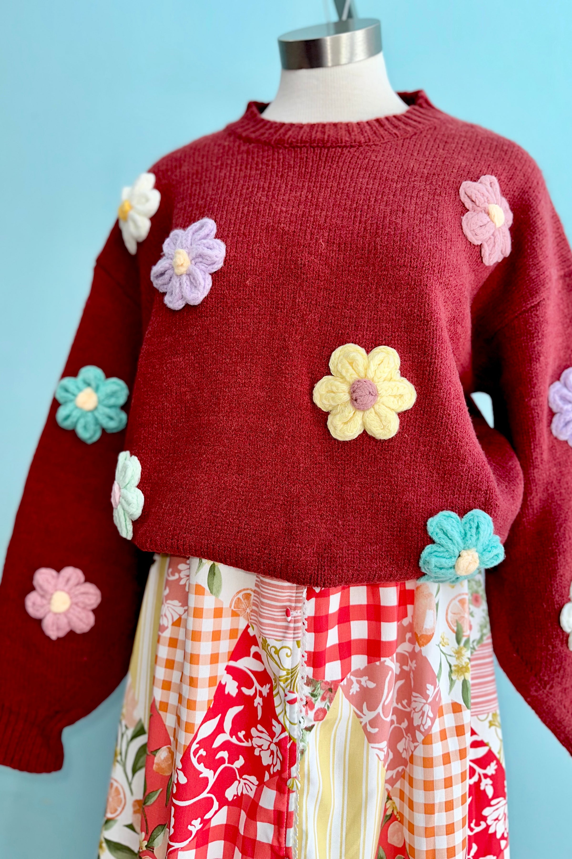 Red pullover sweater with a 3D flower print in pink, mint, yellow, purple and white.