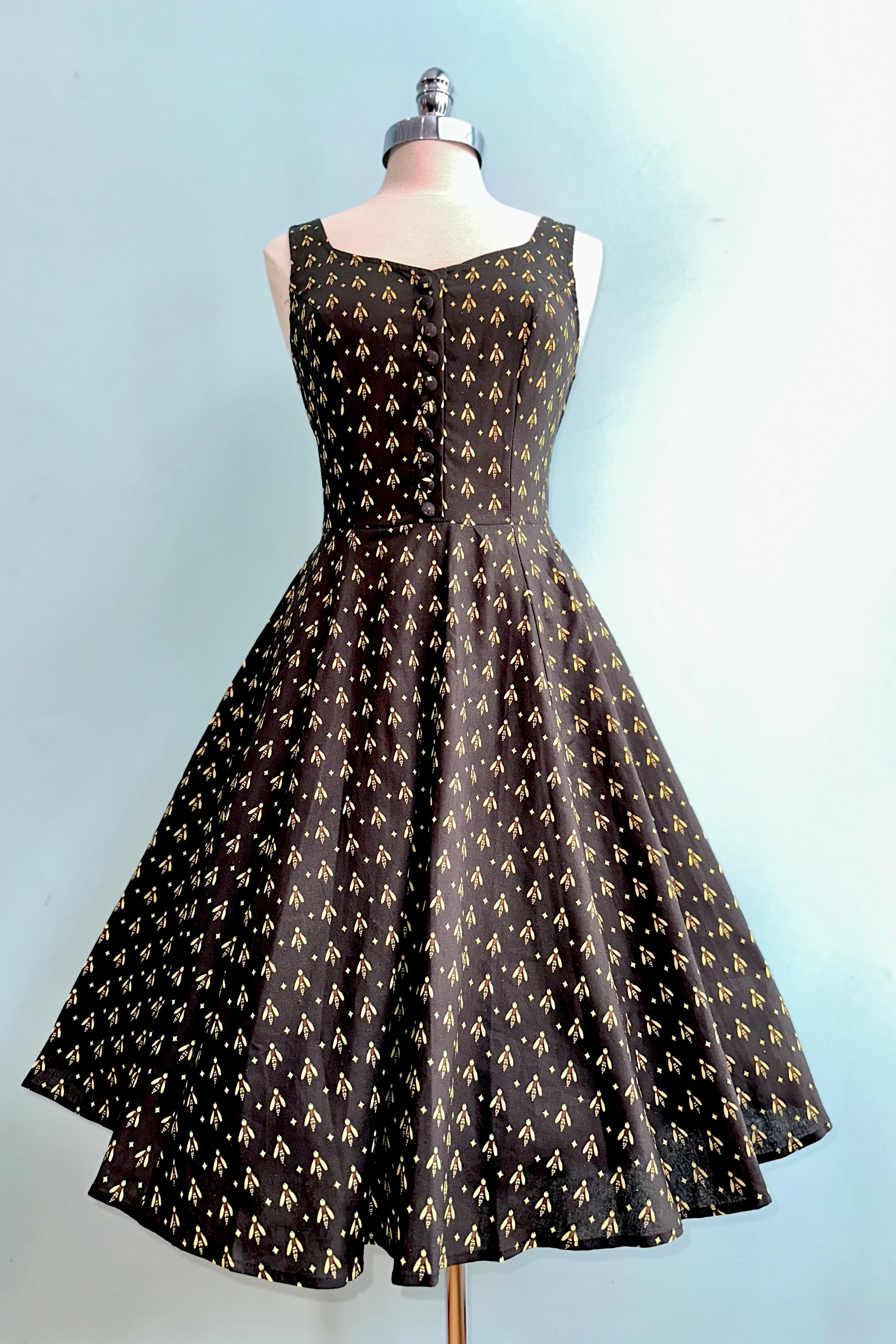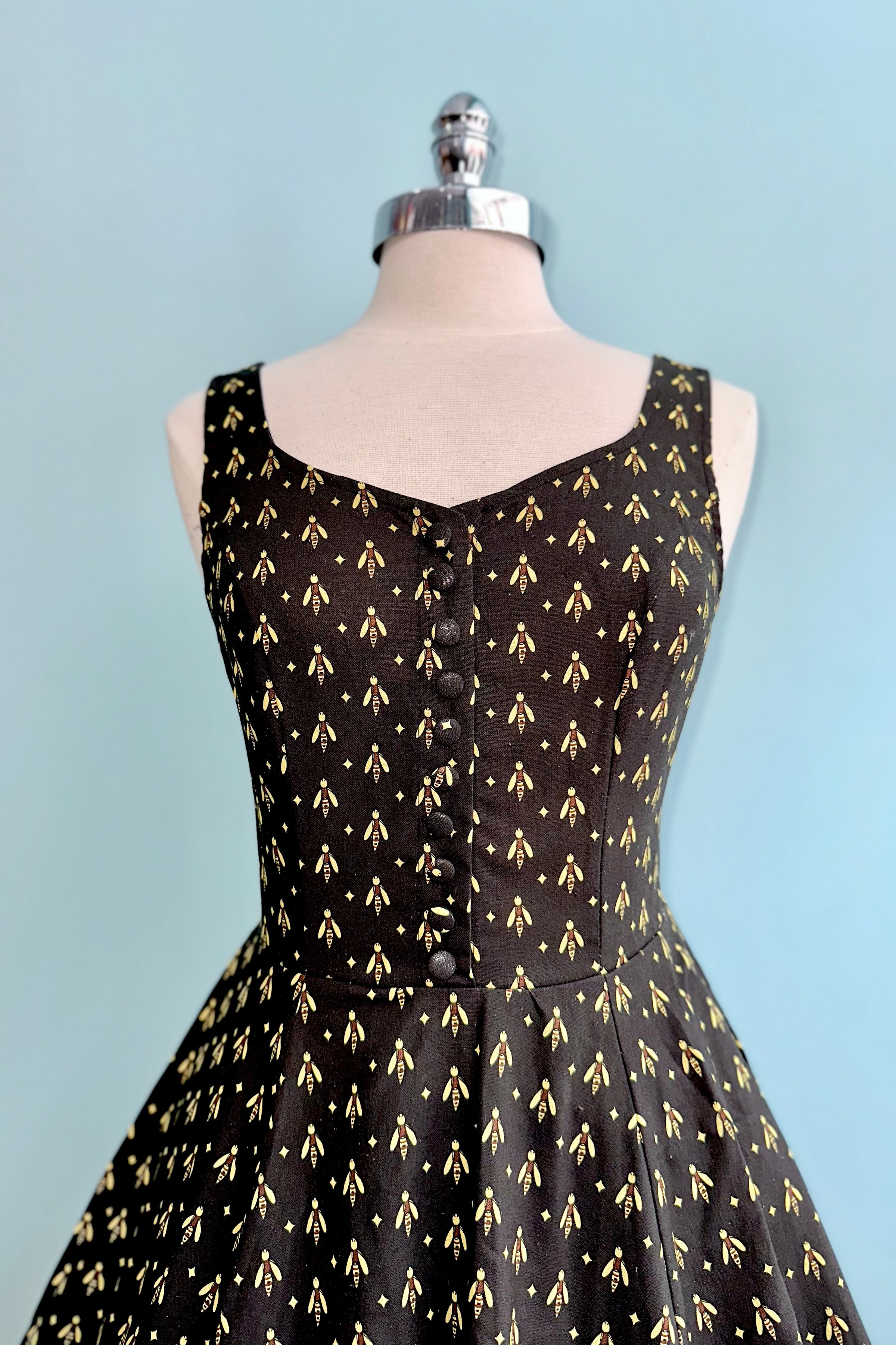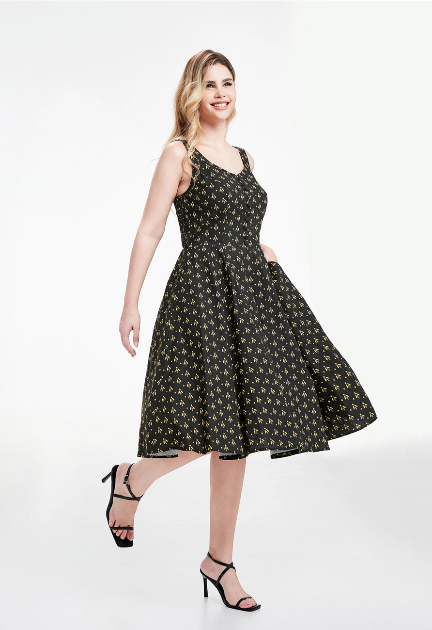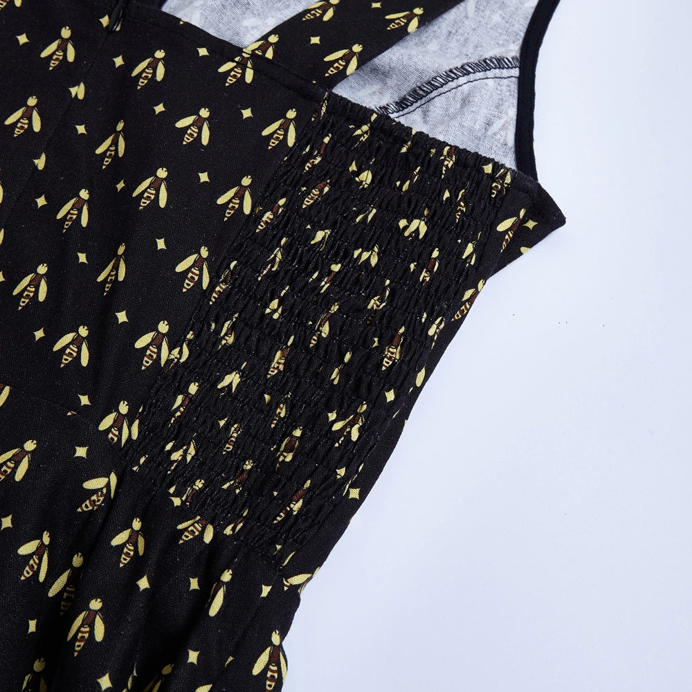 Black dress with a yellow bee print. The Heidi is a sleeveless dress with a subtle v-neckline and fixed straps. This dress has a great fit! The back bodice sides are smocked which allows ease of wear and comfort. Zips up the back, is unlined and has pockets!