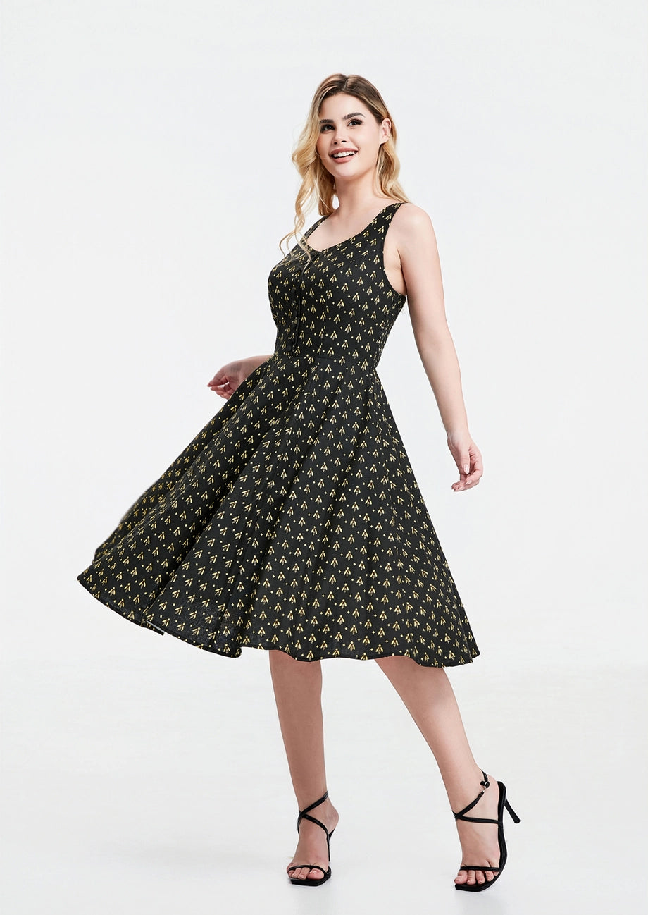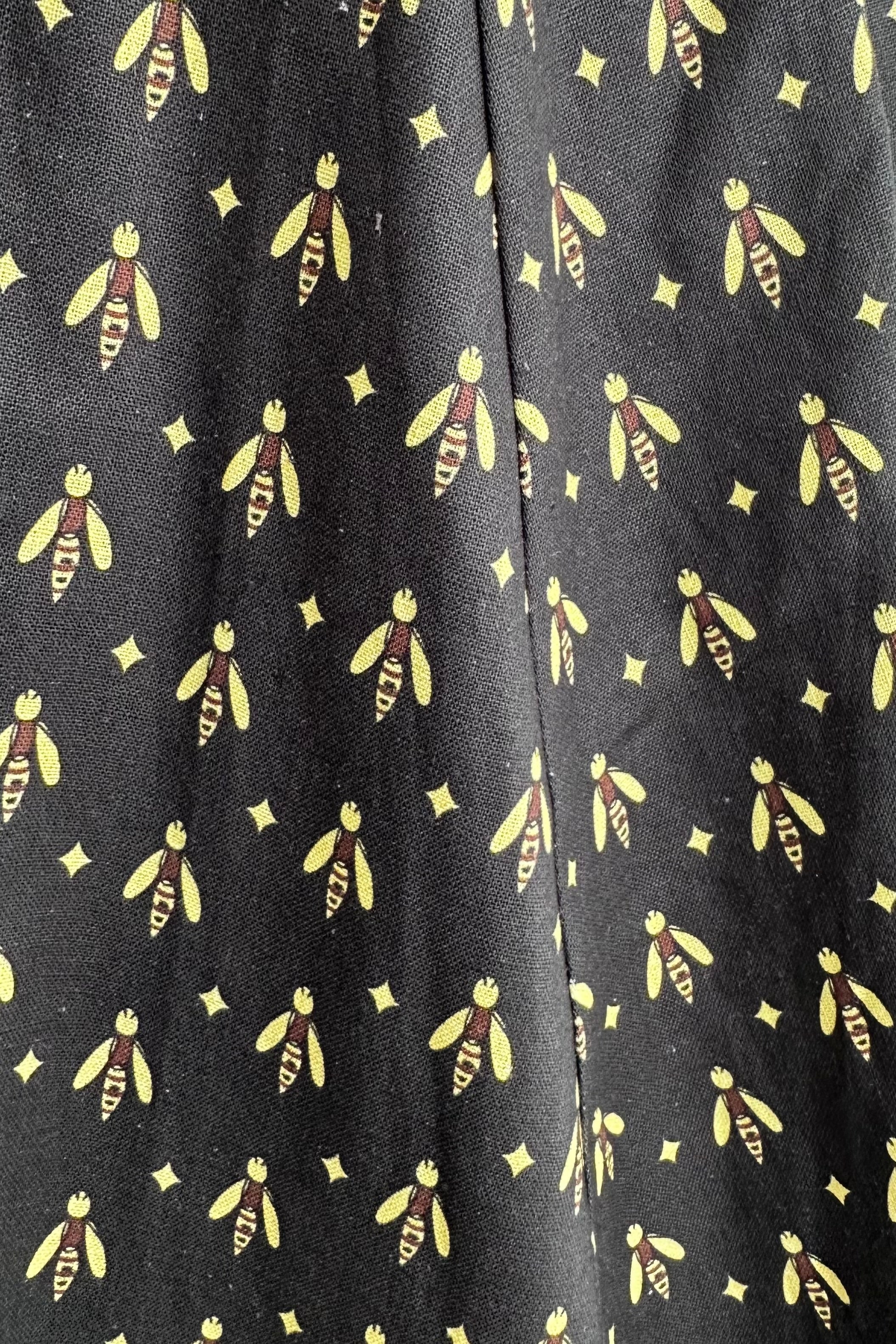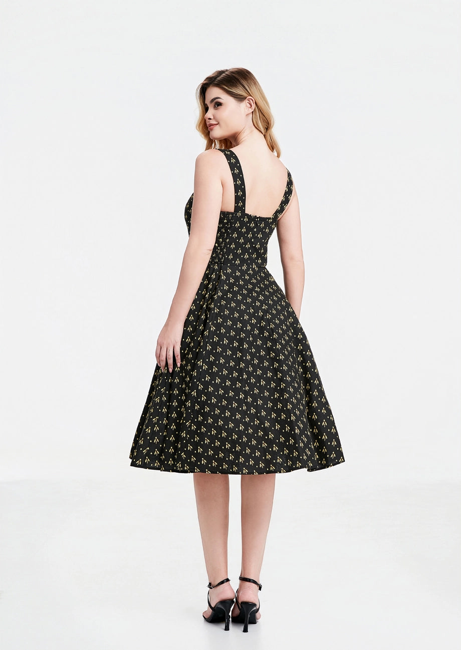 Black dress with a yellow bee print. The Heidi is a sleeveless dress with a subtle v-neckline and fixed straps. This dress has a great fit! The back bodice sides are smocked which allows ease of wear and comfort. Zips up the back, is unlined and has pockets!