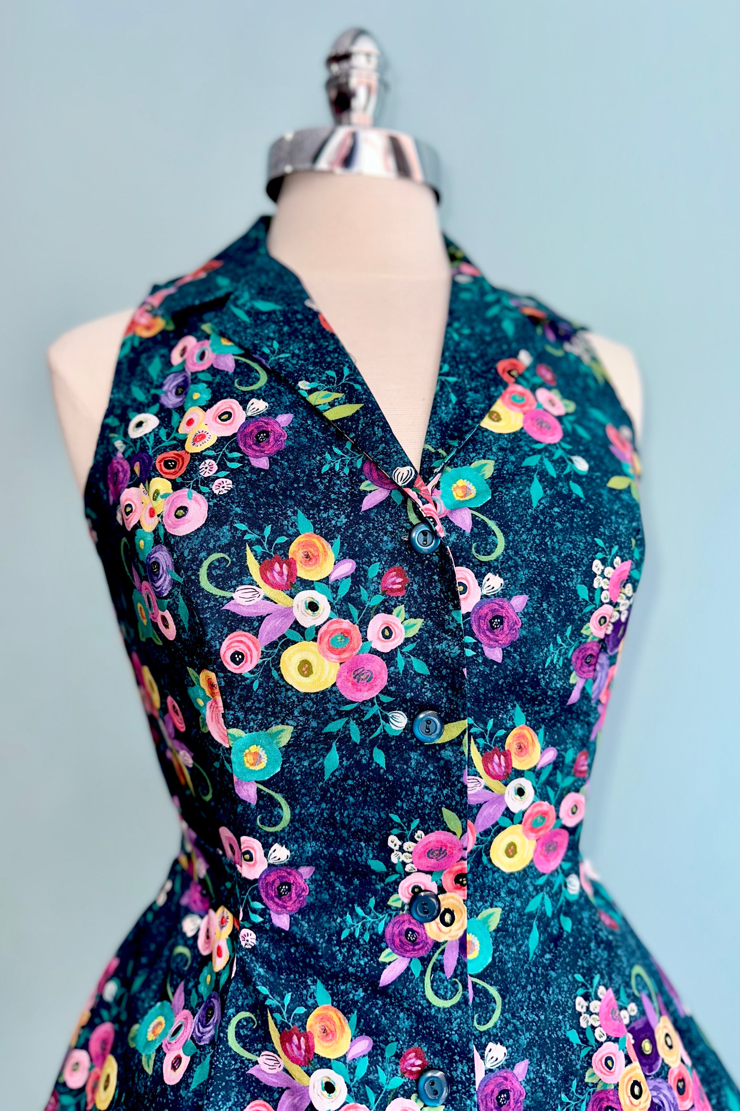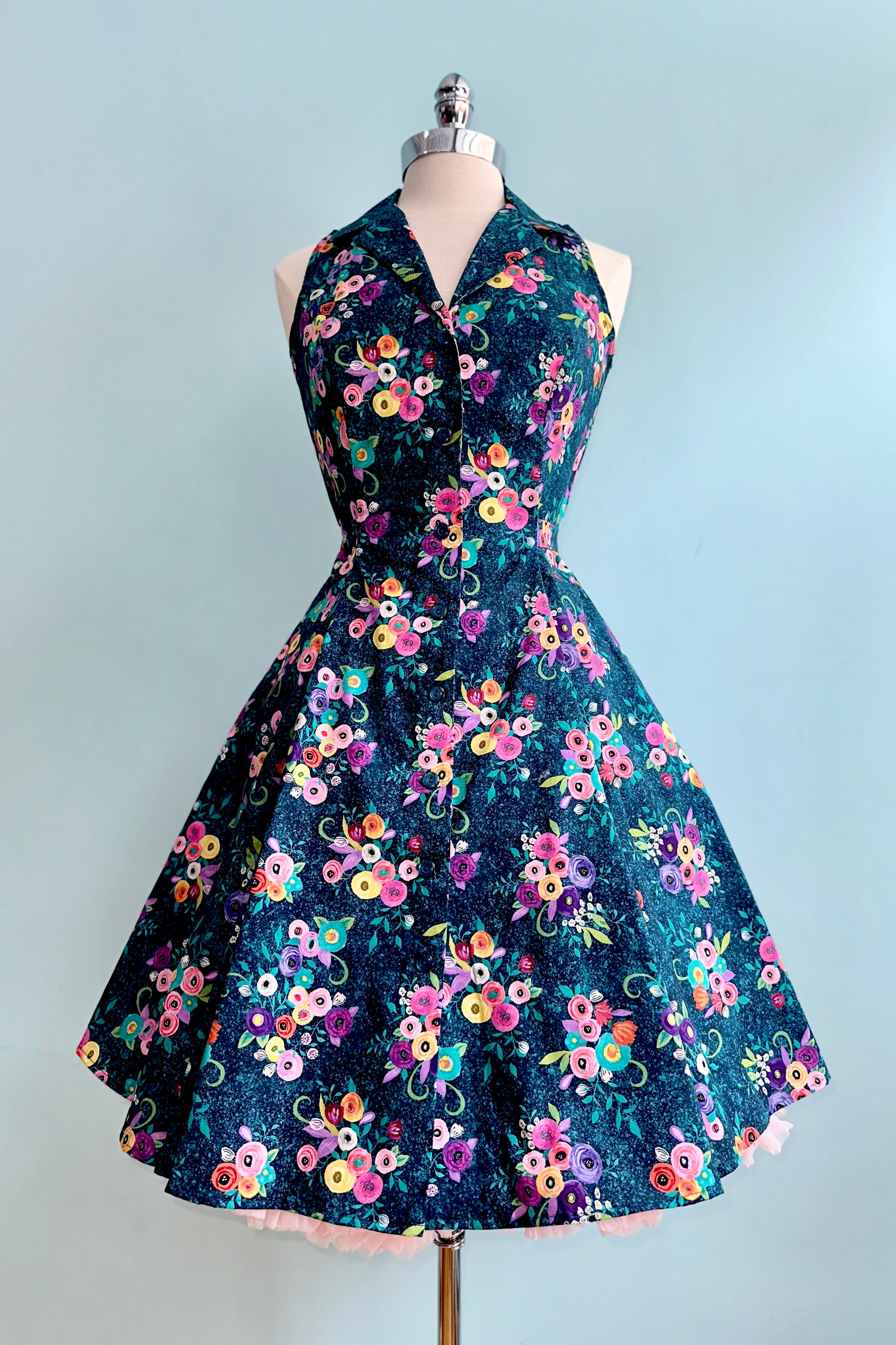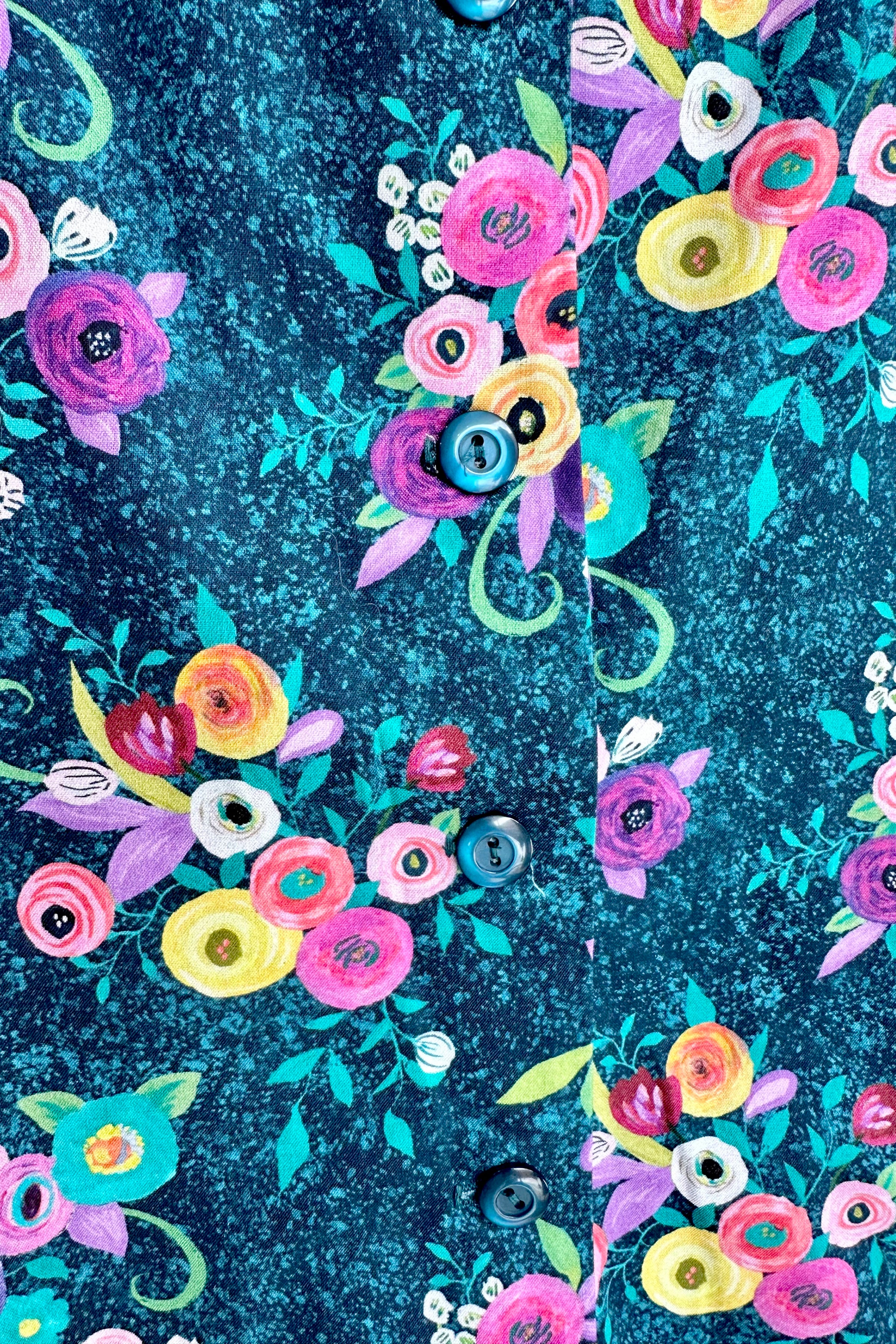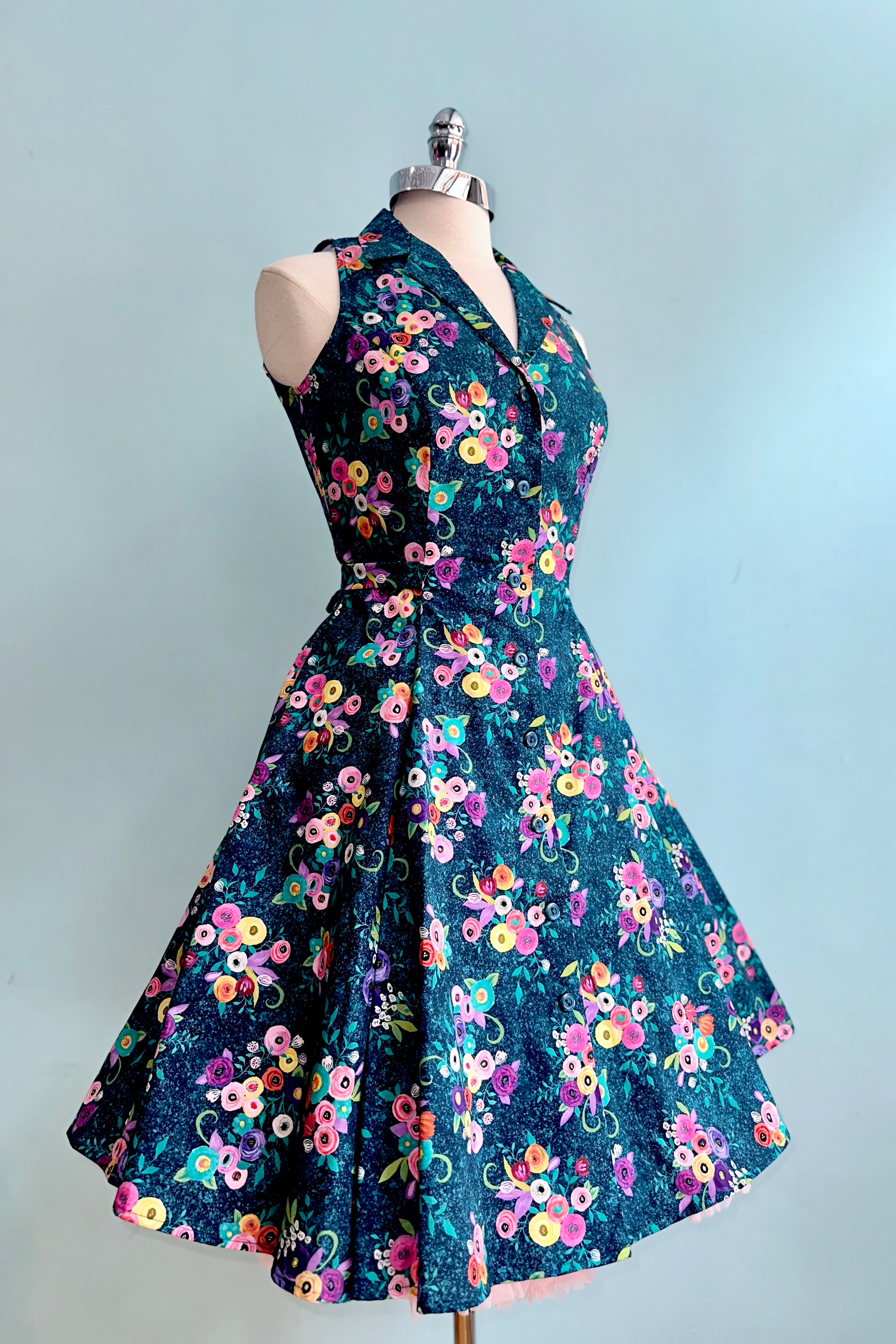 Stunning teal dress with little bold bouquets in pink and yellow. The Betty Lou dress is a sleeveless, true shirtwaist style that buttons up the front and has a fold down collar. Made of 100% cotton right here in the USA. The skirt is composed of 6 panels for fullness and has hidden side pockets. There is an attached belt to fasten in the back or front. This dress is not lined.