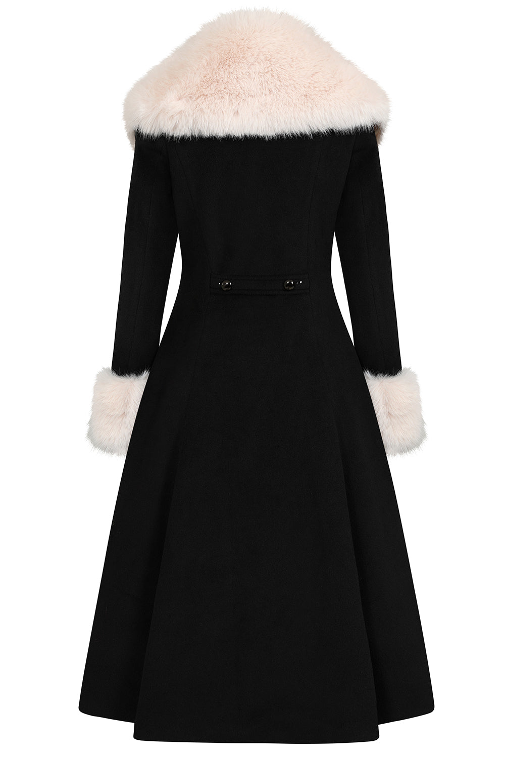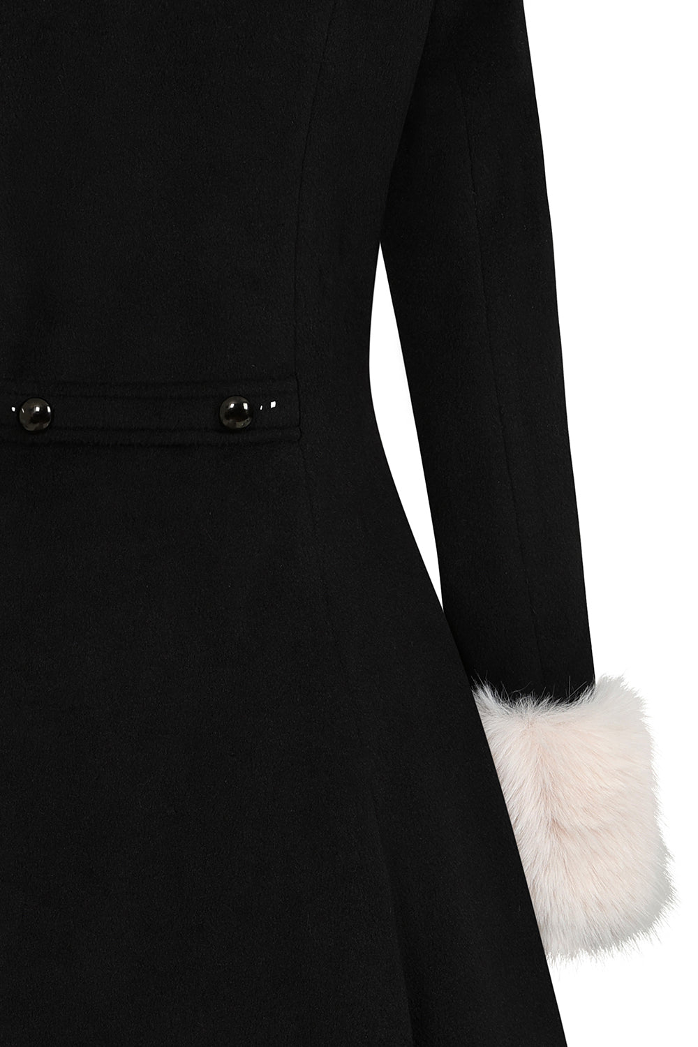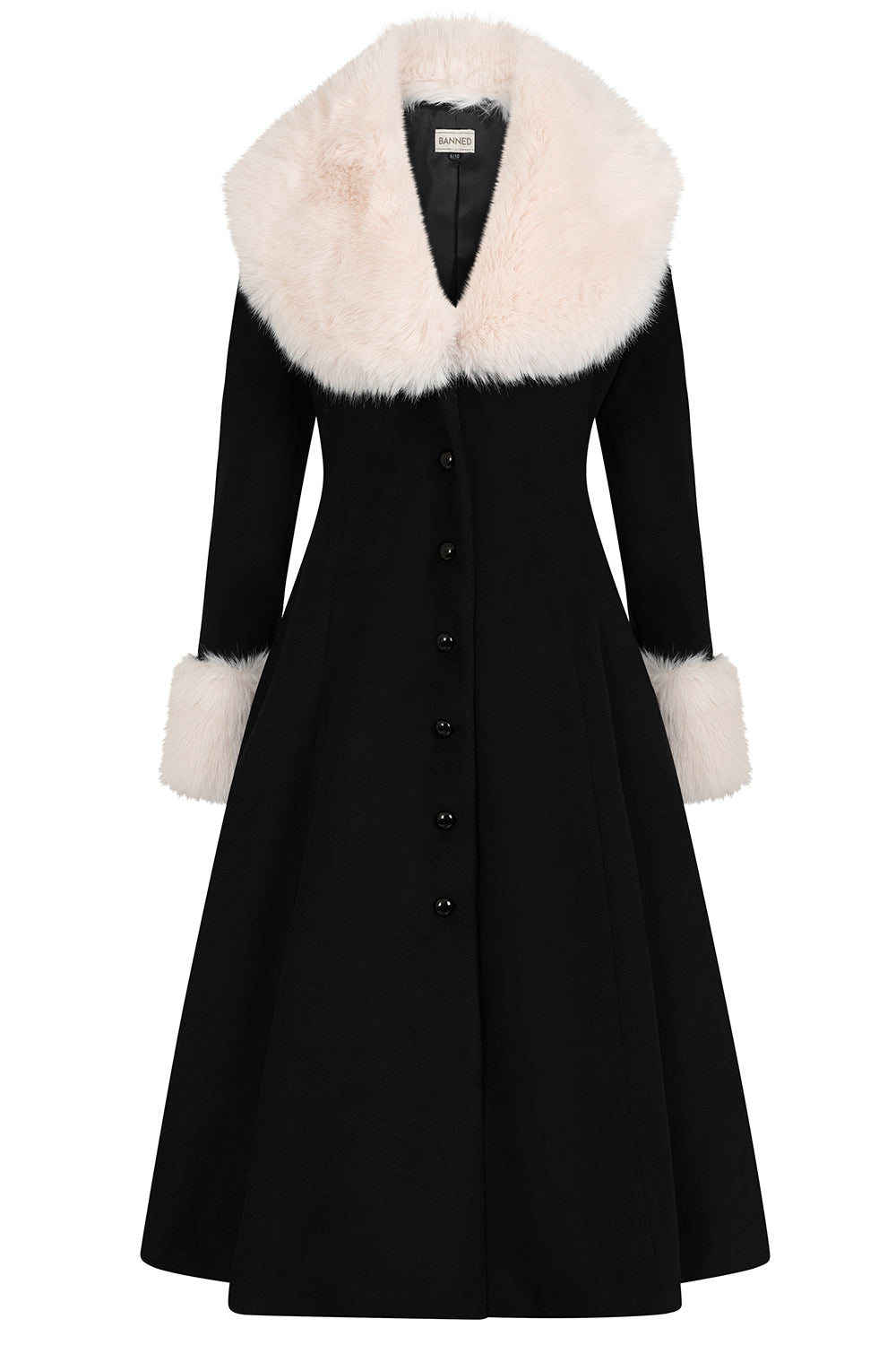 50s-inspired swing coat featuring luxurious contrast faux fur collar and cuffs. Perfect vintage outerwear combining classic silhouette with faux fur trim.