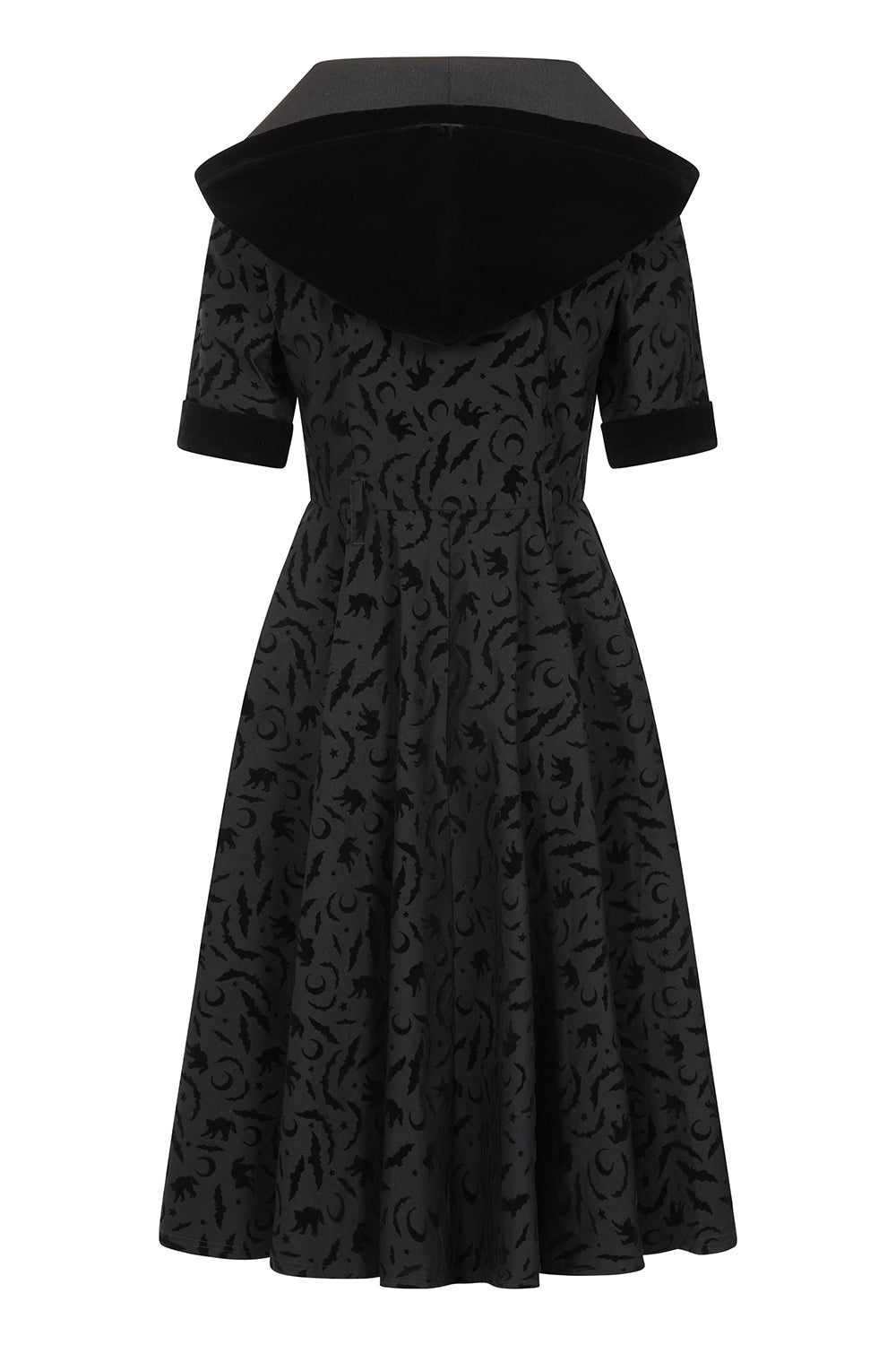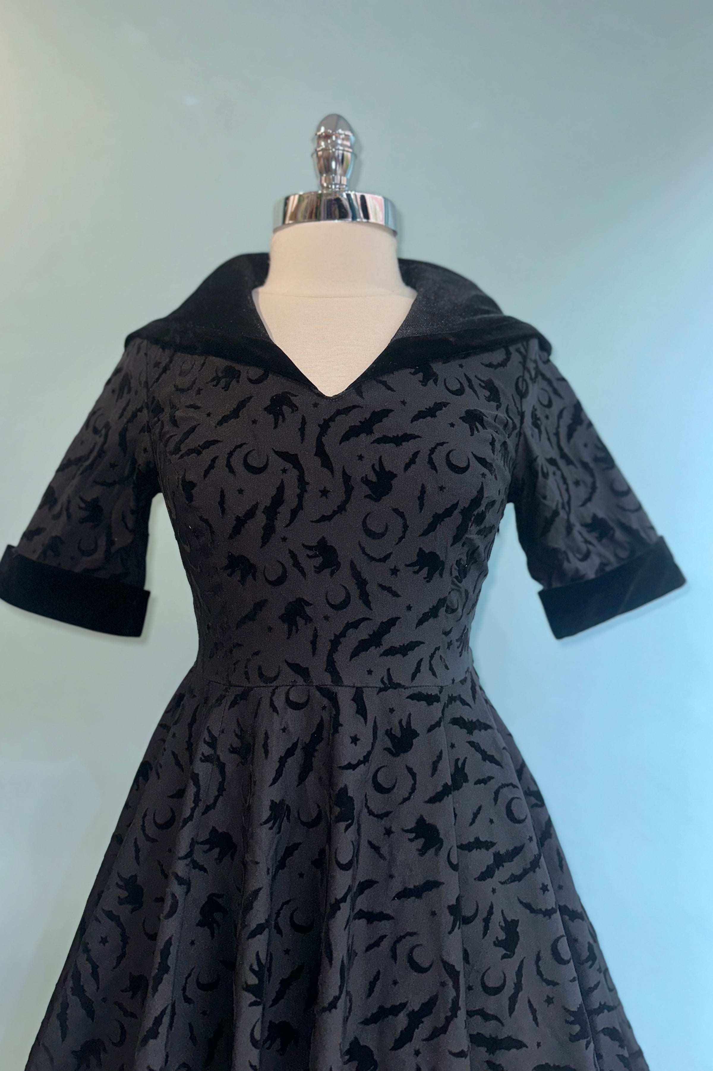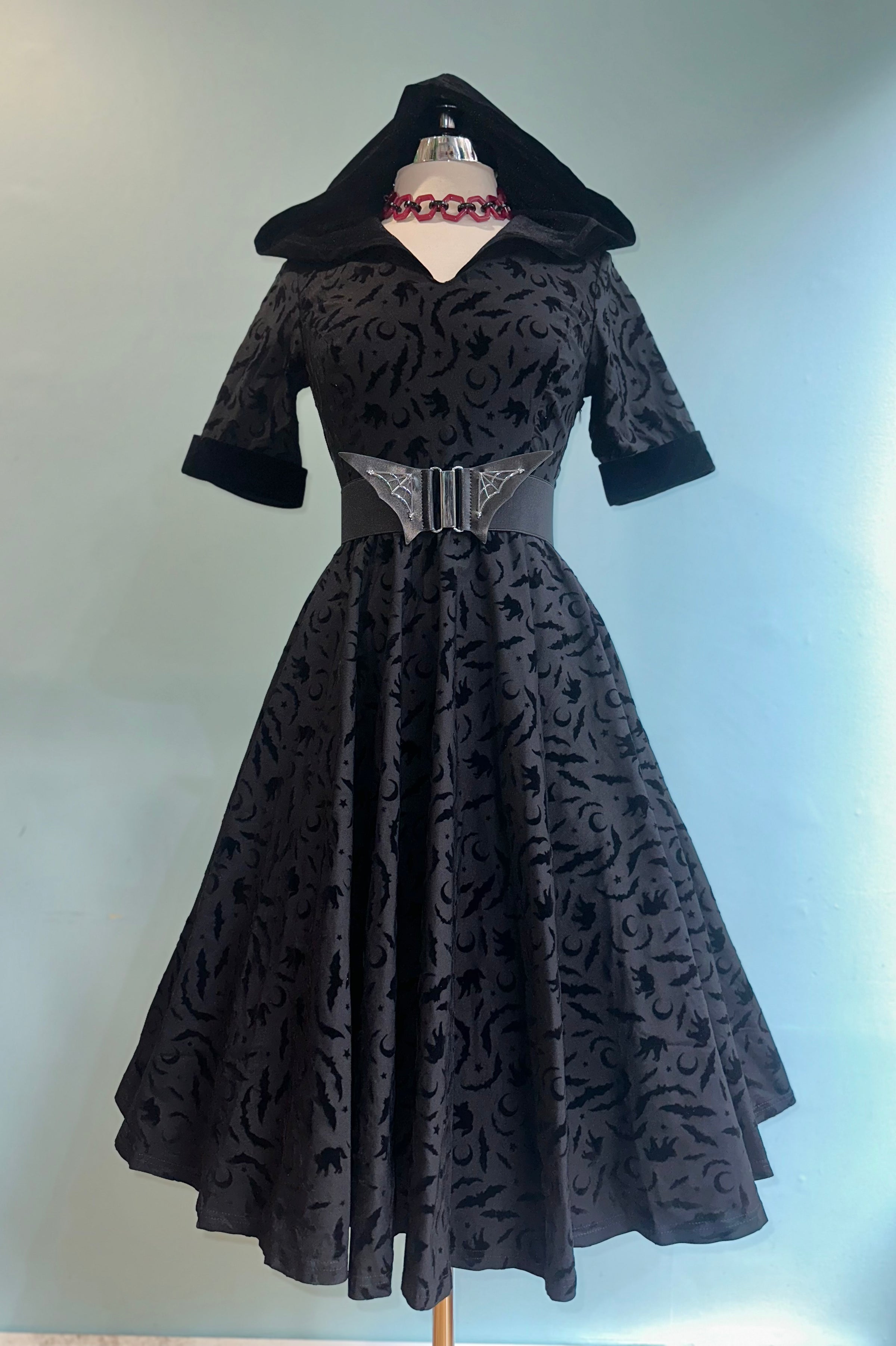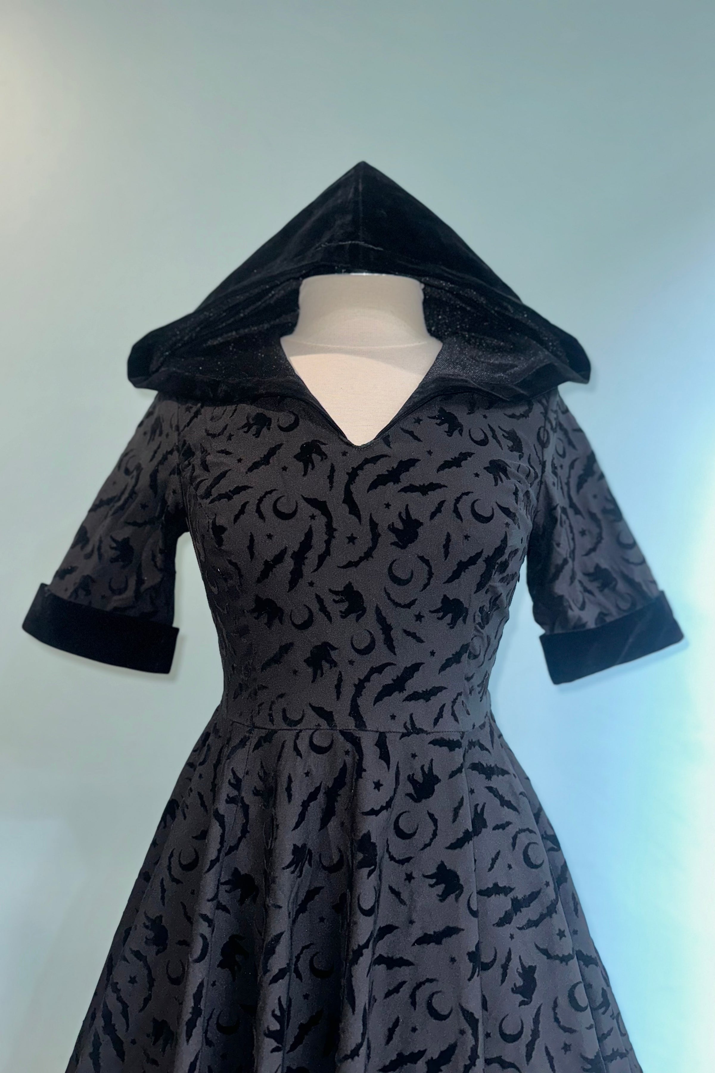 A 50s-inspired swing dress featuring a full-circle skirt, 3/4 sleeves, and a contrast hood, cuffs, and belt. Made from luxurious velvet in a bespoke Halloween flock design, it also includes convenient pockets for added style and functionality.