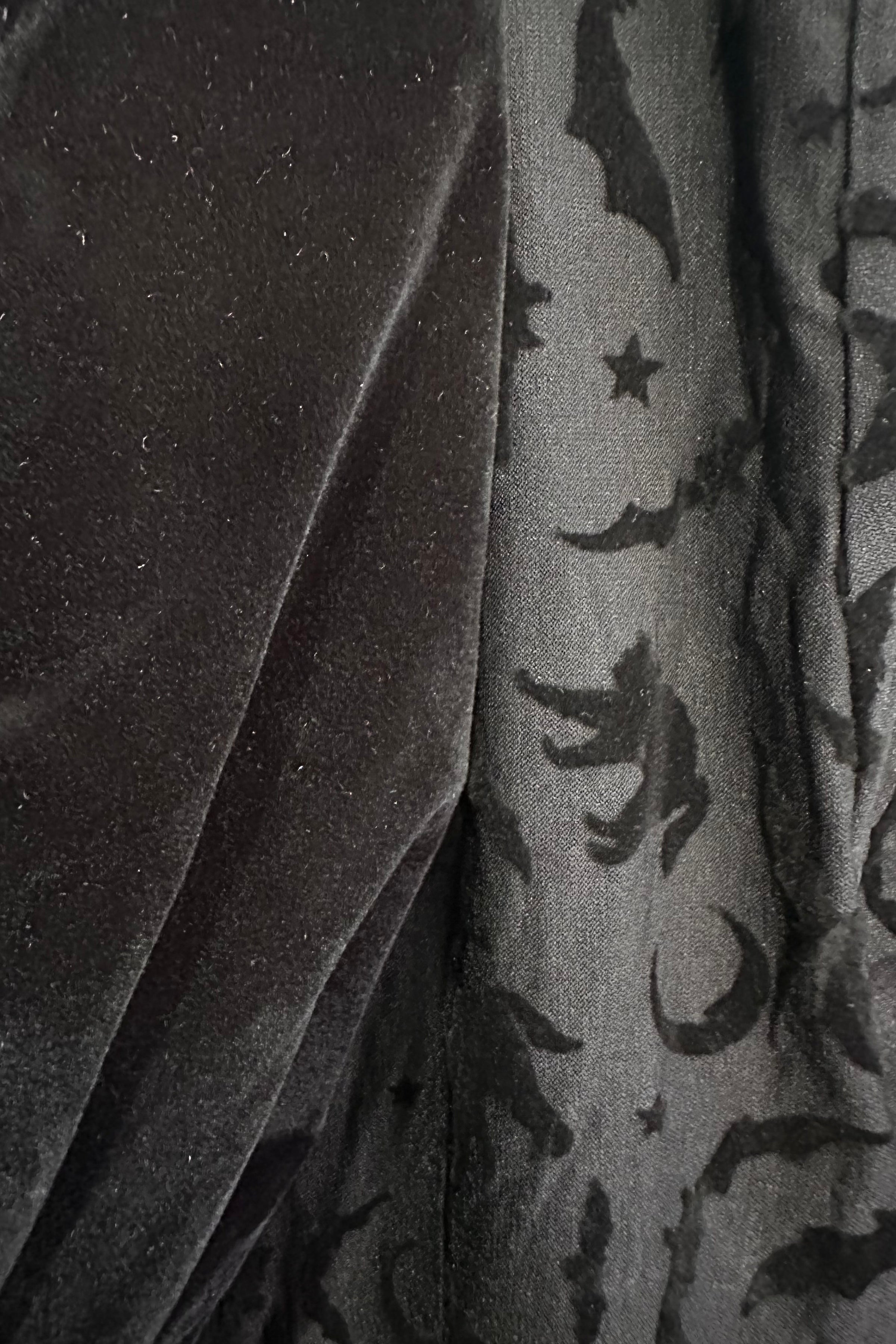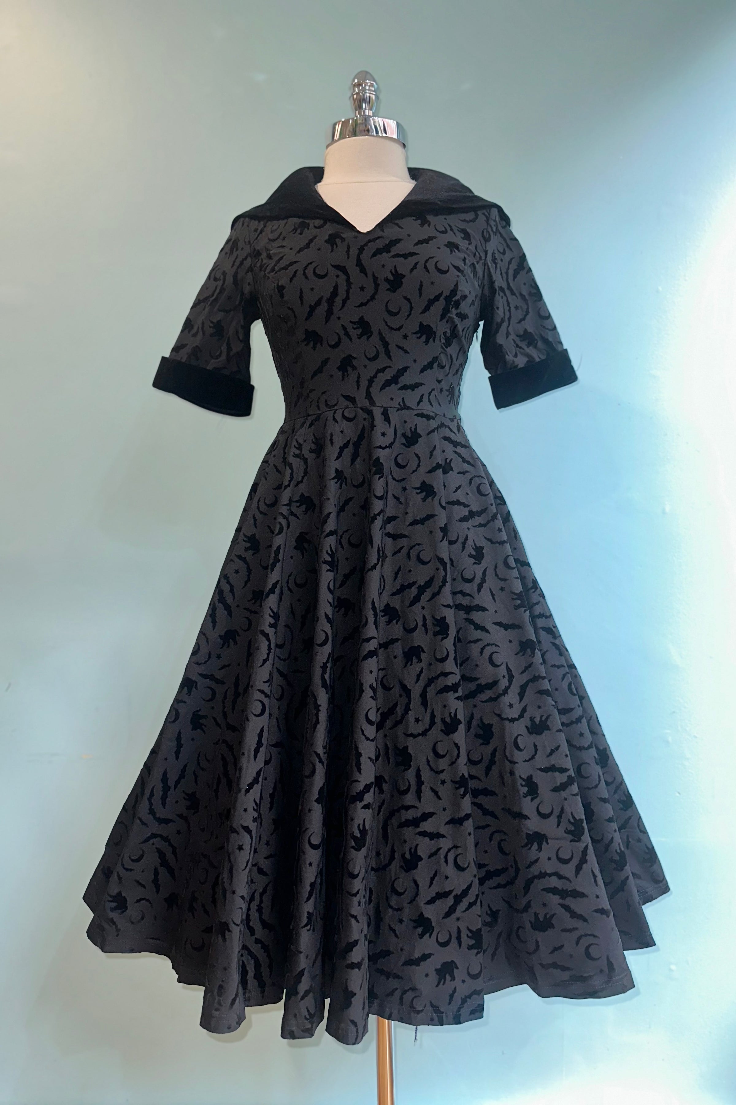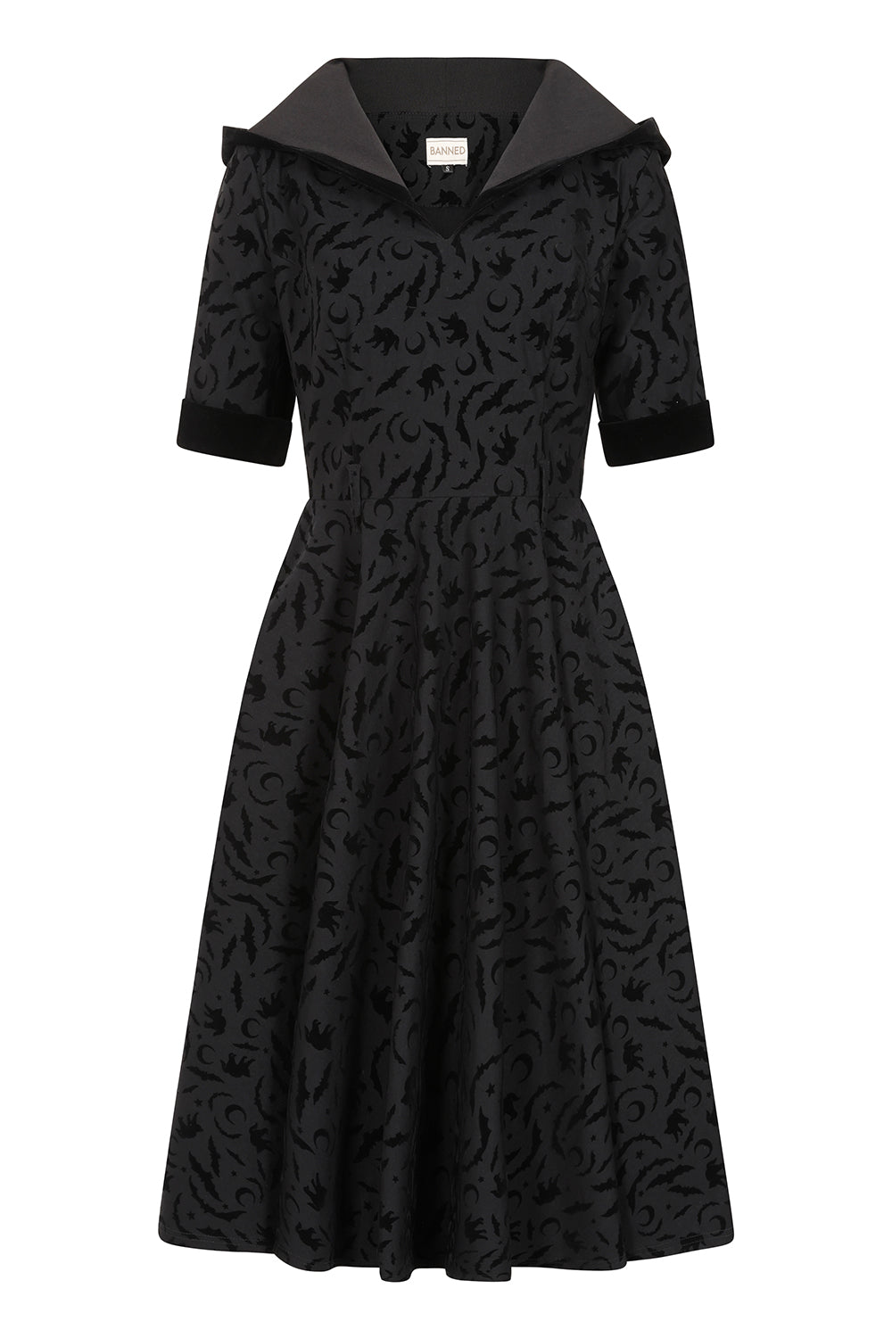 A 50s-inspired swing dress featuring a full-circle skirt, 3/4 sleeves, and a contrast hood, cuffs, and belt. Made from luxurious velvet in a bespoke Halloween flock design, it also includes convenient pockets for added style and functionality.