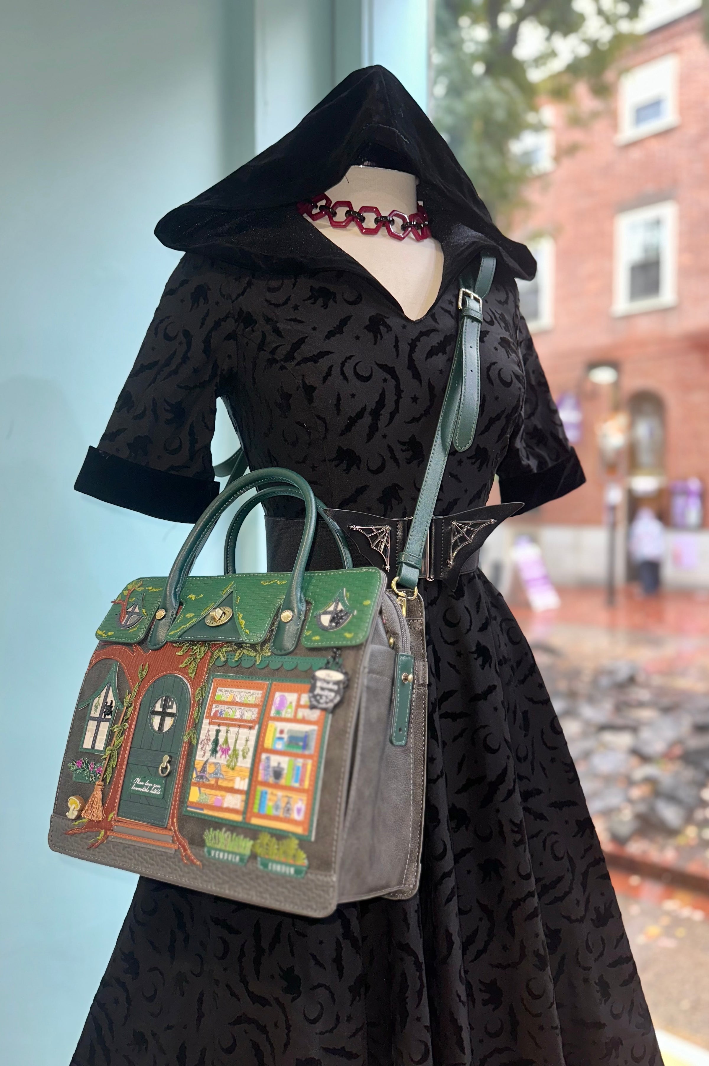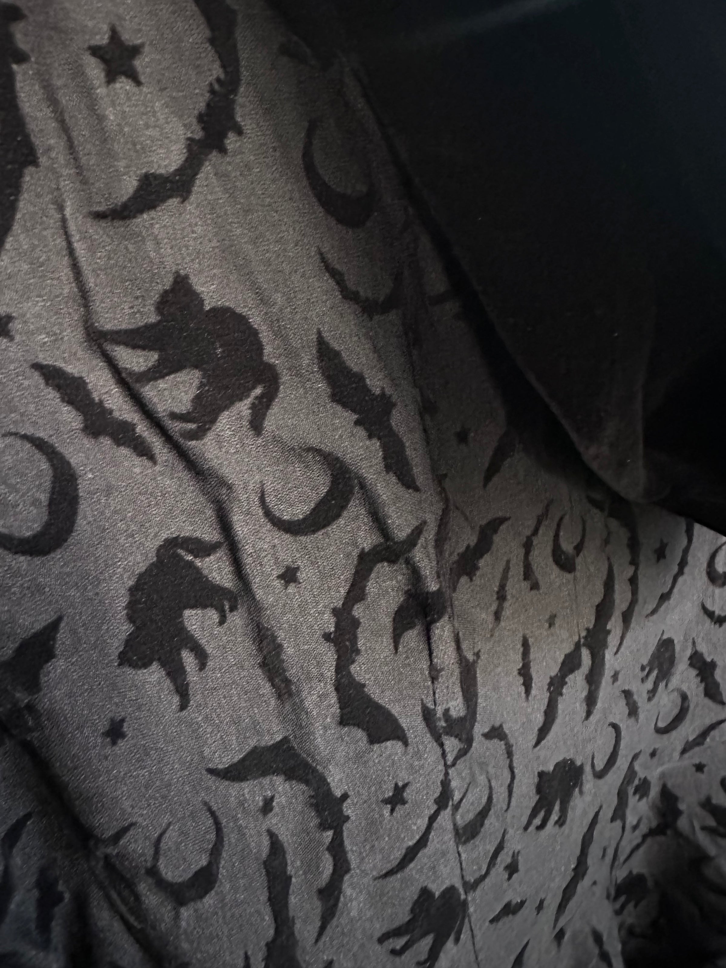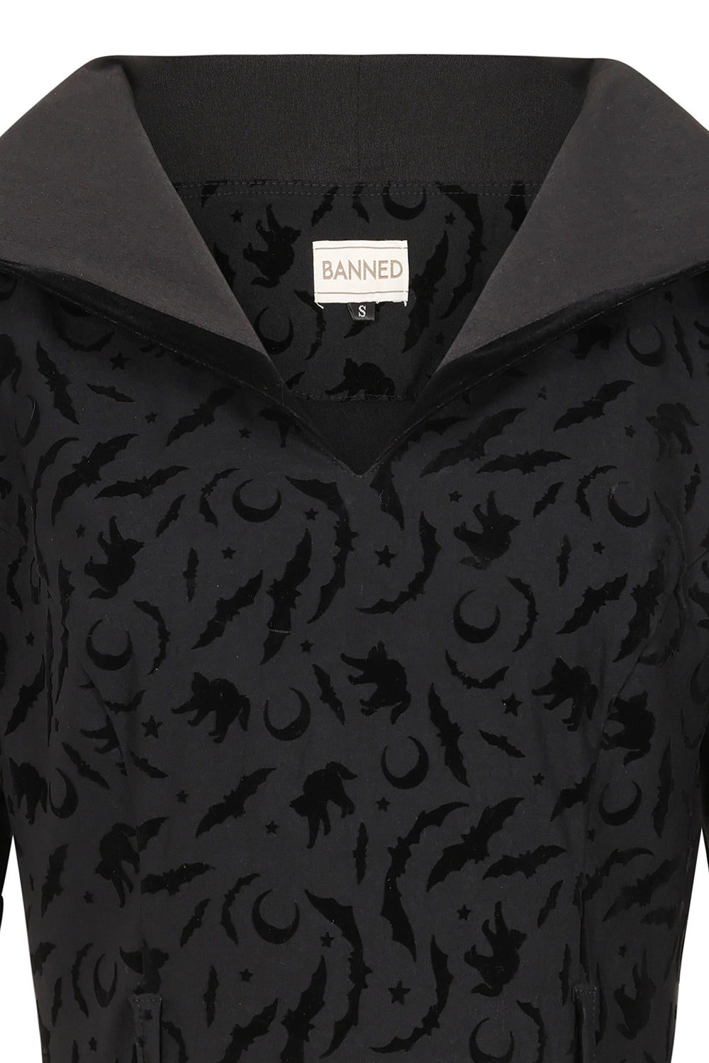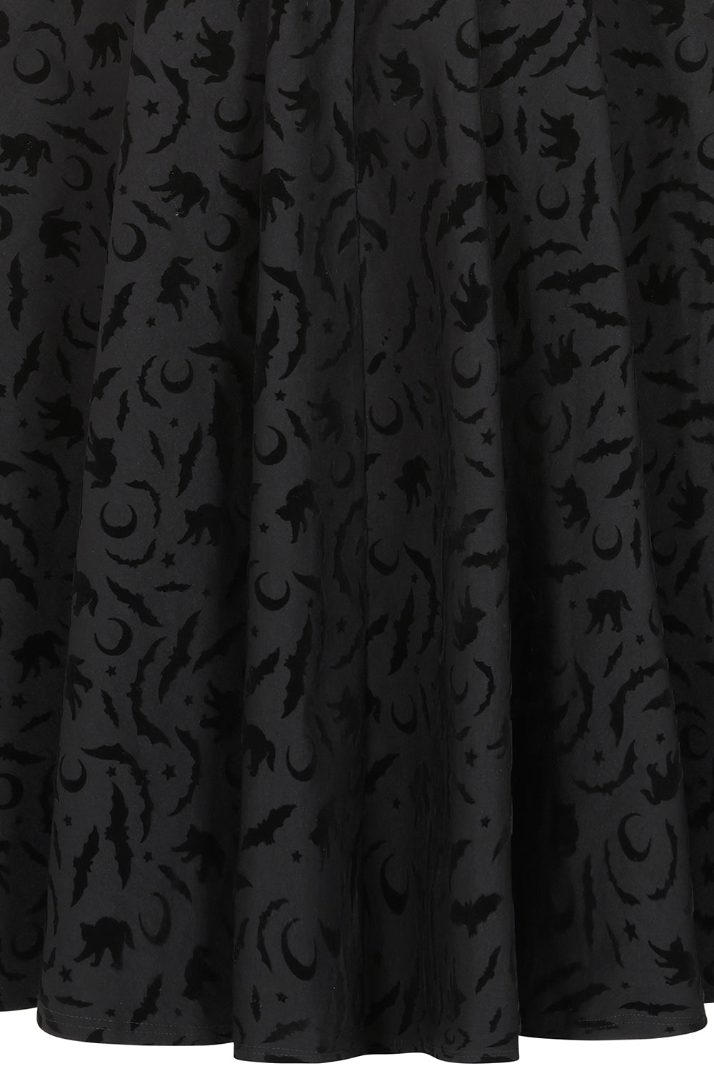 A 50s-inspired swing dress featuring a full-circle skirt, 3/4 sleeves, and a contrast hood, cuffs, and belt. Made from luxurious velvet in a bespoke Halloween flock design, it also includes convenient pockets for added style and functionality.