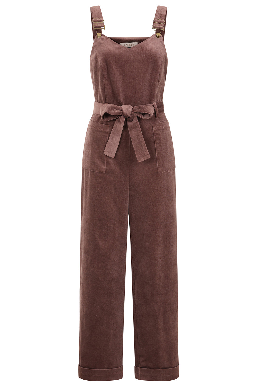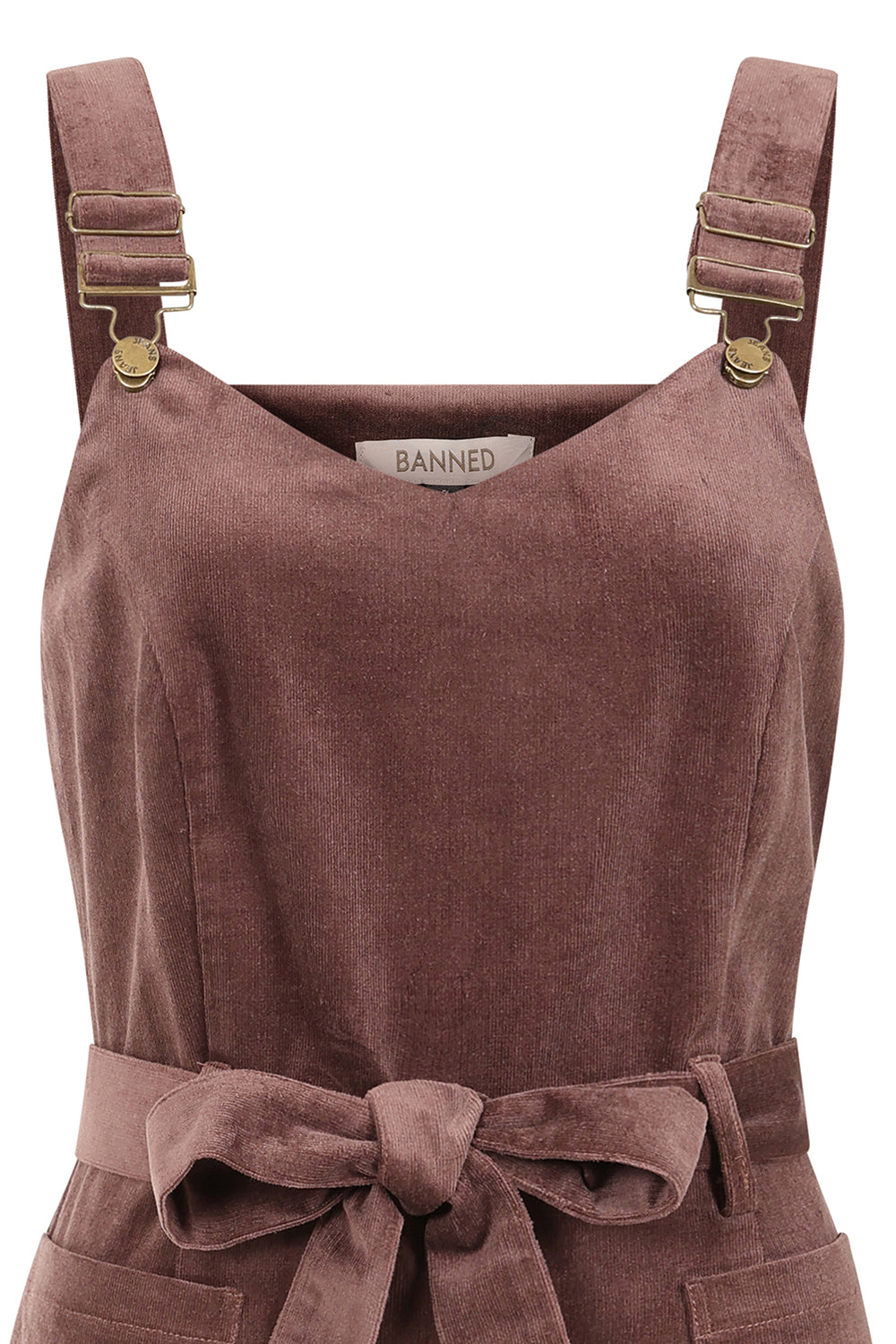 Brown corduroy jumpsuit with adjustable straps and a waist tie. There are front and back pockets.