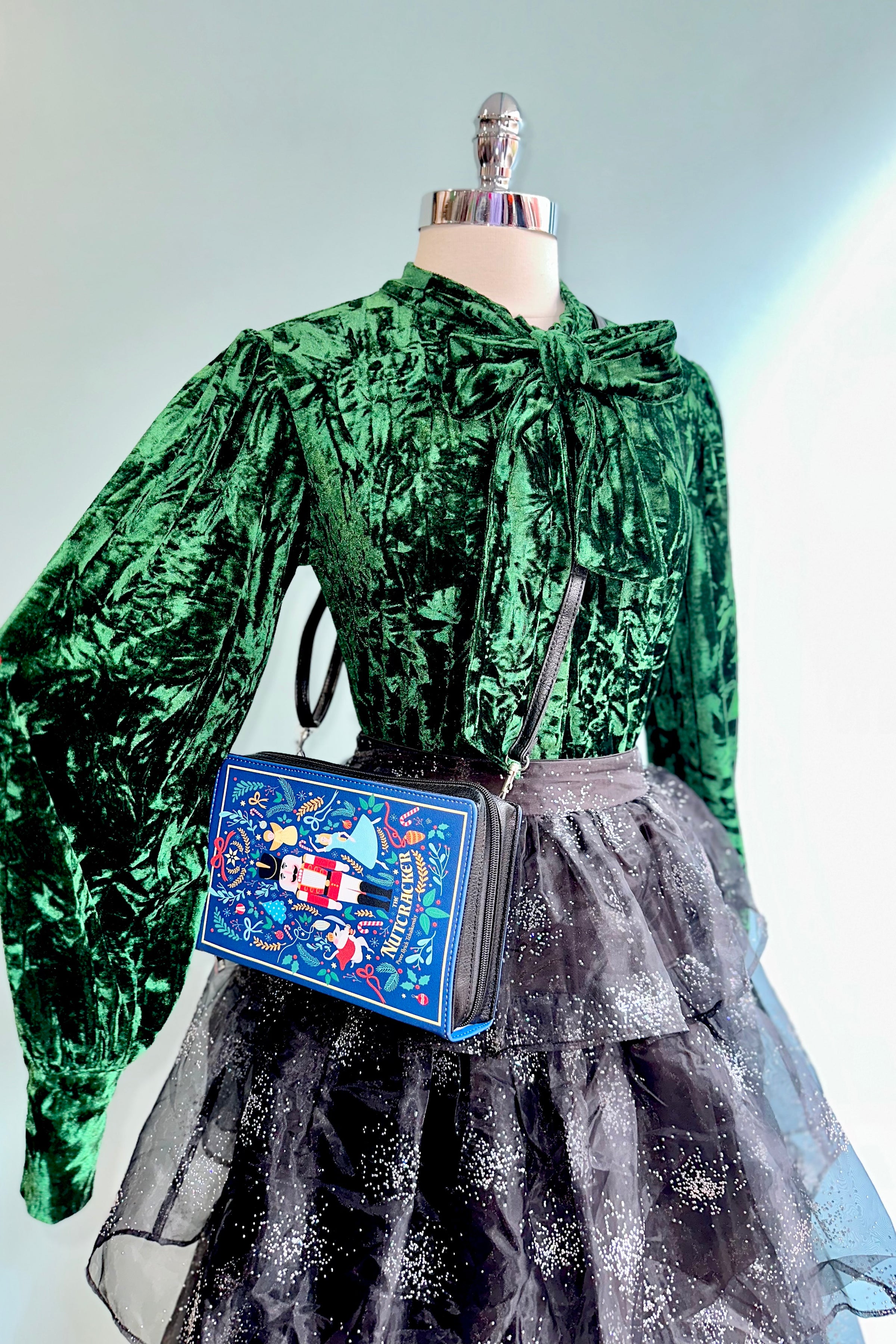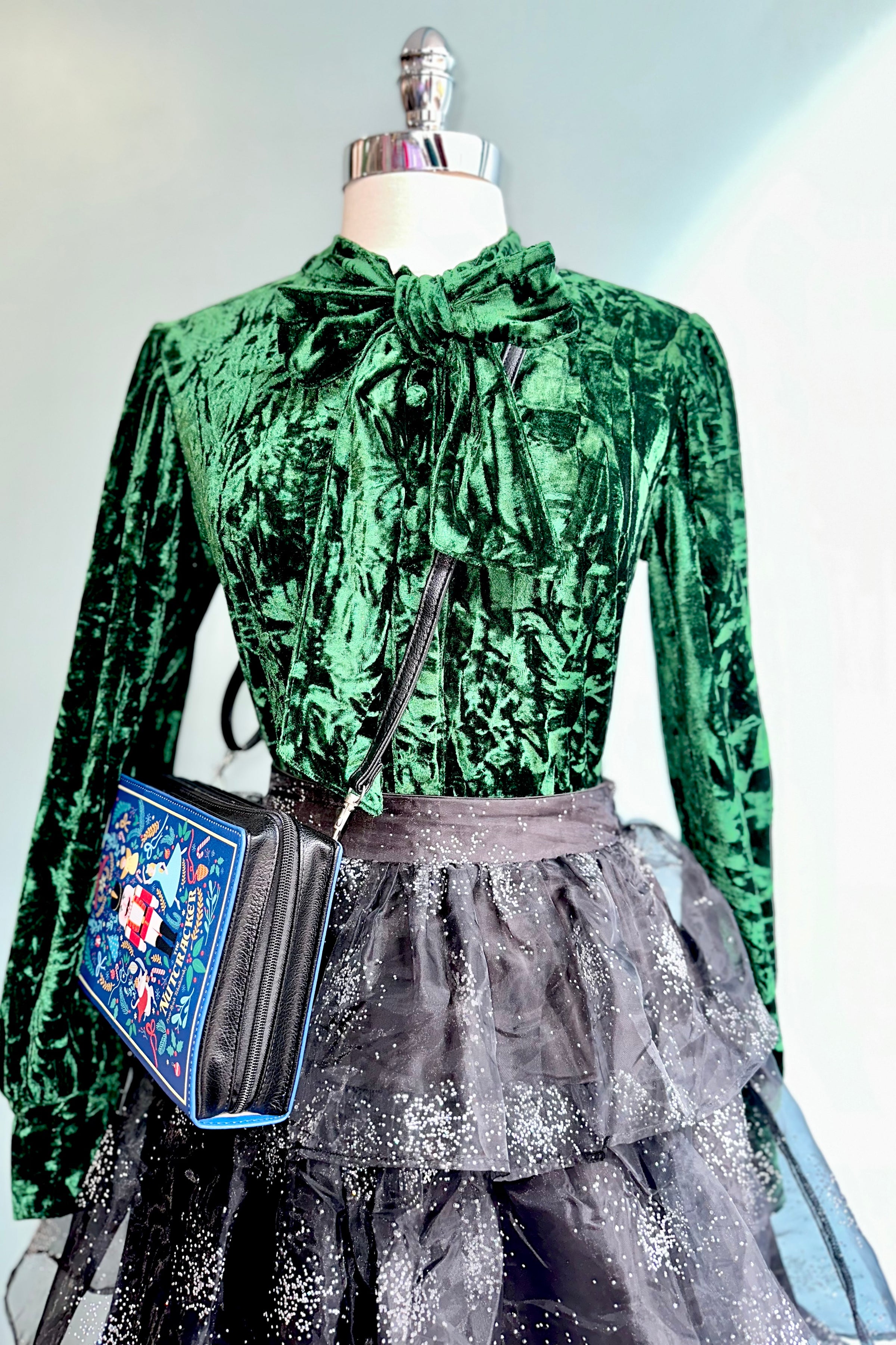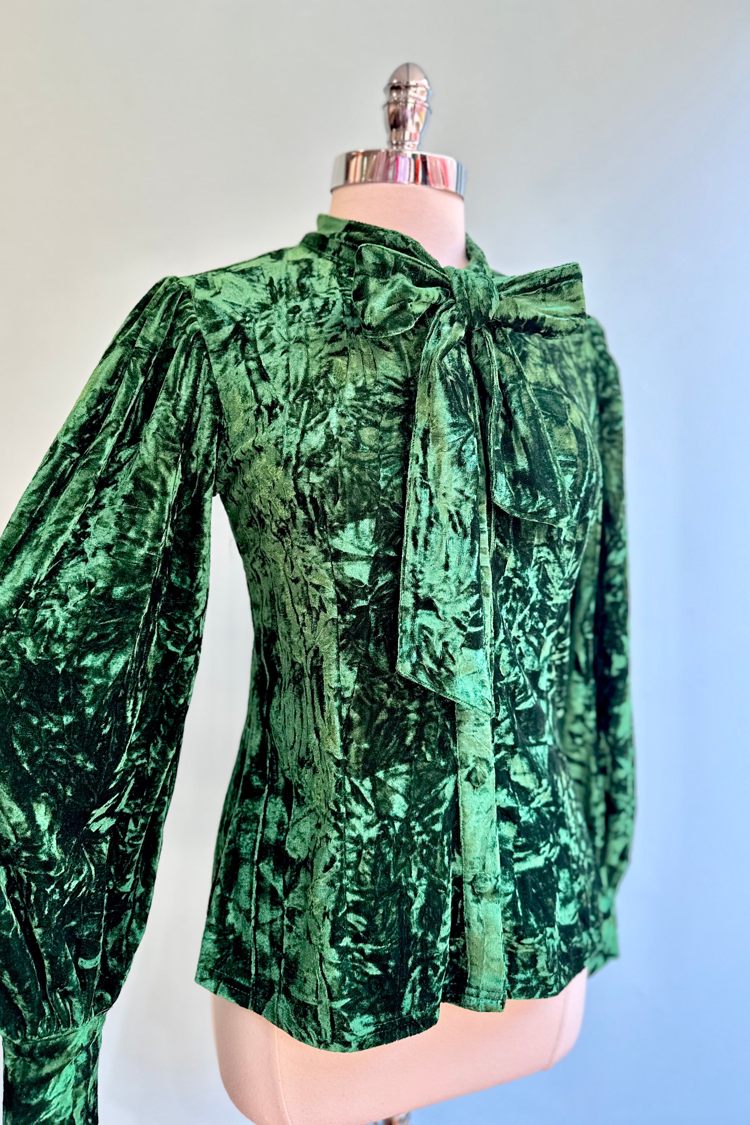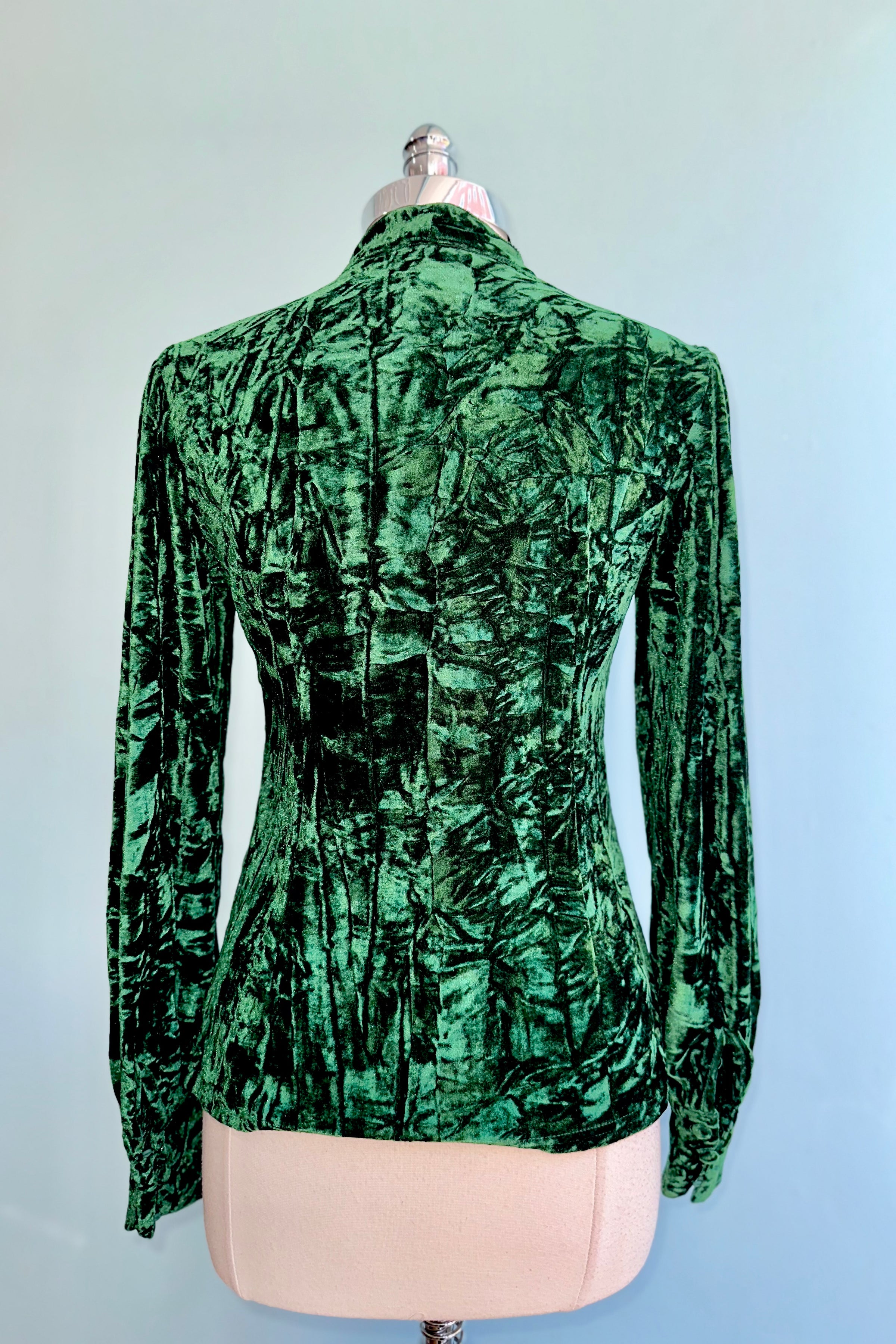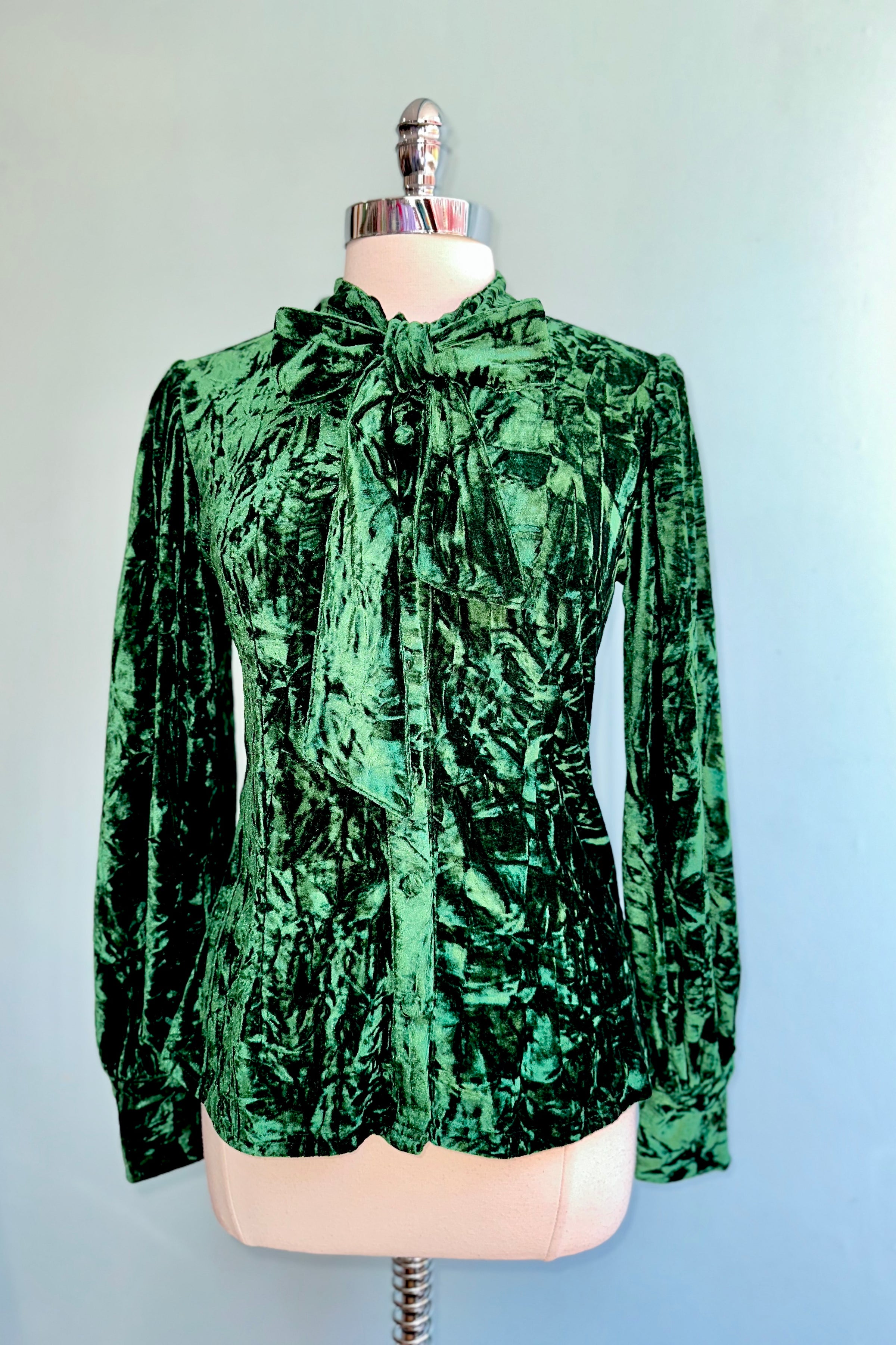 Velvet top in a beautiful holiday green. This top buttons up the front and has a tie neck at the top. The sleeves are full and fasten at the wrist with buttons. We love to layer the Gwen tops but this beauty will be perfect with skirts and trousers we well!