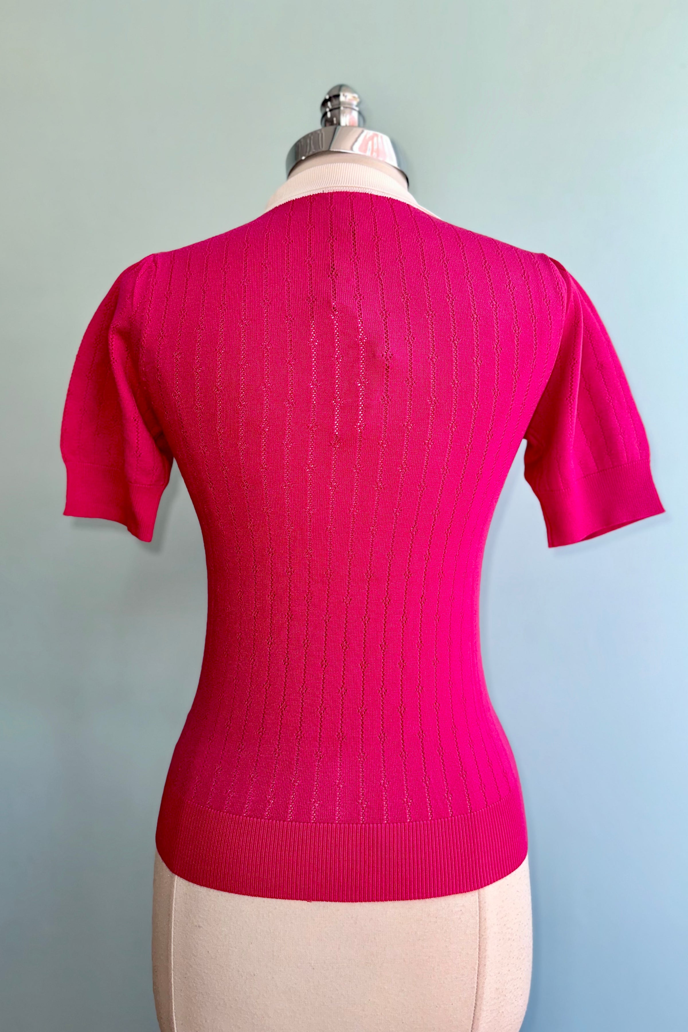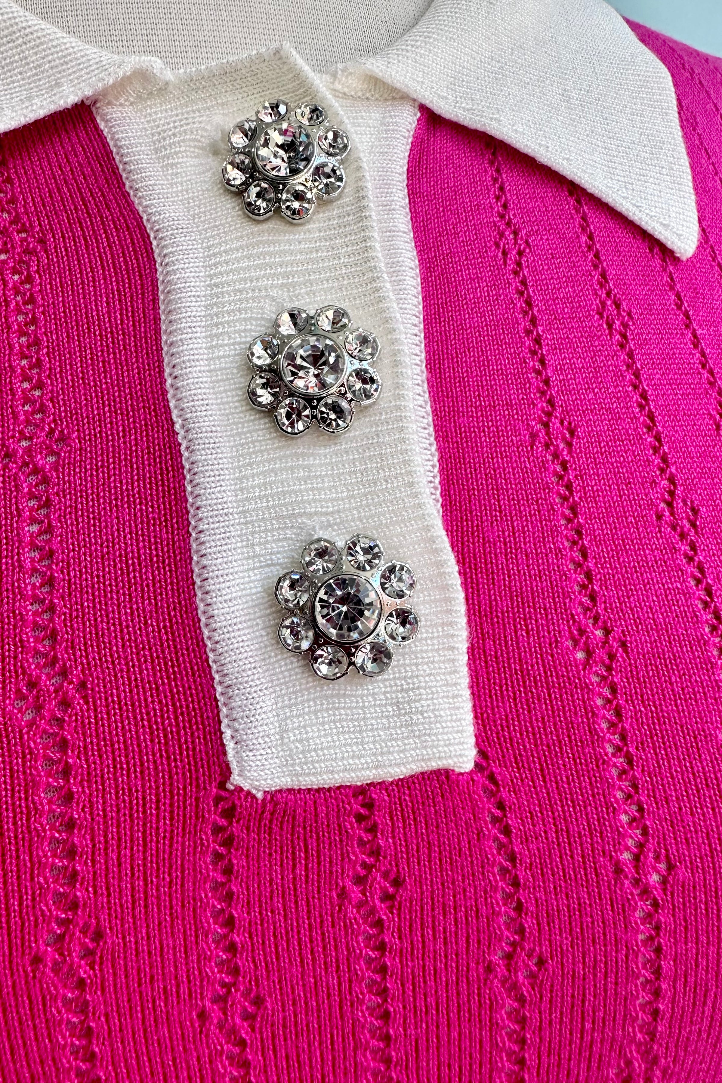 Hot Pink Short Sleeve Pointelle Sweater with Rhinestone Buttons