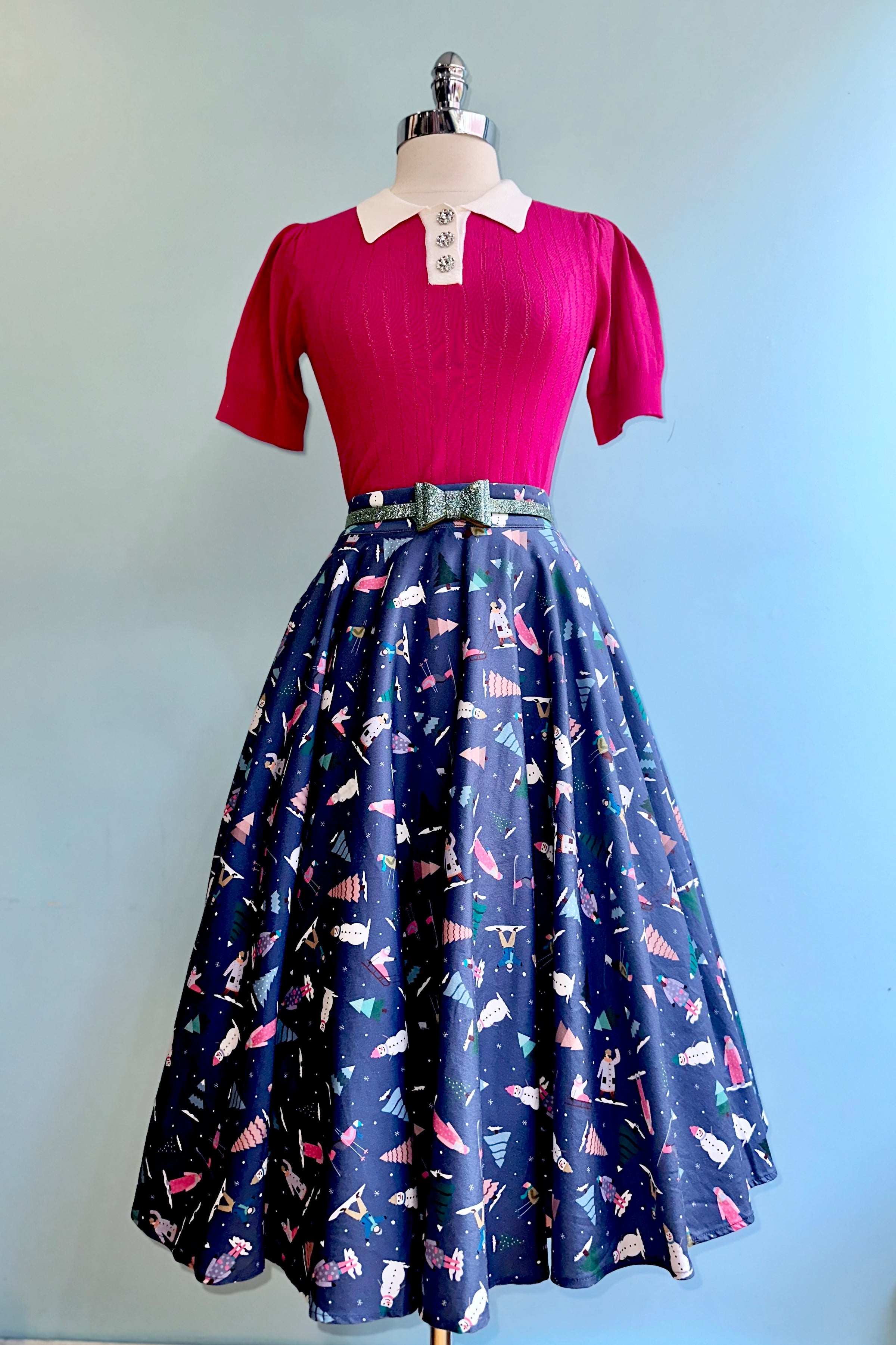 Pullover sweater in hot pink with an ivory fold over collar. There are three decorative rhinestone flower buttons at the neckline. Soft and stretchy lighter weight sweater in a perforated stretch knit.