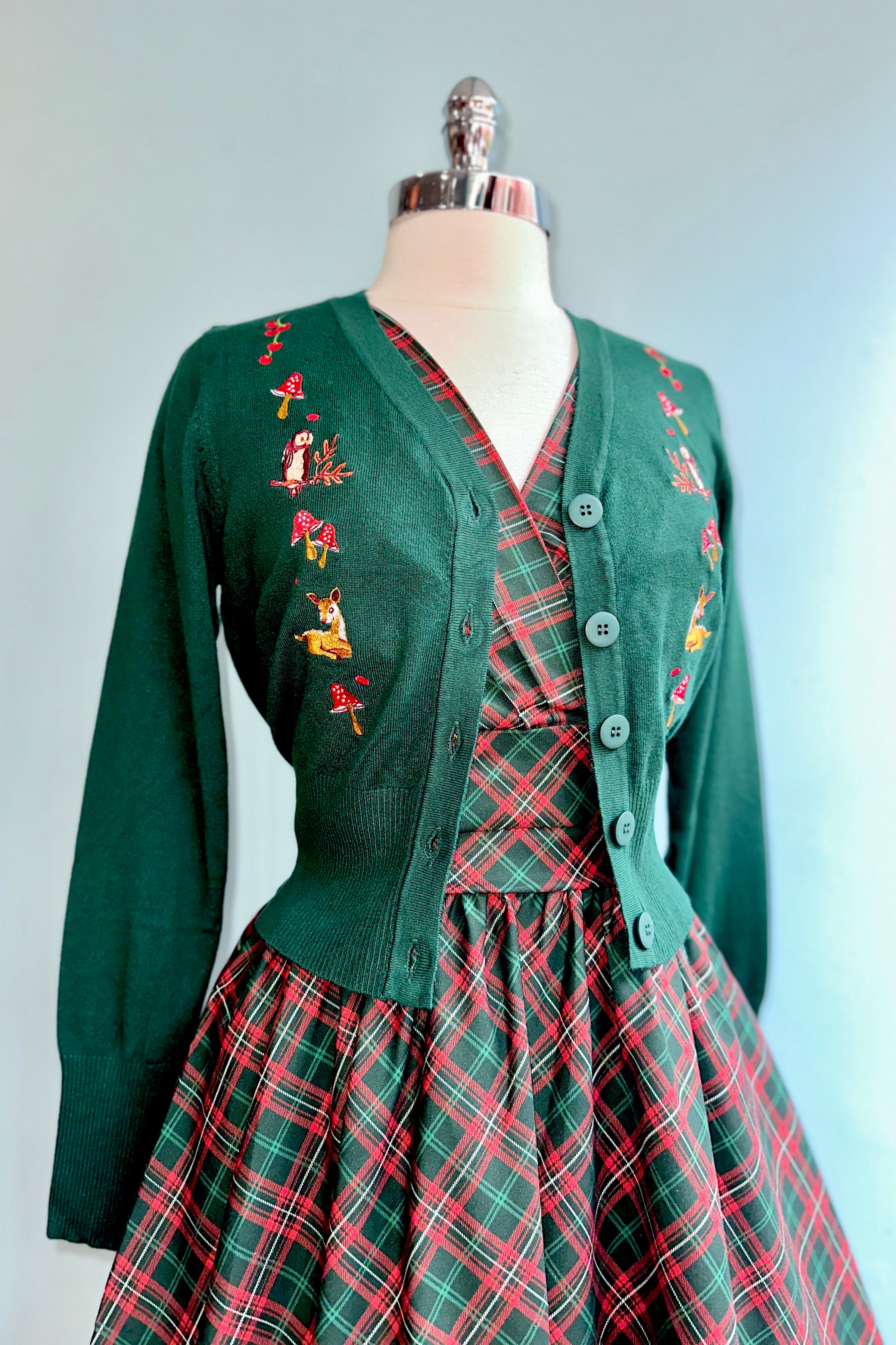 Forest green cardigan with rows of embroidered mushrooms, deer and owls. This is a cropped, long sleeve and V-neck style.