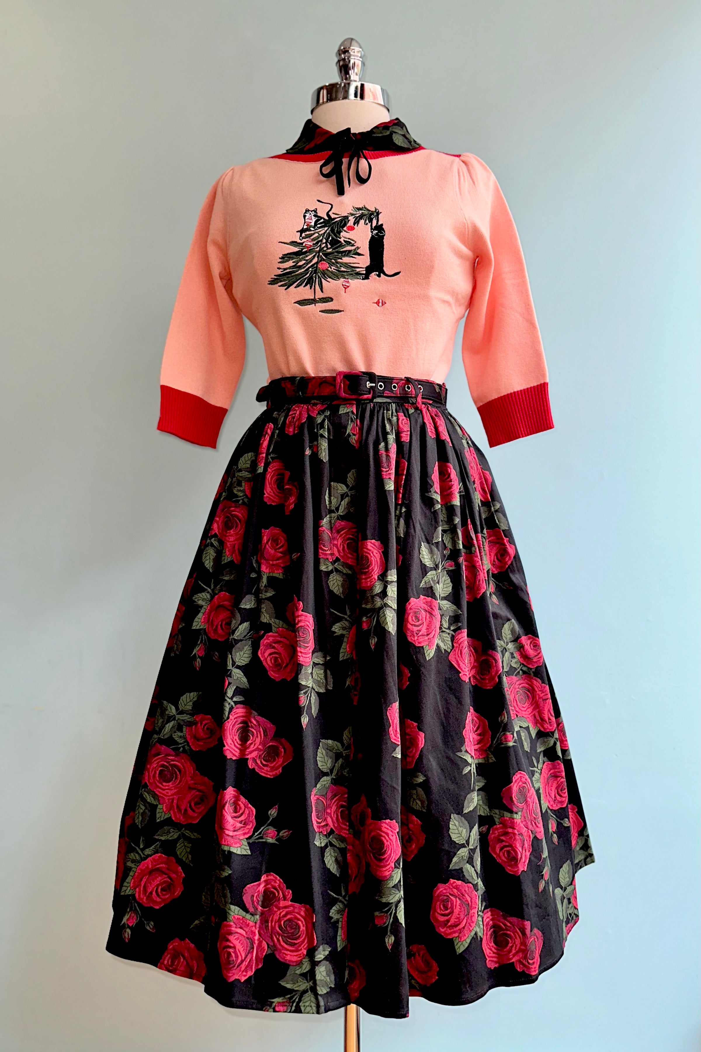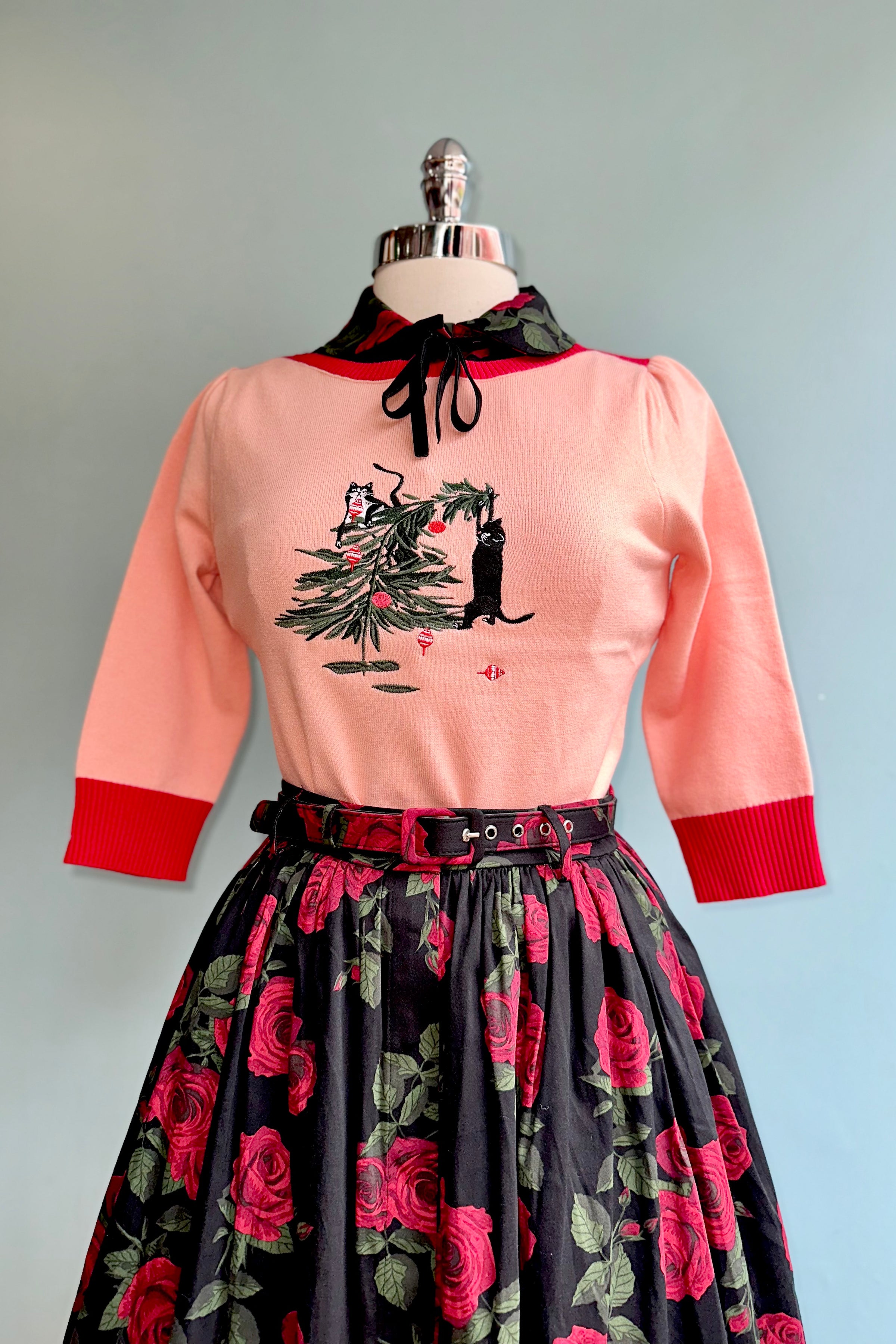 Holiday sweater in pink with red trim and an embroidered scene in the bodice center of mischievous kitties and a Christmas tree! This sweater has a little gathering at the shoulder and is a fitted style.
